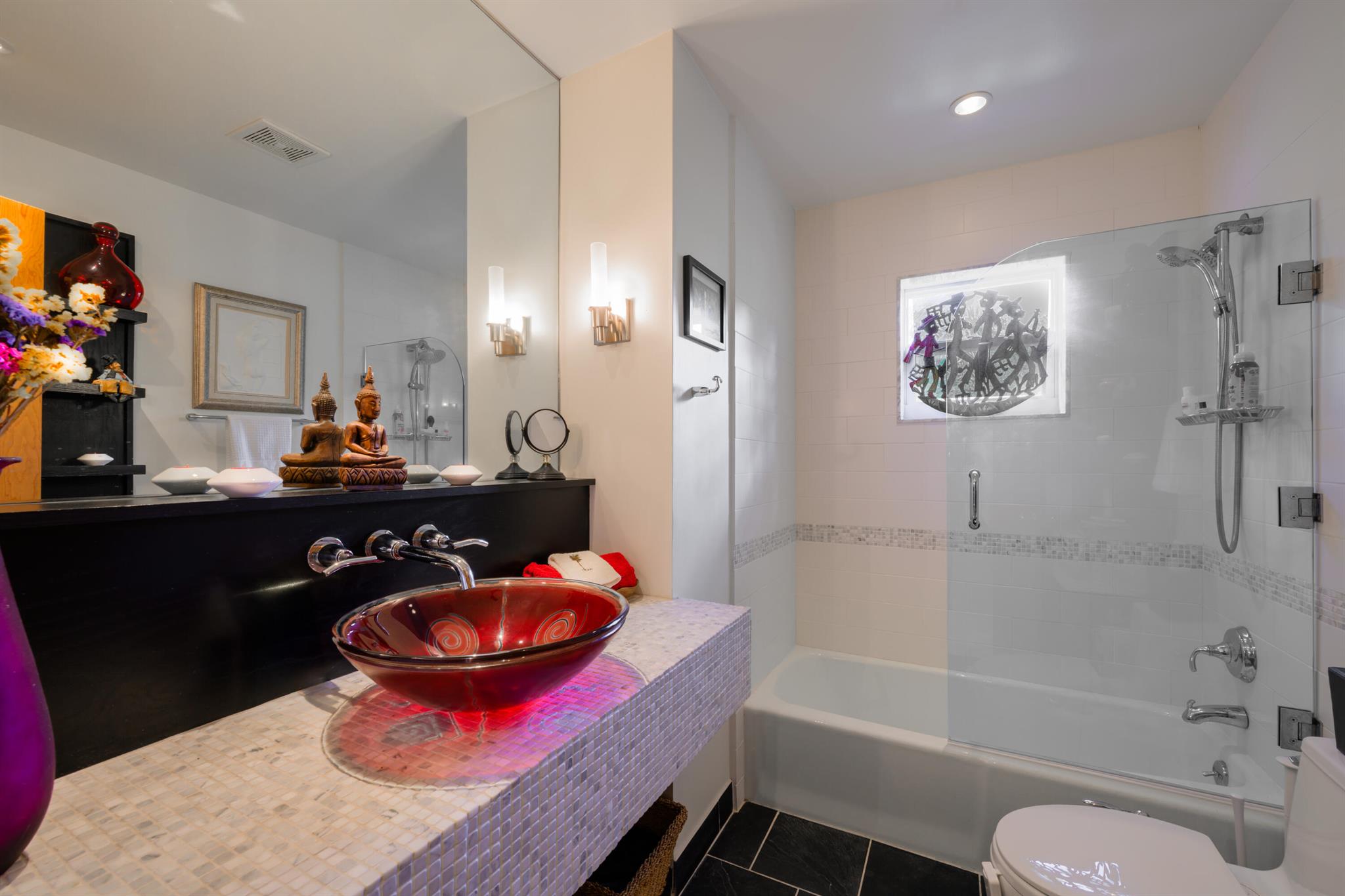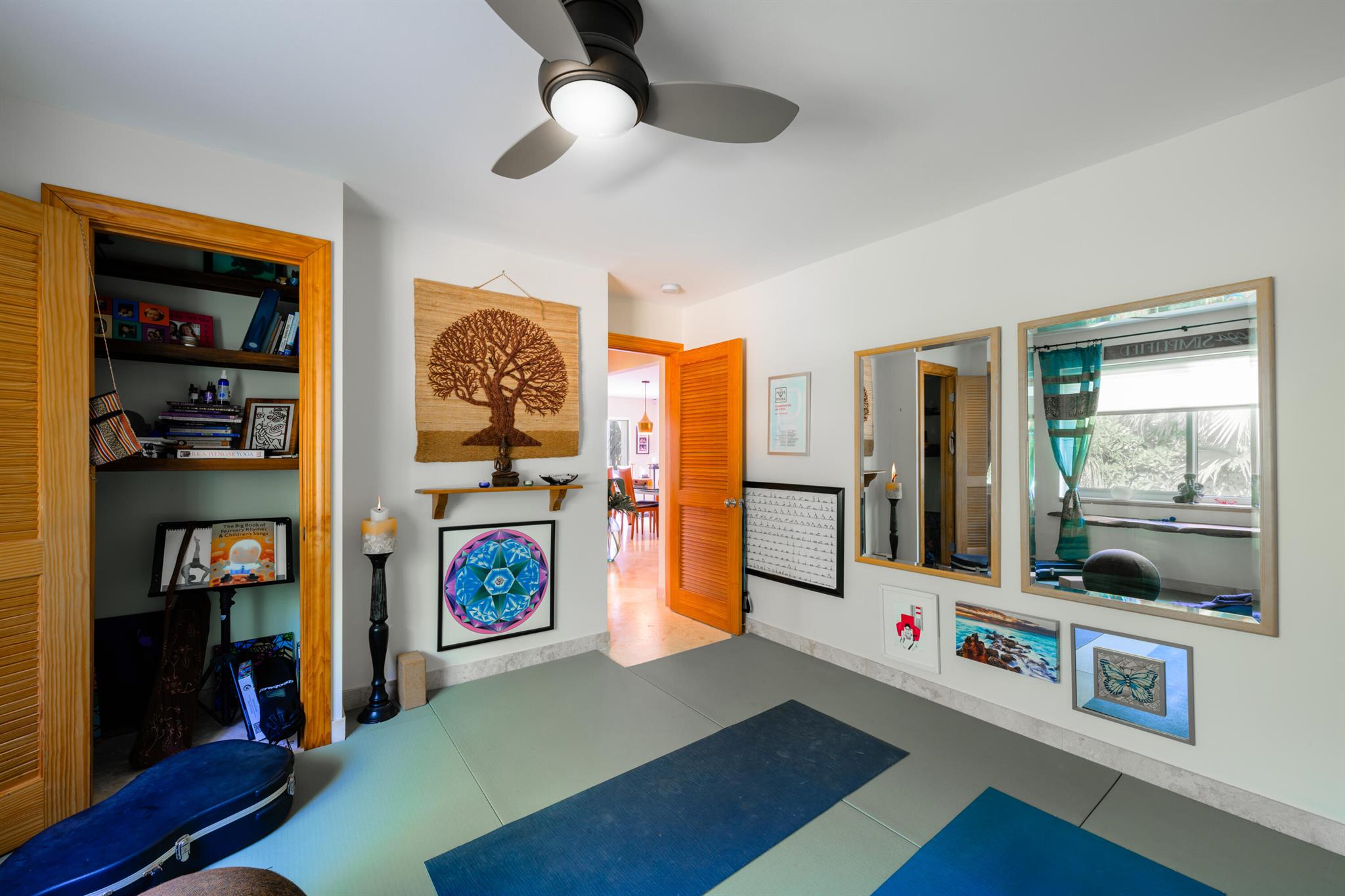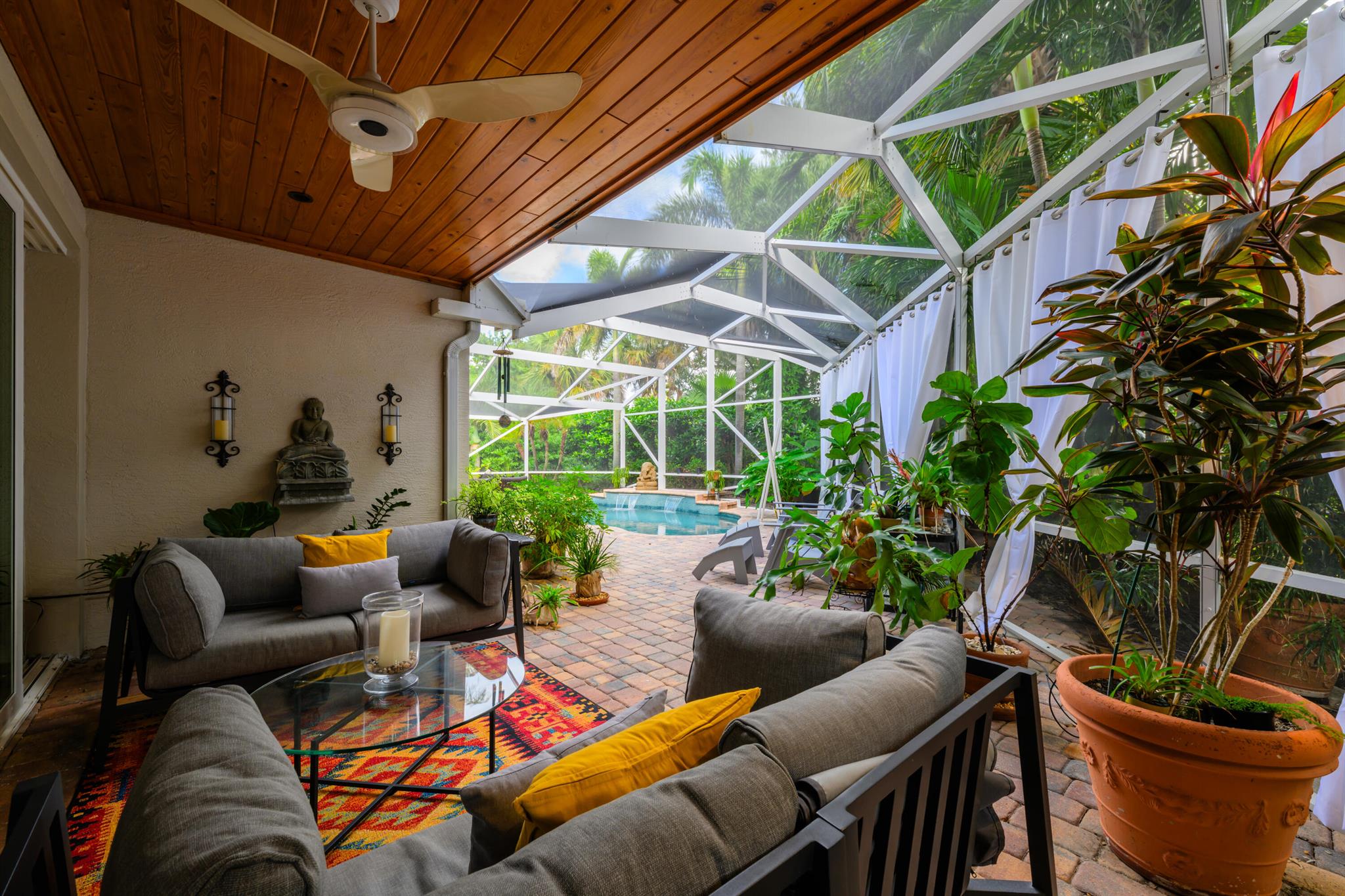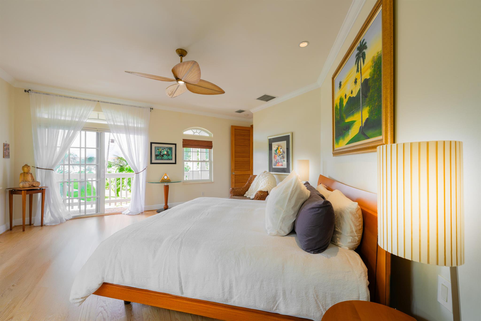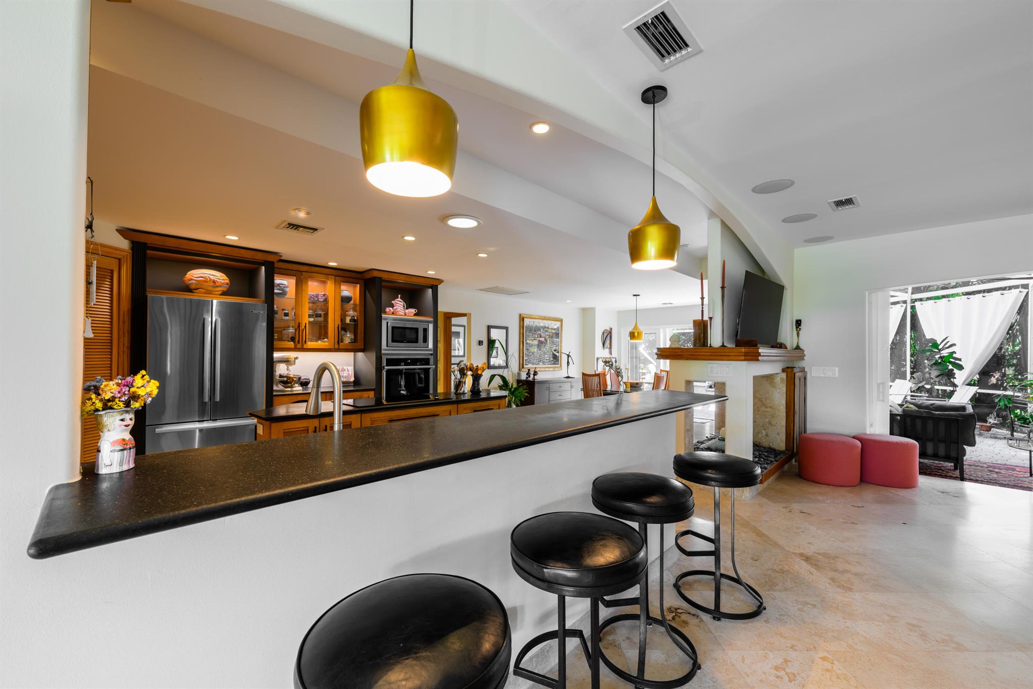 Unique custom craftsmanship in this beautiful Zen Island home with water views of the Intracoastal. Large rooms, tall ceilings and incredible style. It has that wow factor right when you walk in the front door into a architects designer great room that overlooks the heated salt water pool and indoor and outdoor living areas. Travertine flooring throughout the downstairs, with one large primary bedroom with private bath, plus two guest bedrooms and a full bath. Spacious open great room, amazing kitchen with a large dining area. All these areas open up to the tropical pool oasis with privacy landscaping--so serene! Secluded Primary bedroom suite upstairs. A full balcony with sunrise and sunset water views to relax on, and a spa like en-suite. Upstairs are all-natural oak floors,