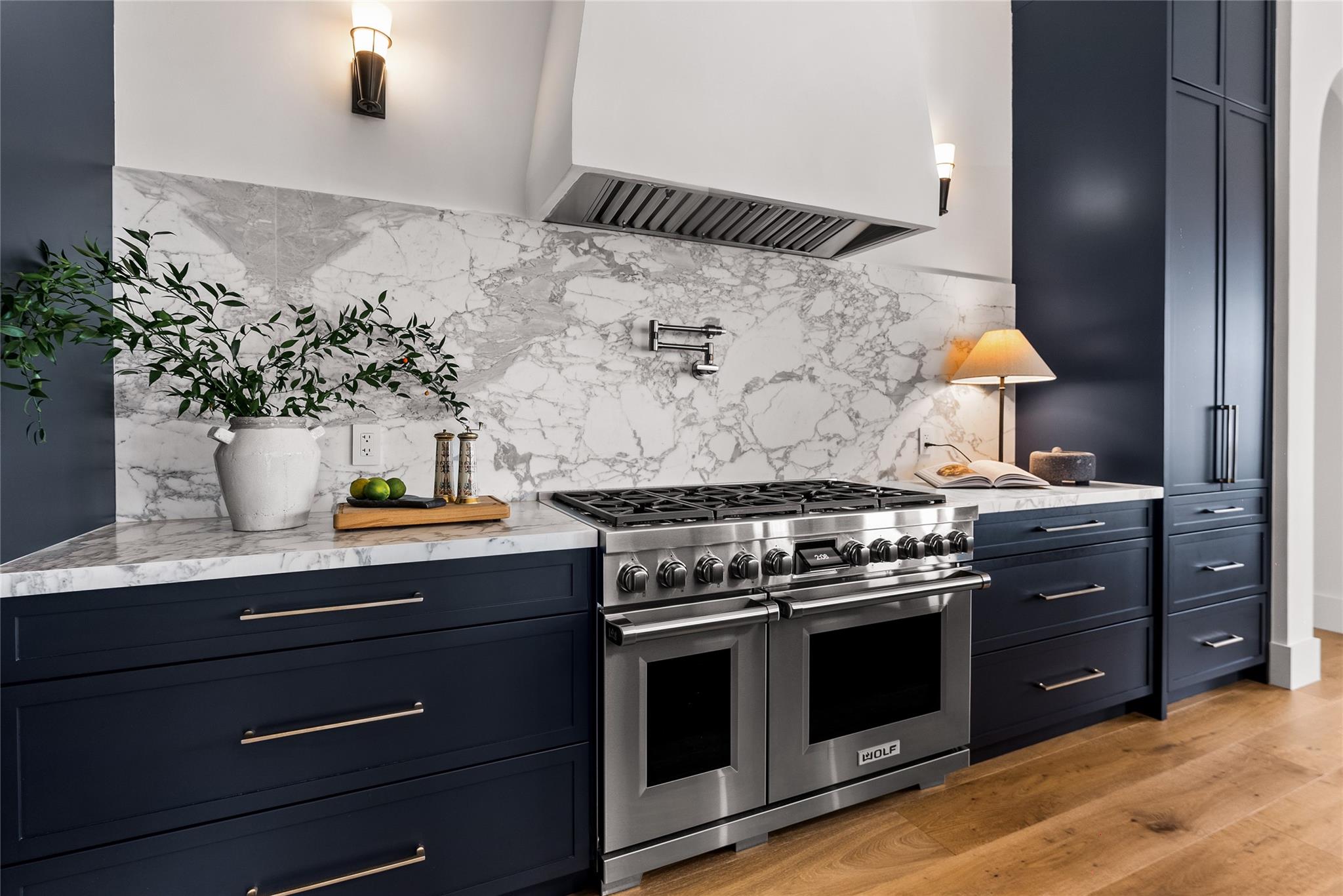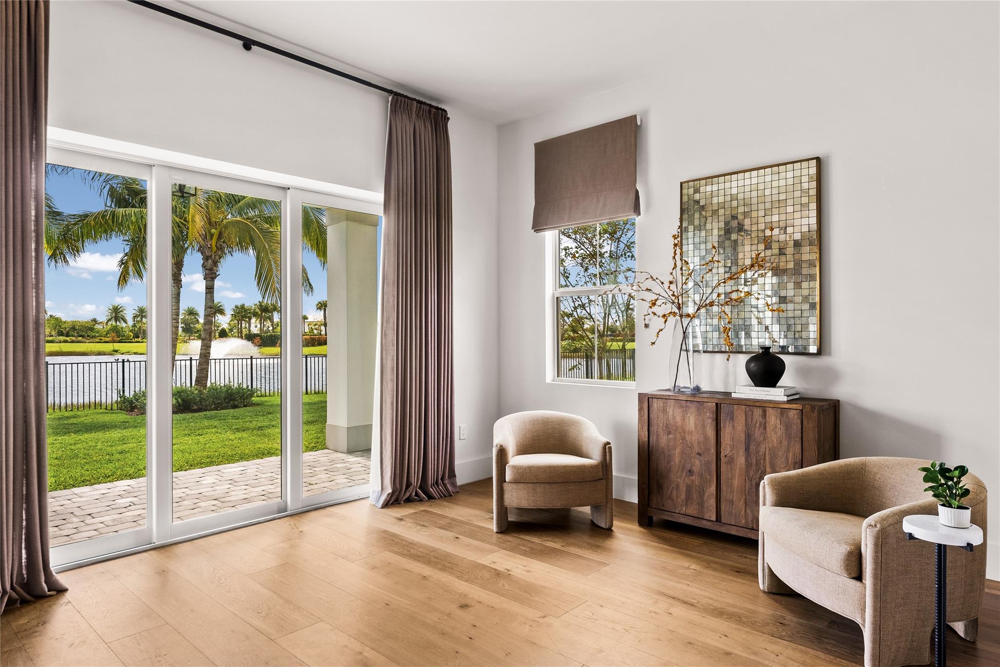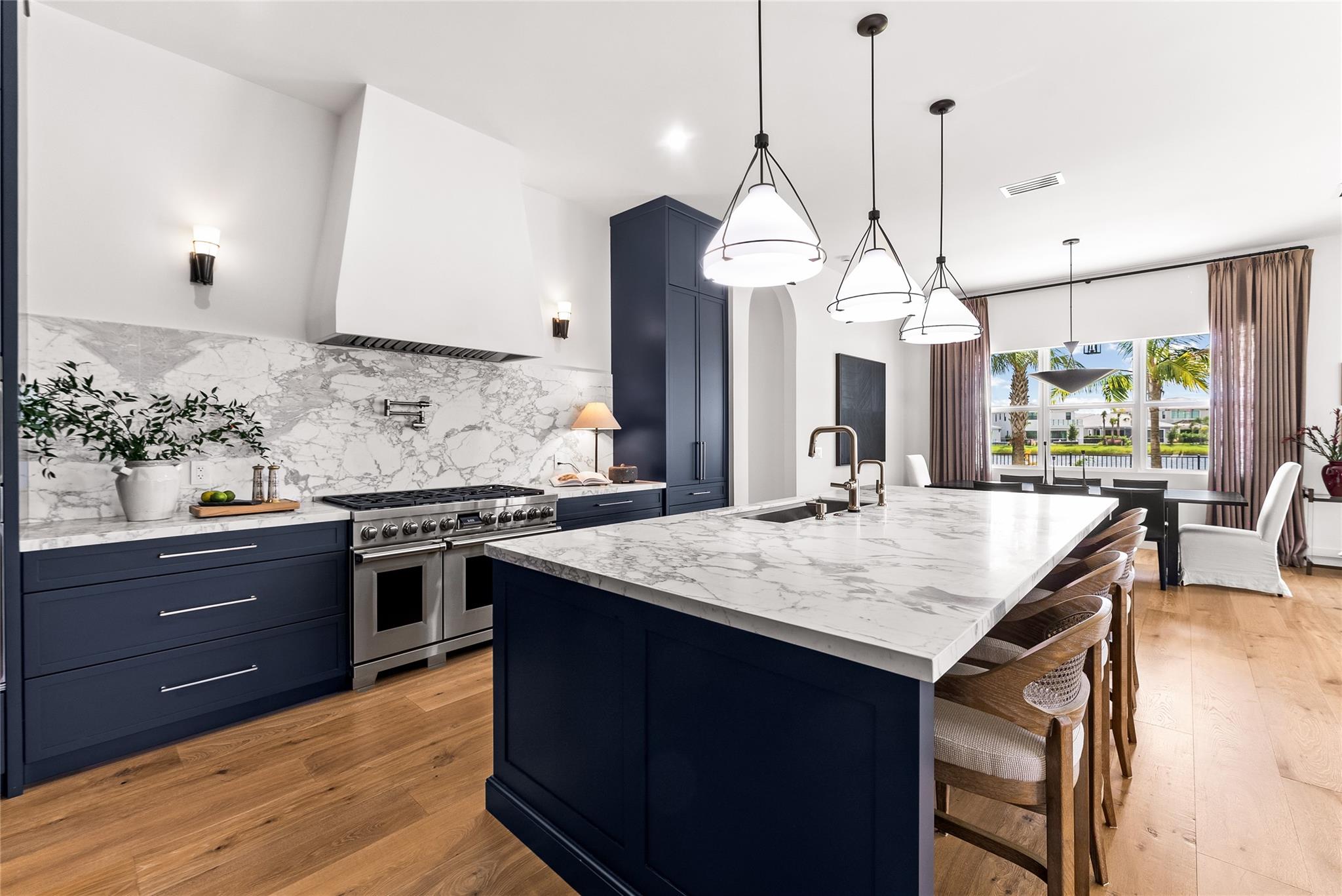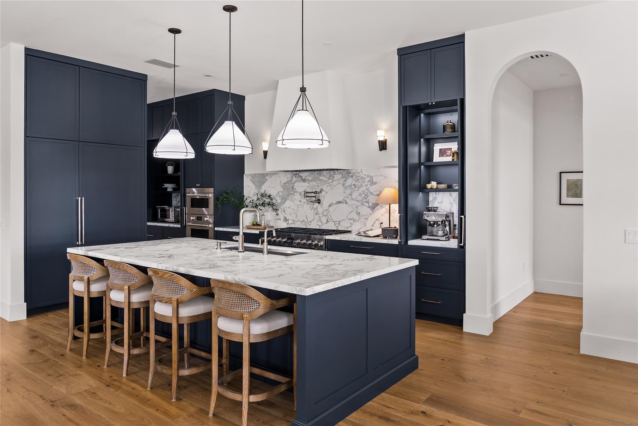 Step into a residence where every detail has been thoughtfully curated to balance modern functionality with timeless design. At its heart lies a bespoke kitchen, enveloped in Italian Statuario Belgia marble with a striking three-foot backsplash, complemented by a Sub-Zero/Wolf appliance suite, handcrafted custom cabinetry, and European white oak hardwood floors that flow seamlessly throughout the home. The primary suite offers a serene retreat, complete with travertine floors, custom dolomite vanities, walk-in rainfall shower elegantly enclosed by a tailored single pane of low-iron glass, and a two-person soaking tub reminiscent of a luxury spa experience. Outside, enjoy panoramic lake views, a fully fenced yard, and the privacy of a generous one-third-acre homesite.