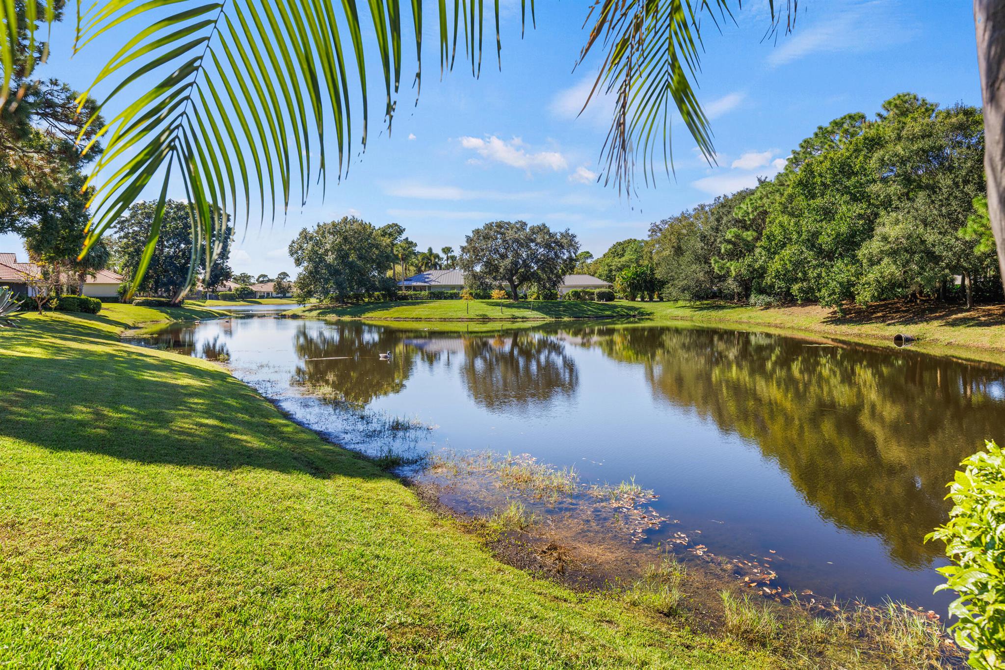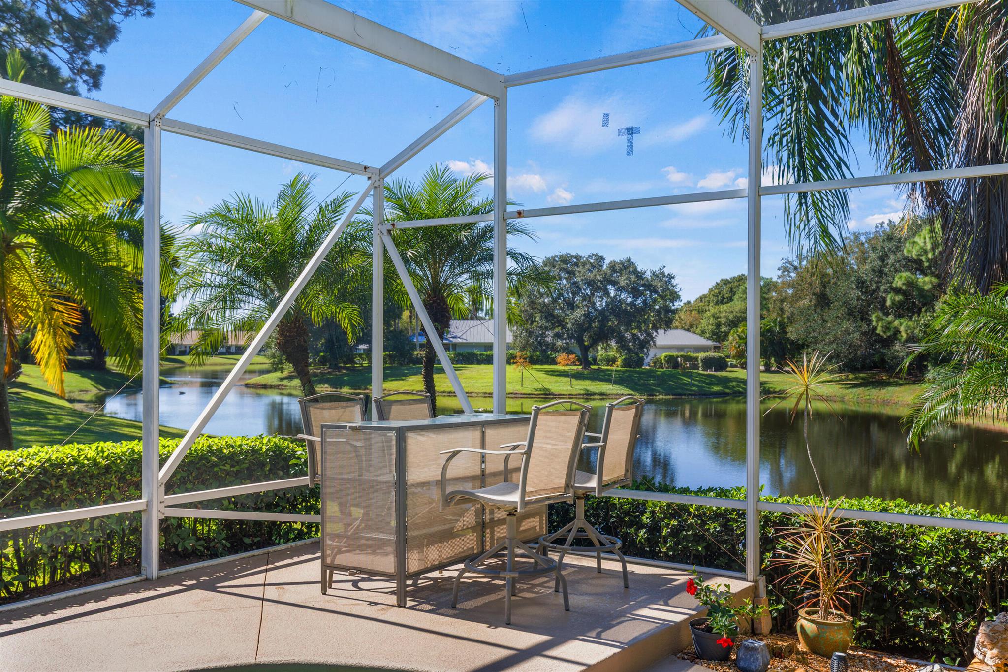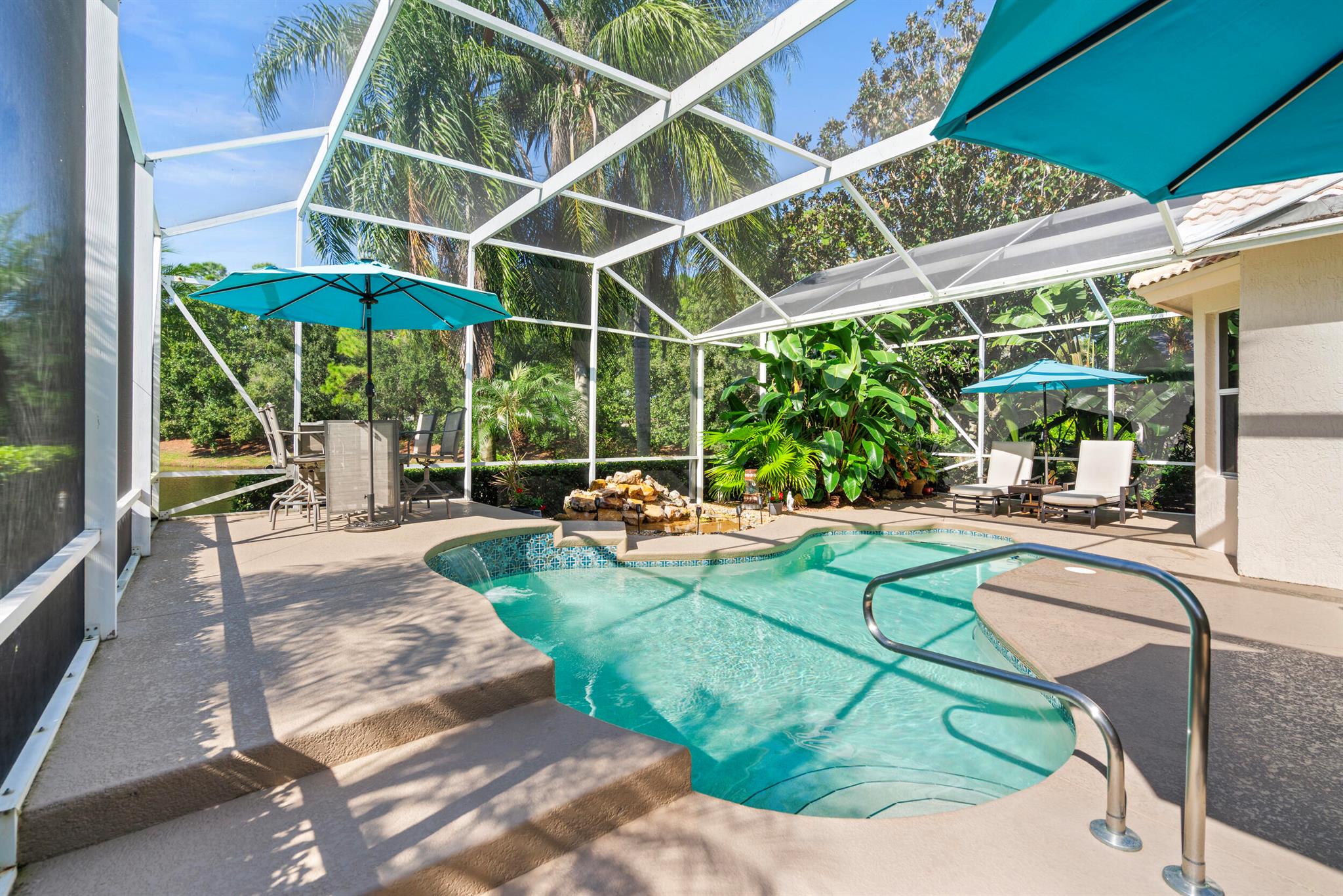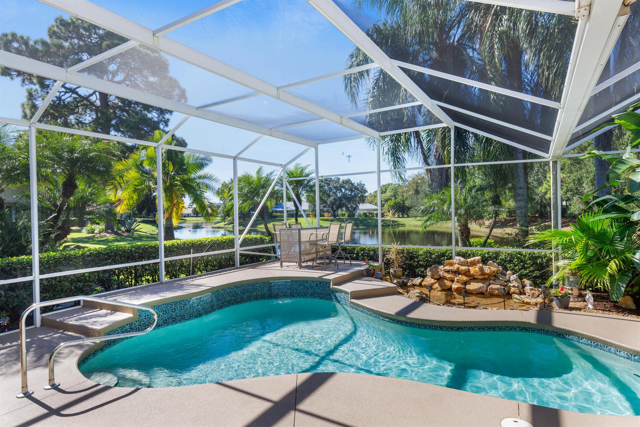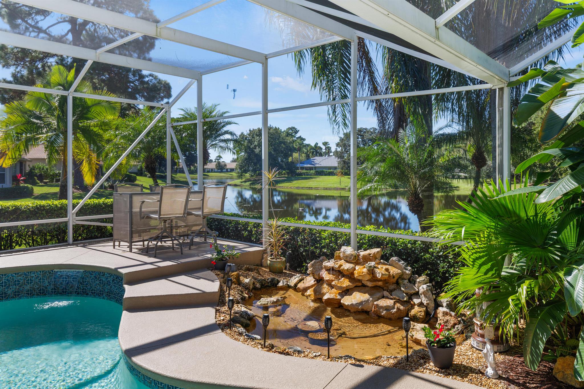 Beautiful Pool home with Lake View in ''Mystic Pines'' at PGA Village. This home offers fabulous Sunsets & tropical landscaping. Features CBS Construction, front gate entrance, tile flooring in main areas, vaulted ceilings, updated lights, fans & Plantation Shutters. Hosts 2 BR's, Large Den, 2 BA's, 2 Car Garage & Golf cart negotiable. Stunning Eat in Updated Kitchen boasts gorgeous quartz counter tops & backsplash, stainless steel appliances, wine cooler, under counter lighting & Island. Split floor plan with spacious Master Suite, sitting area overlooking the lake, walk in closets with built in's, decorative fireplace & Master Bath w/ LG shower & Roman Tub. Screen enclosed heated pool w/ new pump & heater, waterfall pond & summer kitchen. Perfect To entertain!