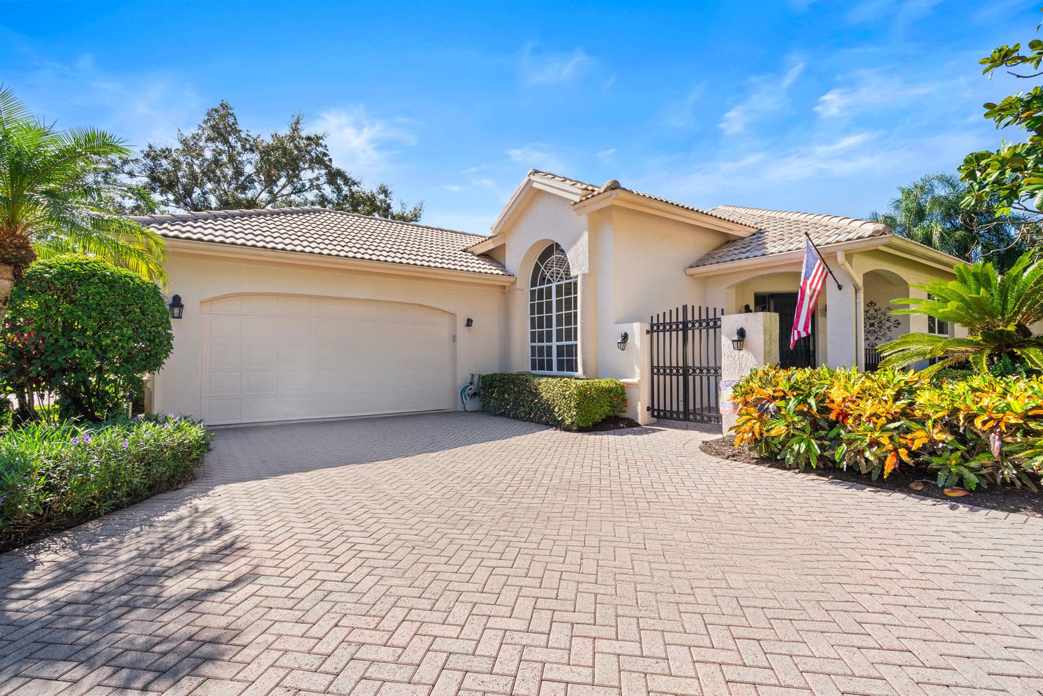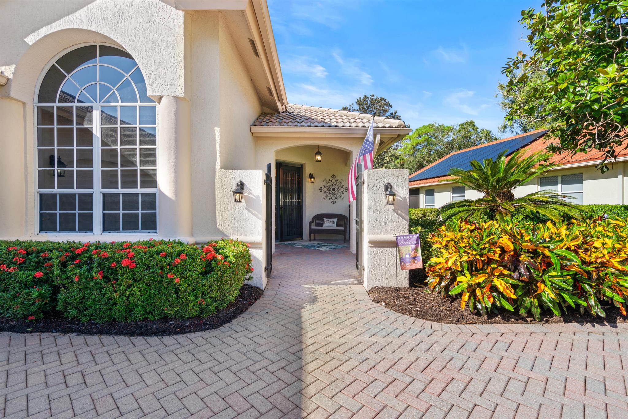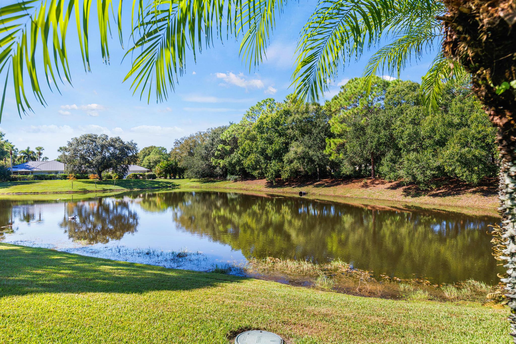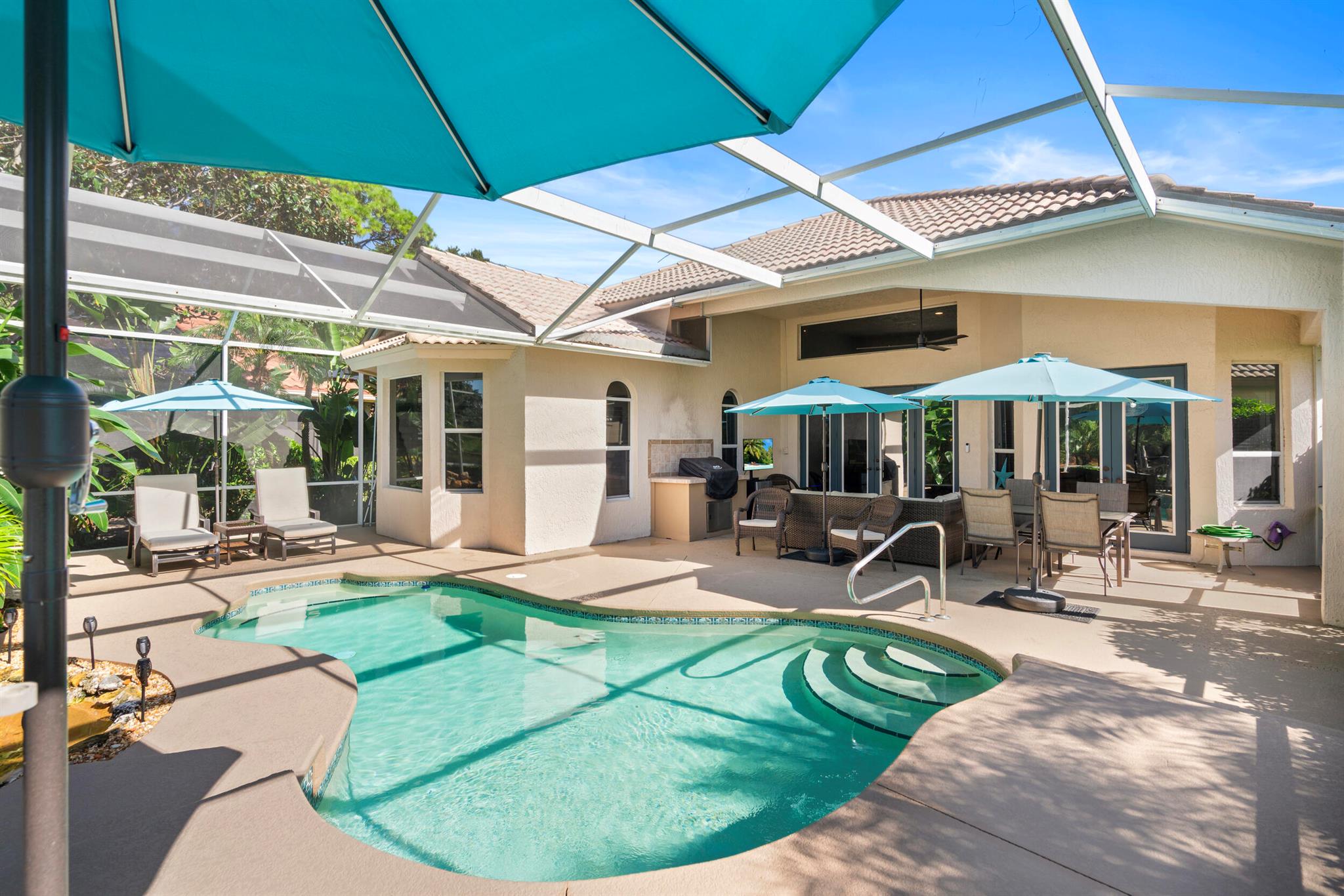 Beautiful Pool home with Lake View in ''Mystic Pines'' at PGA Village. This home offers fabulous Sunsets & tropical landscaping. Features CBS Construction, front gate entrance, tile flooring in main areas, vaulted ceilings, updated lights, fans & Plantation Shutters. Hosts 2 BR's, Large Den, 2 BA's, 2 Car Garage & Golf cart negotiable. Stunning Eat in Updated Kitchen boasts gorgeous quartz counter tops & backsplash, stainless steel appliances, wine cooler, under counter lighting & Island. Split floor plan with spacious Master Suite, sitting area overlooking the lake, walk in closets with built in's, decorative fireplace & Master Bath w/ LG shower & Roman Tub. Screen enclosed heated pool w/ new pump & heater, waterfall pond & summer kitchen. Perfect To entertain!