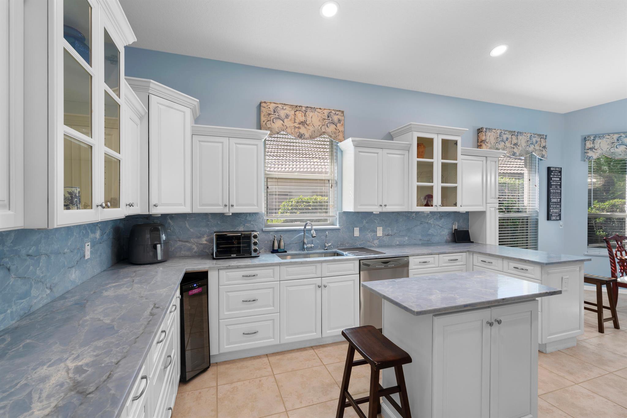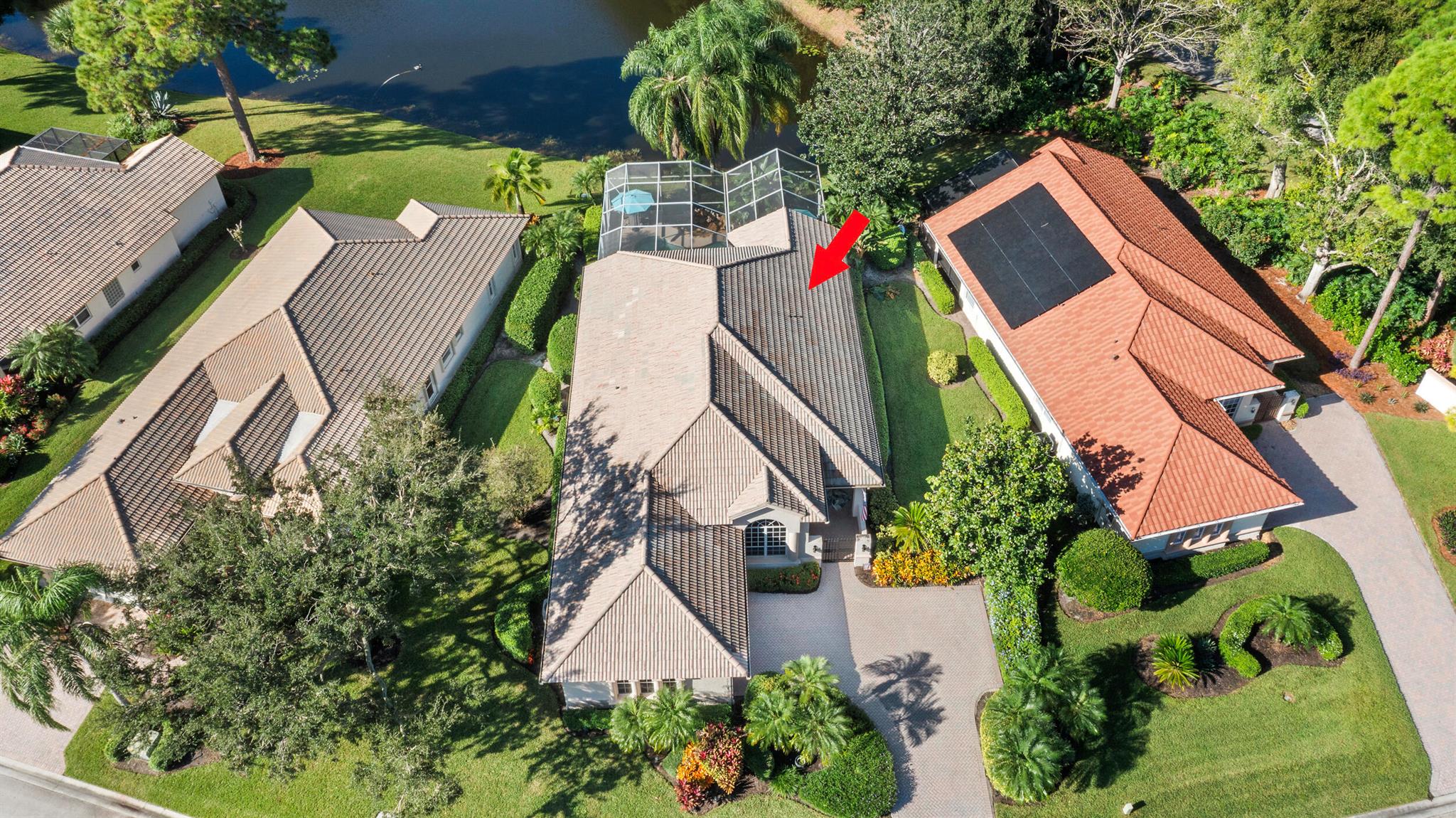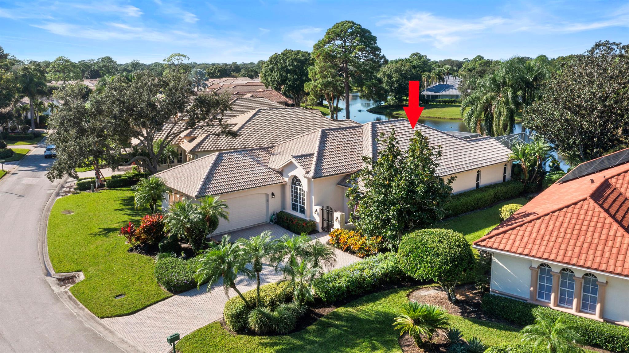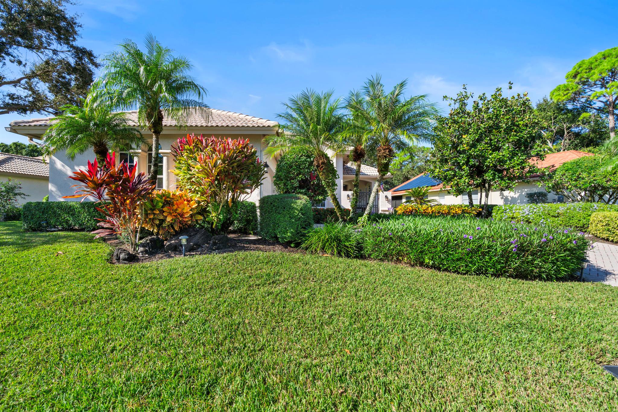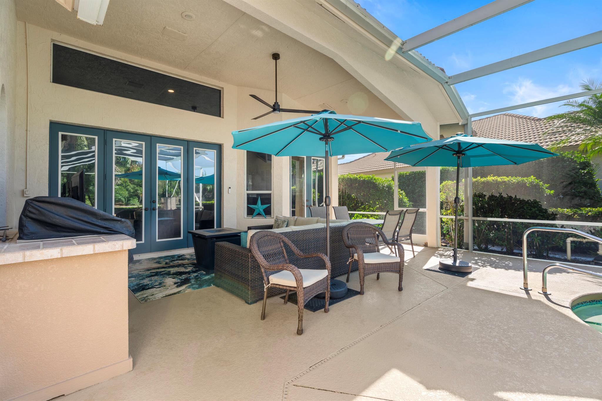 Beautiful Pool home with Lake View in ''Mystic Pines'' at PGA Village. This home offers fabulous Sunsets & tropical landscaping. Features CBS Construction, front gate entrance, tile flooring in main areas, vaulted ceilings, updated lights, fans & Plantation Shutters. Hosts 2 BR's, Large Den, 2 BA's, 2 Car Garage & Golf cart negotiable. Stunning Eat in Updated Kitchen boasts gorgeous quartz counter tops & backsplash, stainless steel appliances, wine cooler, under counter lighting & Island. Split floor plan with spacious Master Suite, sitting area overlooking the lake, walk in closets with built in's, decorative fireplace & Master Bath w/ LG shower & Roman Tub. Screen enclosed heated pool w/ new pump & heater, waterfall pond & summer kitchen. Perfect To entertain!