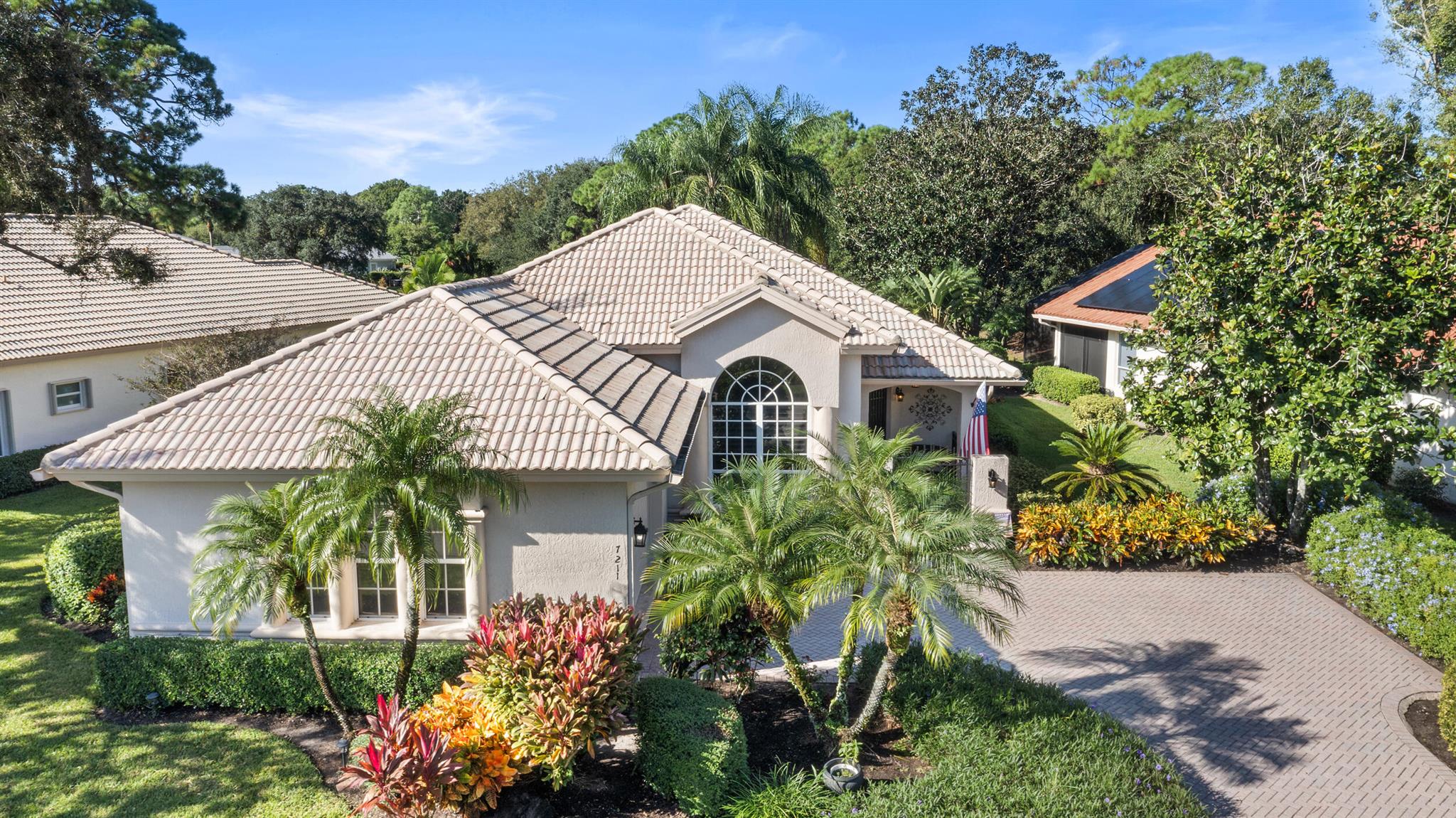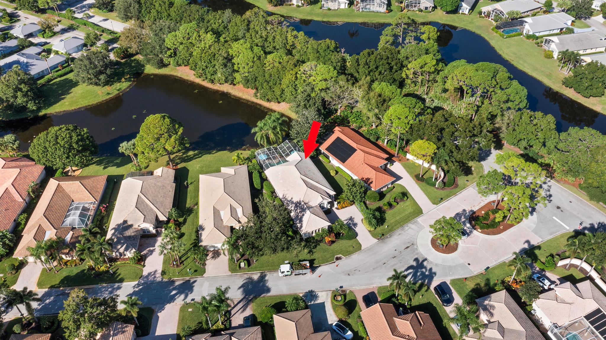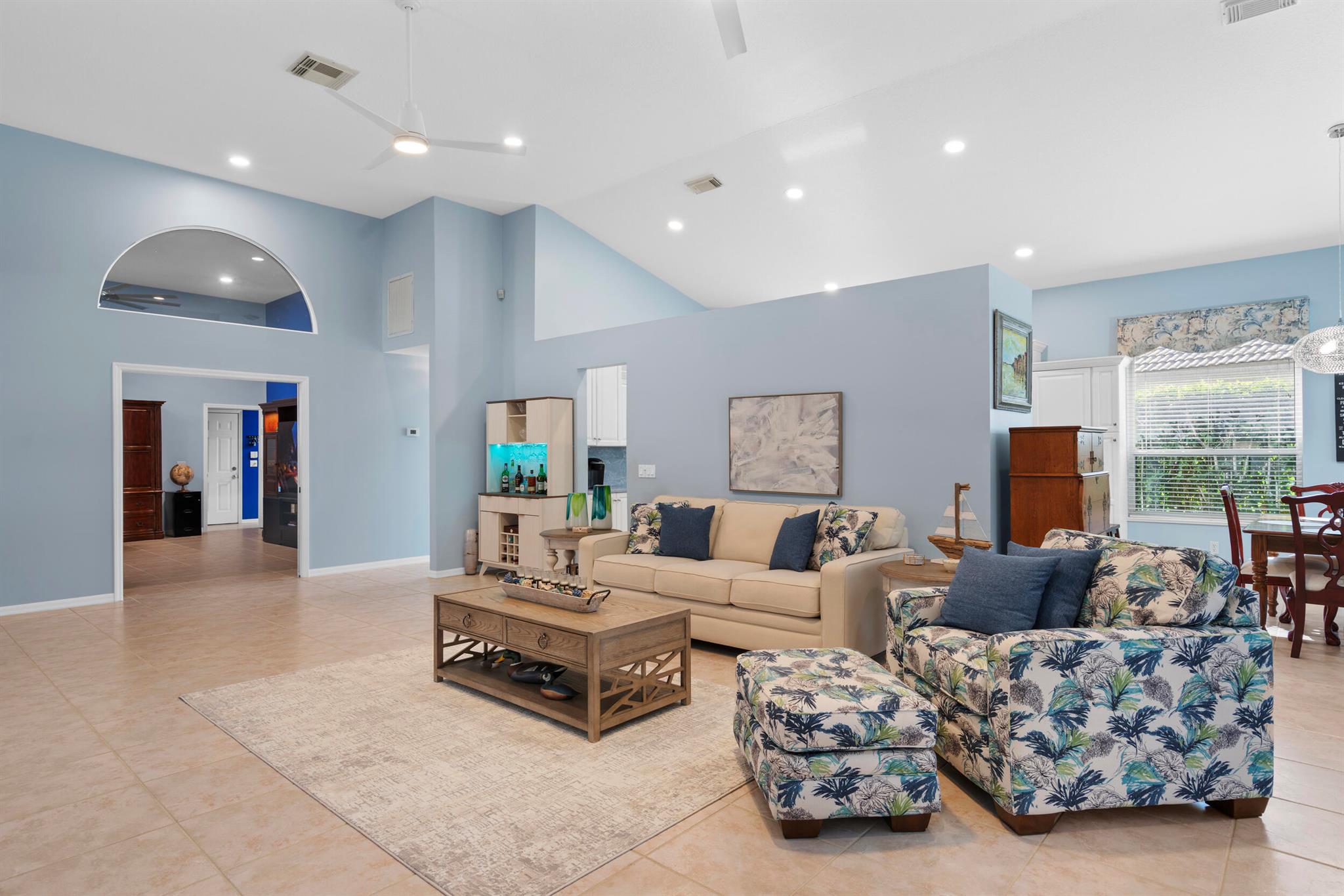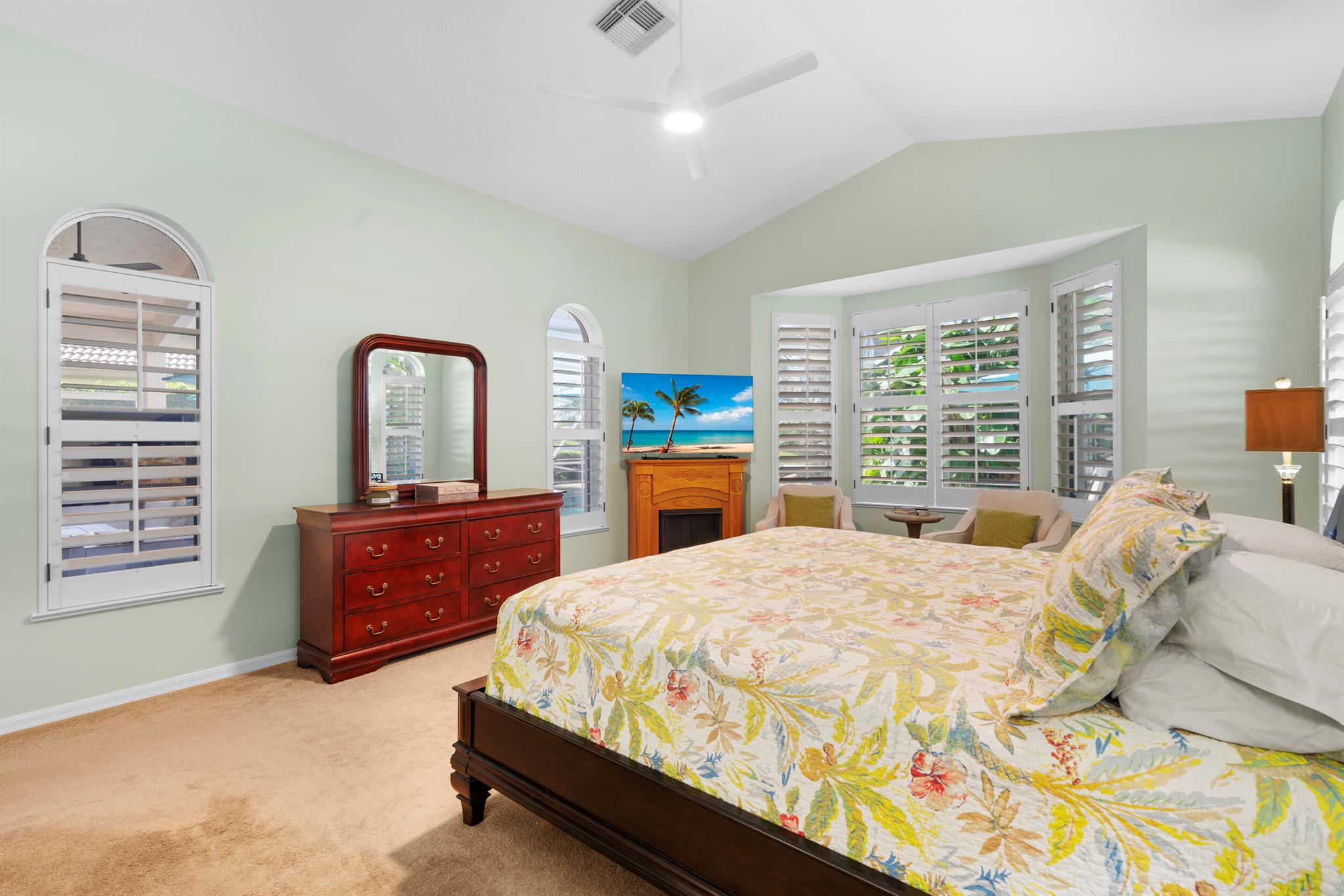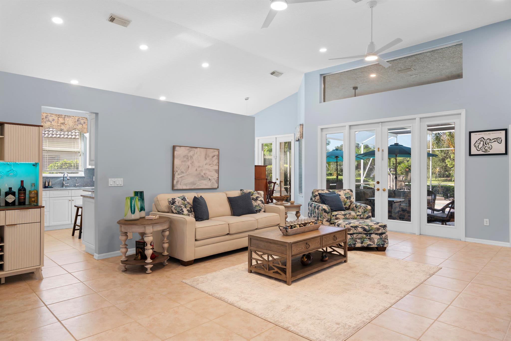 Beautiful Pool home with Lake View in ''Mystic Pines'' at PGA Village. This home offers fabulous Sunsets & tropical landscaping. Features CBS Construction, front gate entrance, tile flooring in main areas, vaulted ceilings, updated lights, fans & Plantation Shutters. Hosts 2 BR's, Large Den, 2 BA's, 2 Car Garage & Golf cart negotiable. Stunning Eat in Updated Kitchen boasts gorgeous quartz counter tops & backsplash, stainless steel appliances, wine cooler, under counter lighting & Island. Split floor plan with spacious Master Suite, sitting area overlooking the lake, walk in closets with built in's, decorative fireplace & Master Bath w/ LG shower & Roman Tub. Screen enclosed heated pool w/ new pump & heater, waterfall pond & summer kitchen. Perfect To entertain!