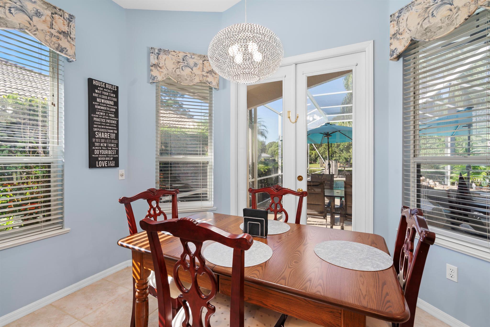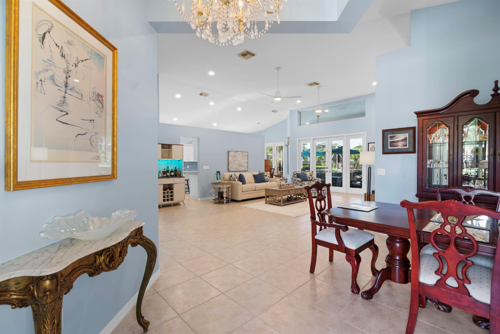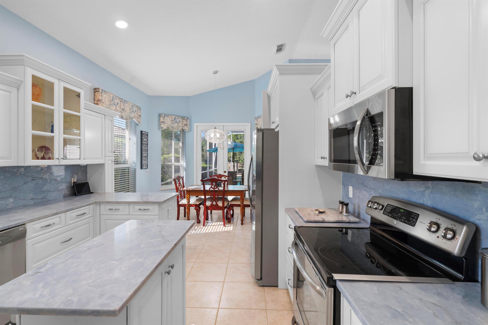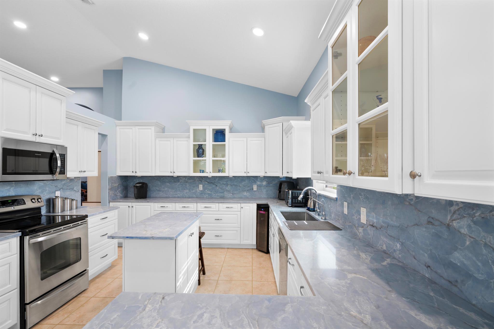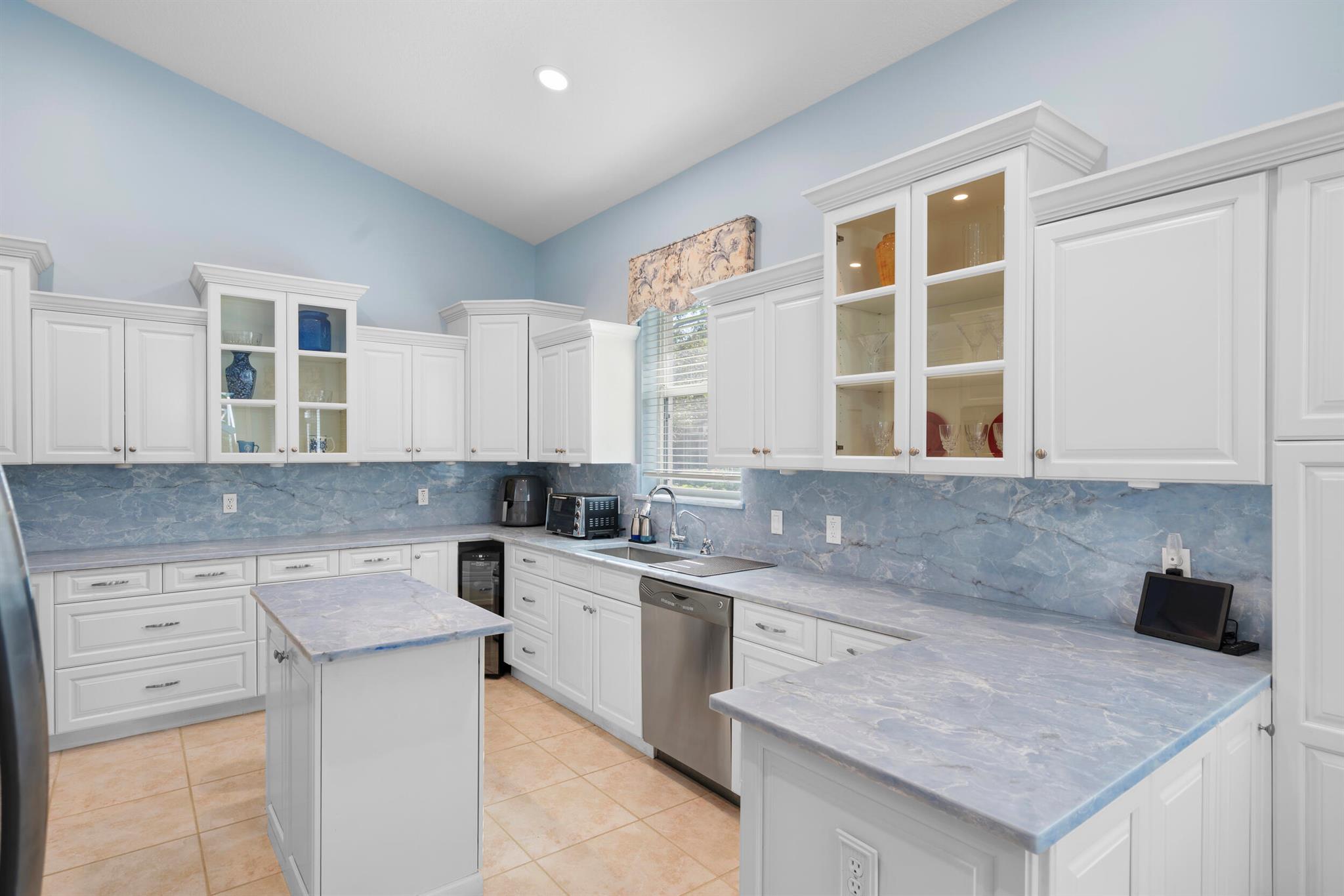 Beautiful Pool home with Lake View in ''Mystic Pines'' at PGA Village. This home offers fabulous Sunsets & tropical landscaping. Features CBS Construction, front gate entrance, tile flooring in main areas, vaulted ceilings, updated lights, fans & Plantation Shutters. Hosts 2 BR's, Large Den, 2 BA's, 2 Car Garage & Golf cart negotiable. Stunning Eat in Updated Kitchen boasts gorgeous quartz counter tops & backsplash, stainless steel appliances, wine cooler, under counter lighting & Island. Split floor plan with spacious Master Suite, sitting area overlooking the lake, walk in closets with built in's, decorative fireplace & Master Bath w/ LG shower & Roman Tub. Screen enclosed heated pool w/ new pump & heater, waterfall pond & summer kitchen. Perfect To entertain!