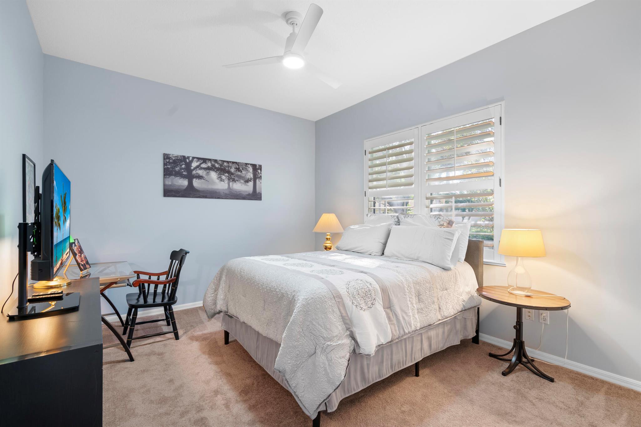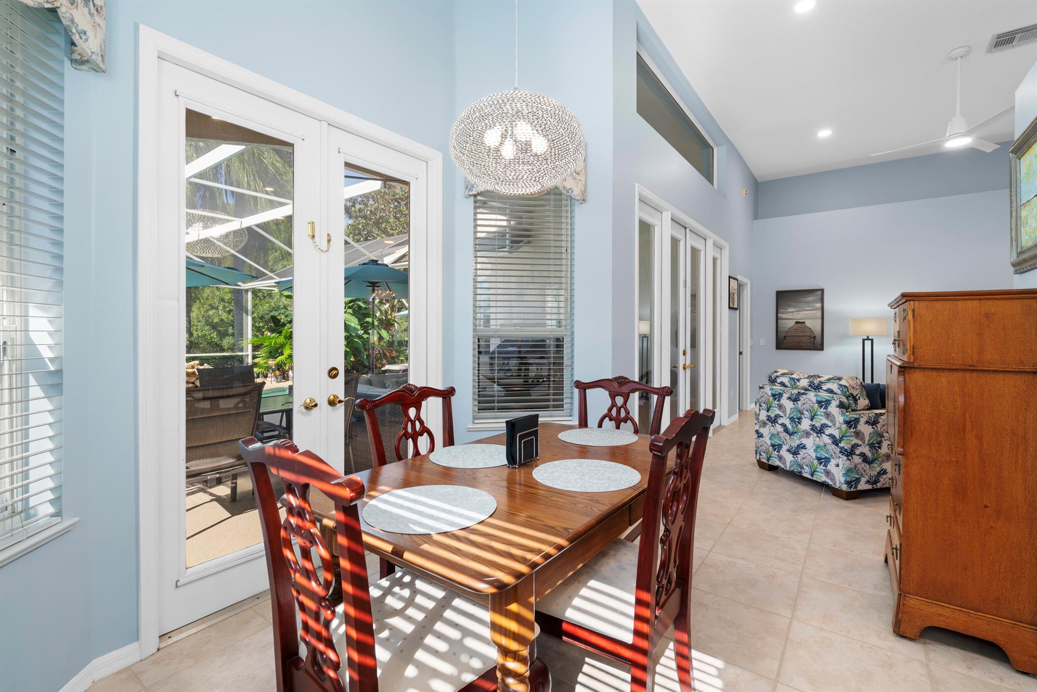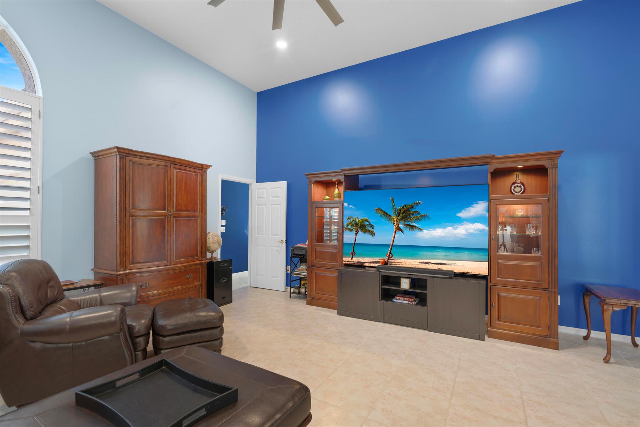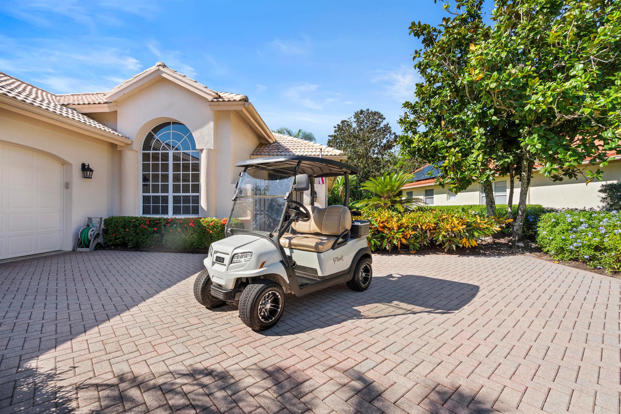 Beautiful Pool home with Lake View in ''Mystic Pines'' at PGA Village. This home offers fabulous Sunsets & tropical landscaping. Features CBS Construction, front gate entrance, tile flooring in main areas, vaulted ceilings, updated lights, fans & Plantation Shutters. Hosts 2 BR's, Large Den, 2 BA's, 2 Car Garage & Golf cart negotiable. Stunning Eat in Updated Kitchen boasts gorgeous quartz counter tops & backsplash, stainless steel appliances, wine cooler, under counter lighting & Island. Split floor plan with spacious Master Suite, sitting area overlooking the lake, walk in closets with built in's, decorative fireplace & Master Bath w/ LG shower & Roman Tub. Screen enclosed heated pool w/ new pump & heater, waterfall pond & summer kitchen. Perfect To entertain!