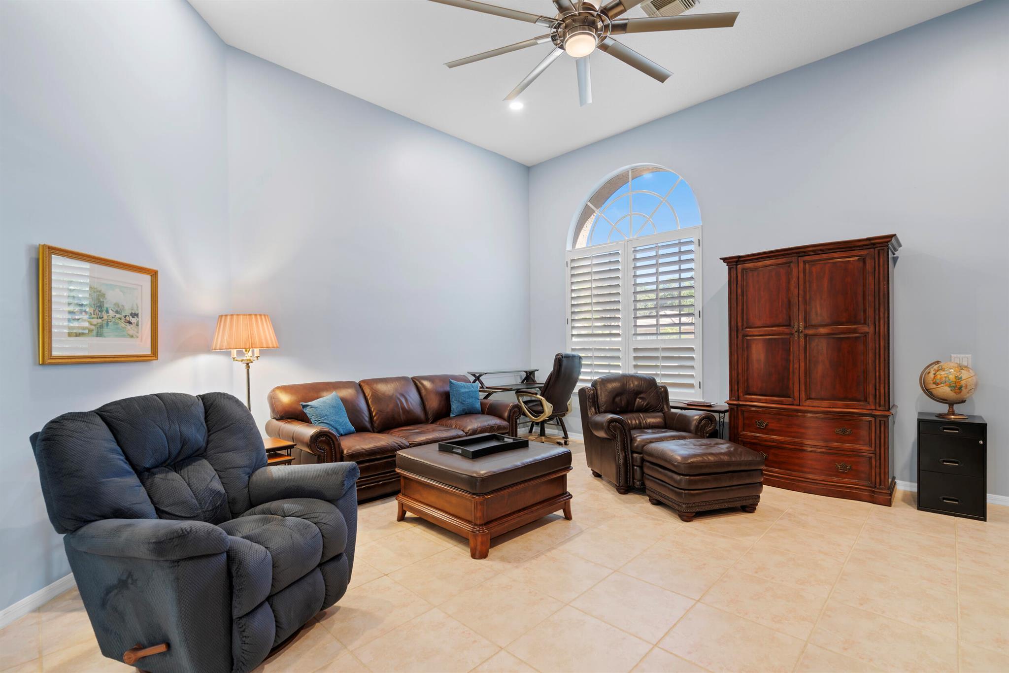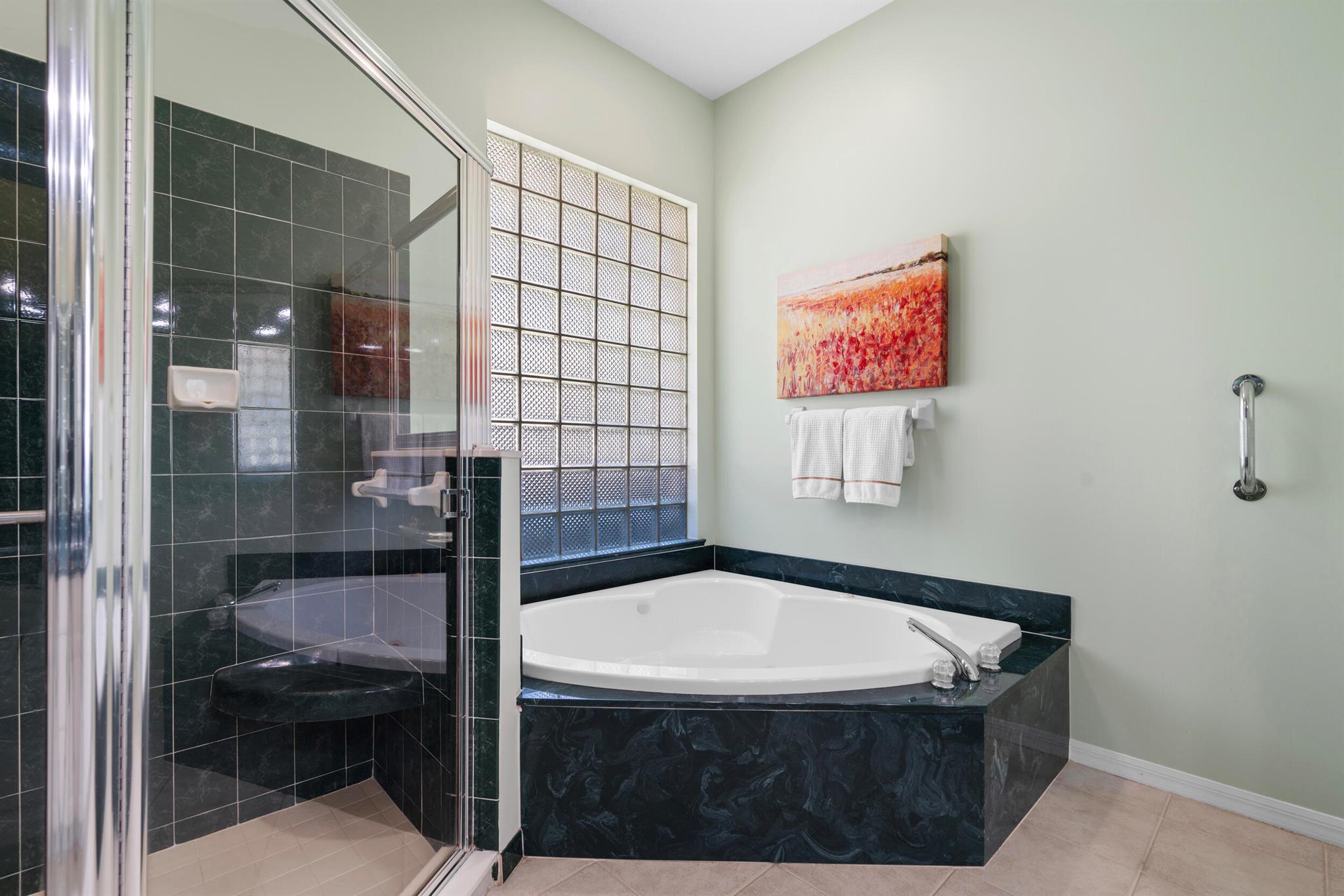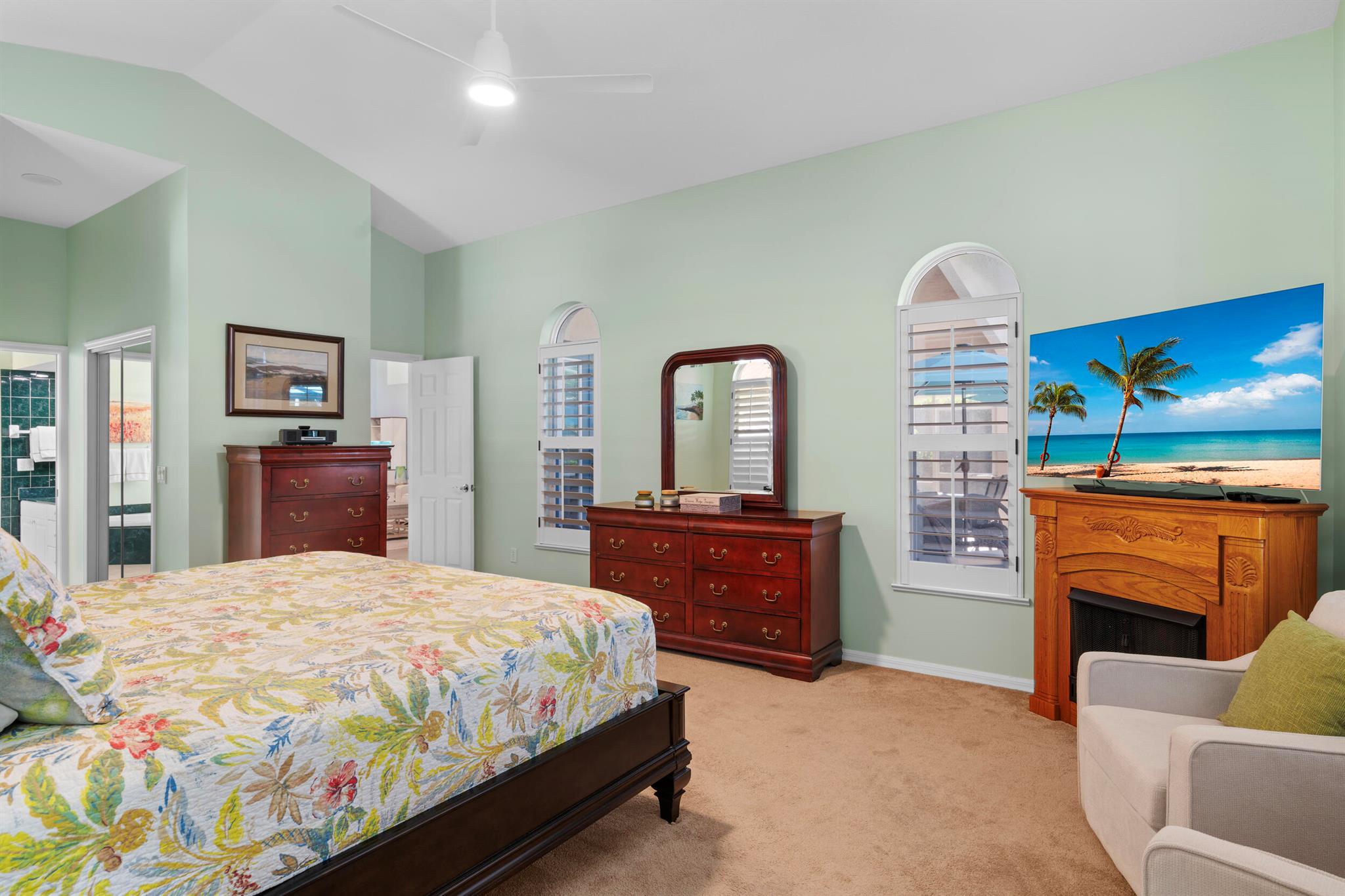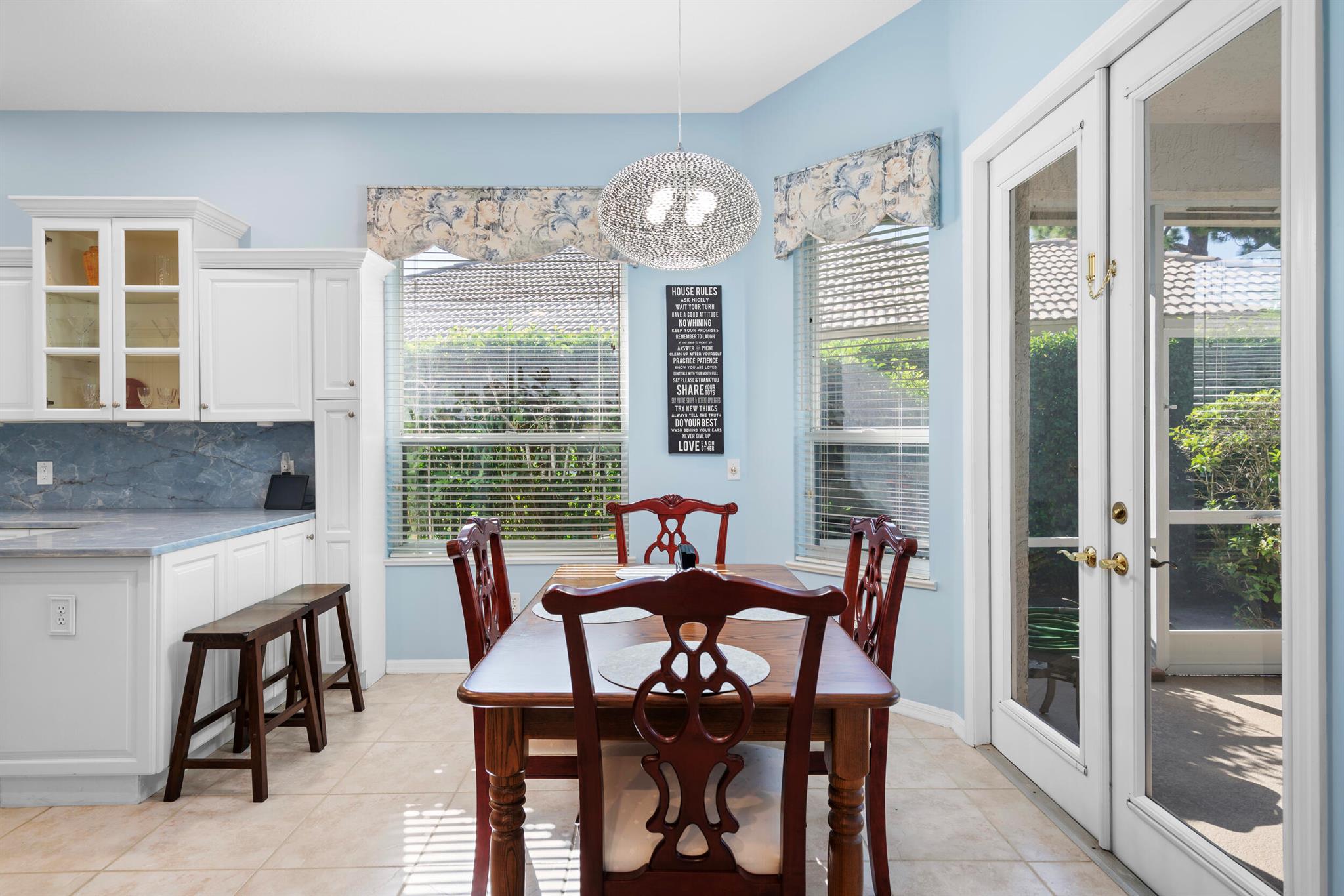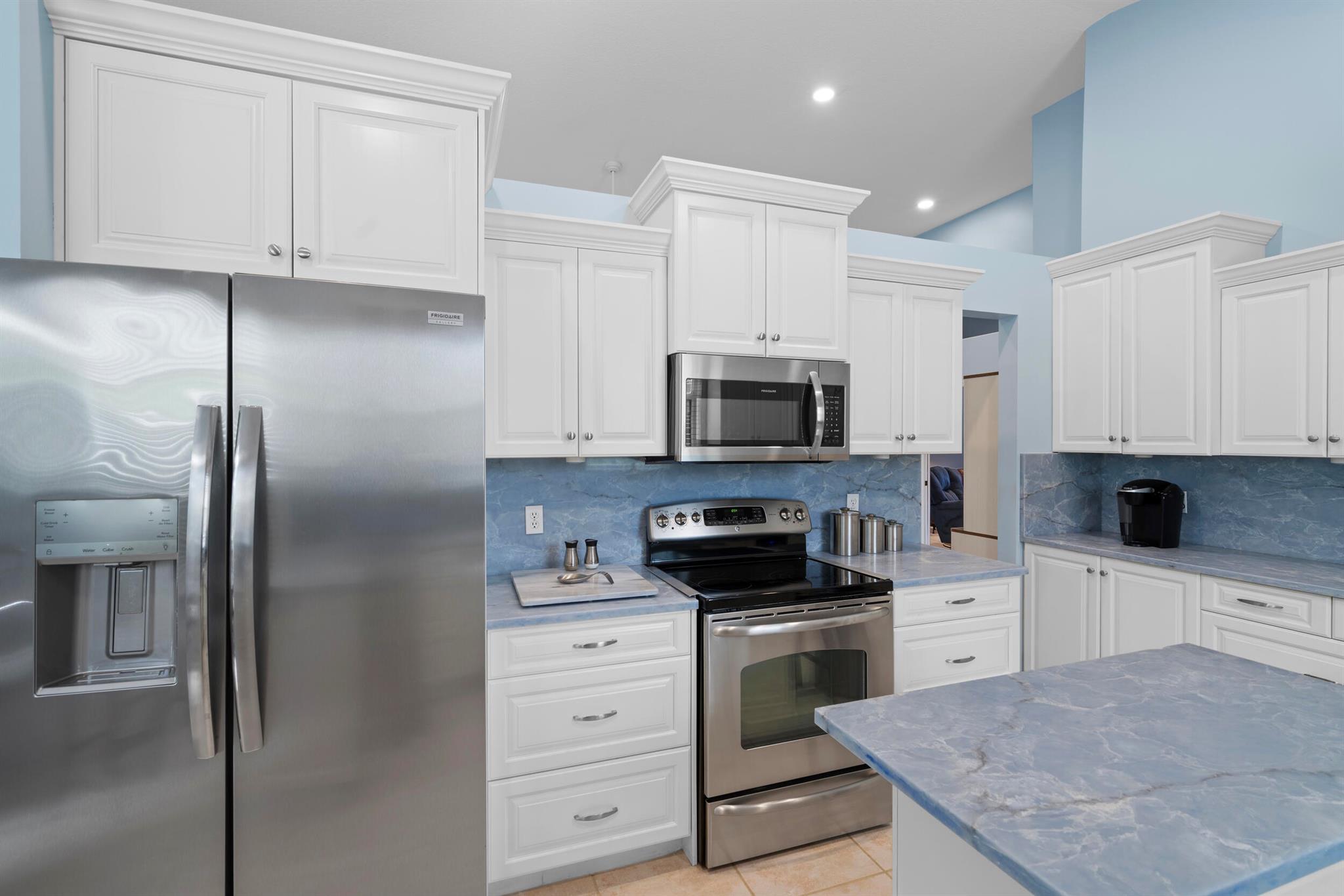 Beautiful Pool home with Lake View in ''Mystic Pines'' at PGA Village. This home offers fabulous Sunsets & tropical landscaping. Features CBS Construction, front gate entrance, tile flooring in main areas, vaulted ceilings, updated lights, fans & Plantation Shutters. Hosts 2 BR's, Large Den, 2 BA's, 2 Car Garage & Golf cart negotiable. Stunning Eat in Updated Kitchen boasts gorgeous quartz counter tops & backsplash, stainless steel appliances, wine cooler, under counter lighting & Island. Split floor plan with spacious Master Suite, sitting area overlooking the lake, walk in closets with built in's, decorative fireplace & Master Bath w/ LG shower & Roman Tub. Screen enclosed heated pool w/ new pump & heater, waterfall pond & summer kitchen. Perfect To entertain!