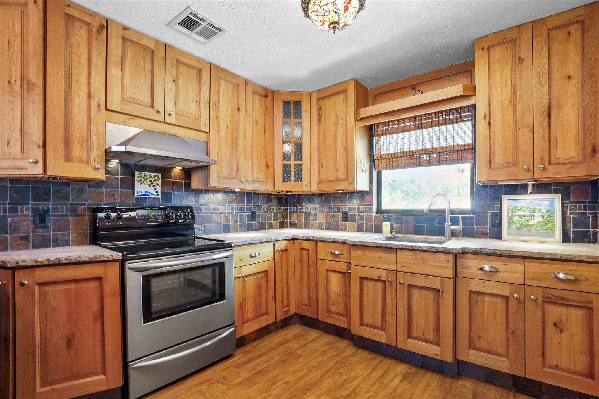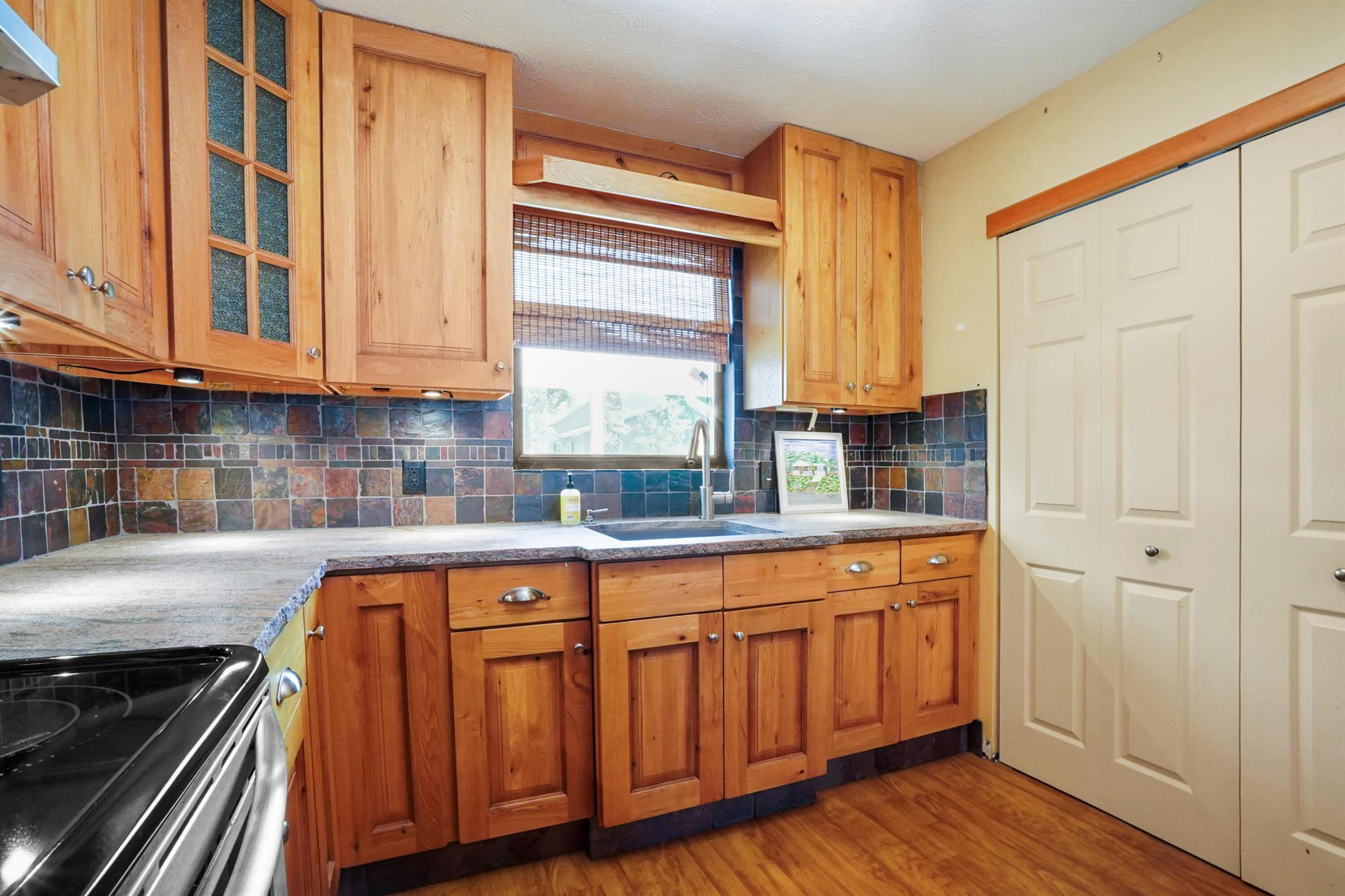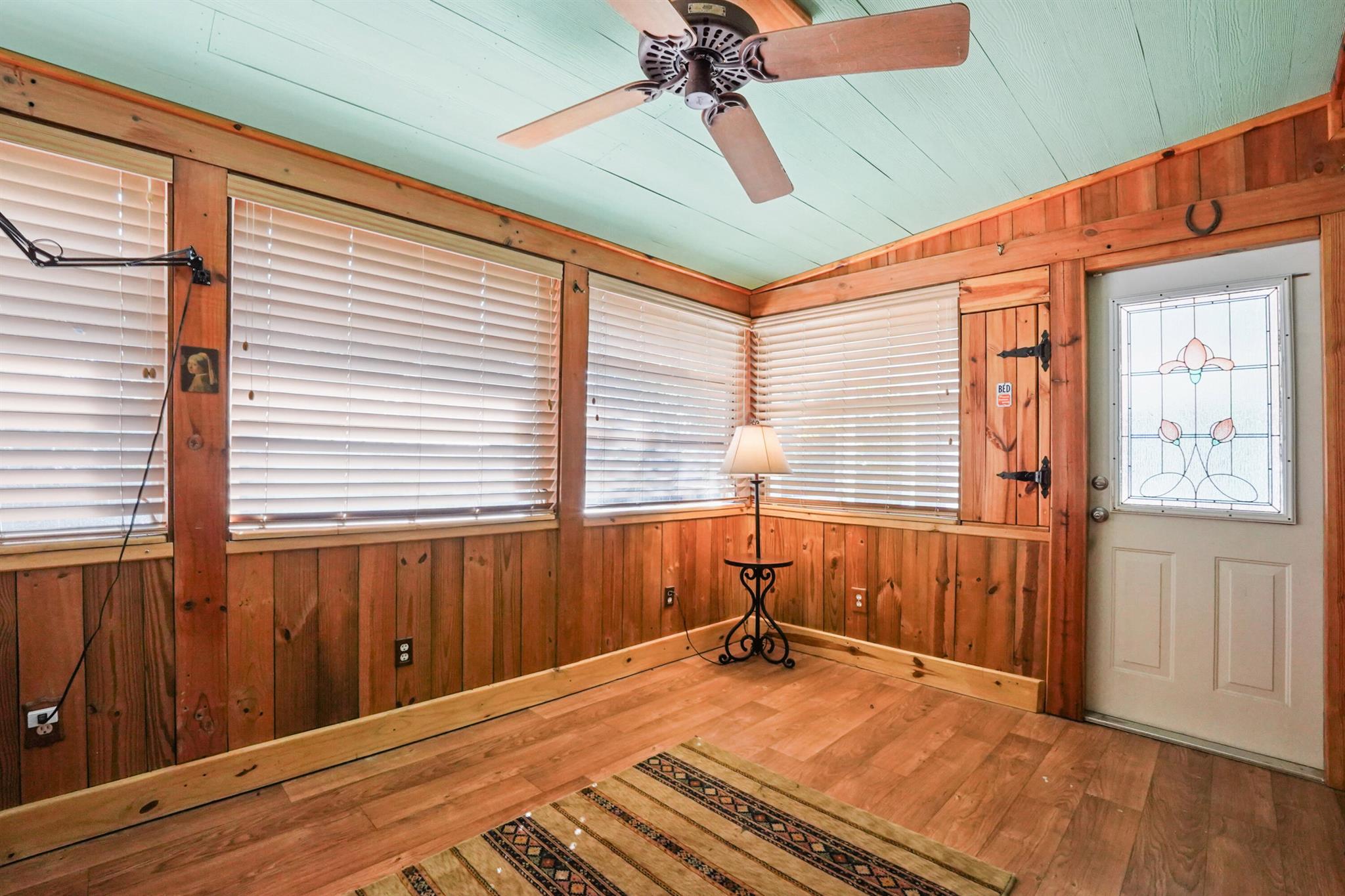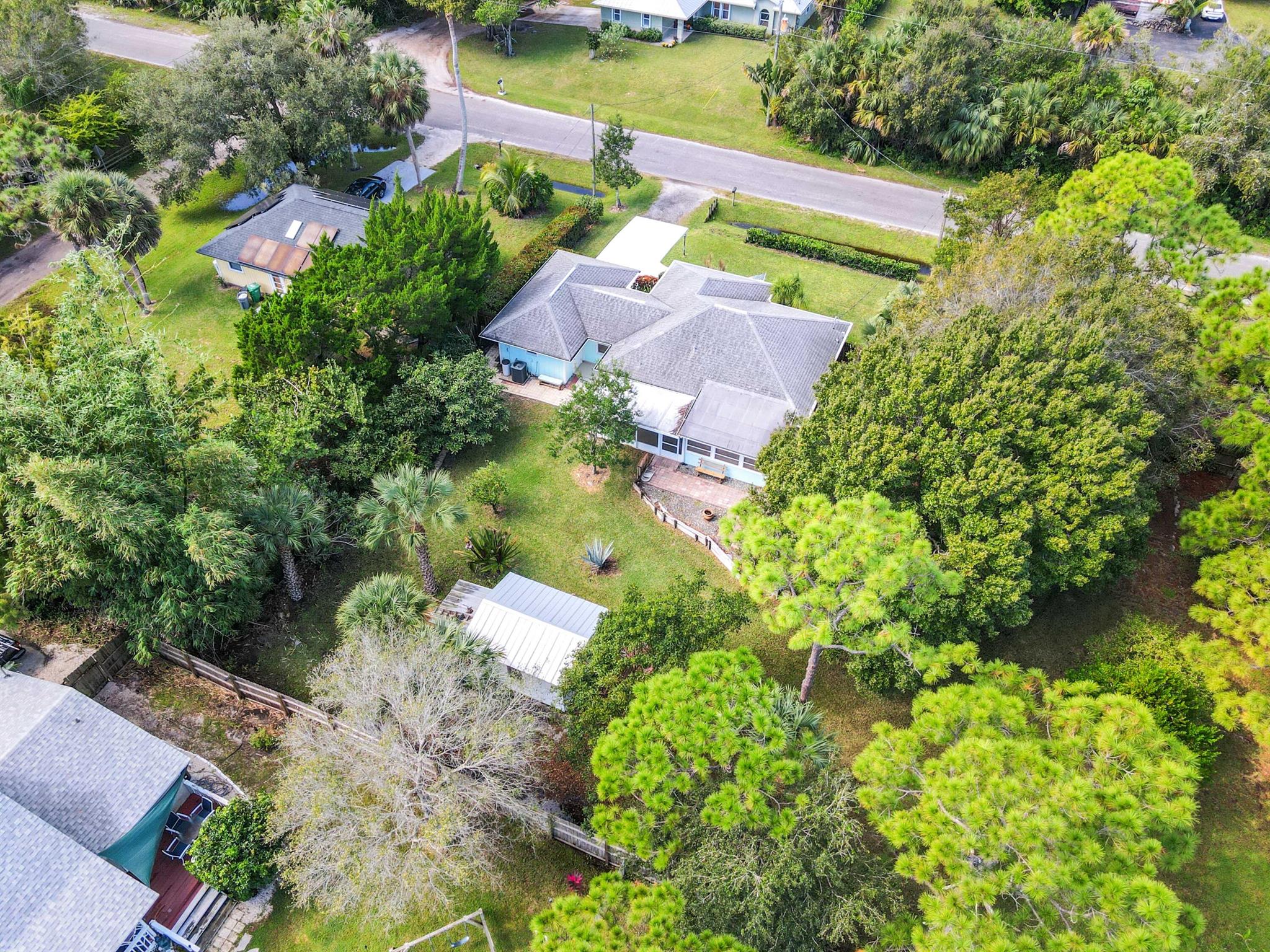 Welcome to this charming and distinctive single-family home, perfectly situated on a beautiful large double waterfront lot in Fort Pierce. The residence immediately captivates with its quintessential Florida style, featuring a soft light blue-green exterior and a welcoming covered front porch with a tongue-and-groove wood ceiling and brick-toned tile floor. Lush tropical landscaping surrounds the home, creating an atmosphere of privacy and tranquility, while a freshly poured driveway offers excellent curb appeal and parking space.