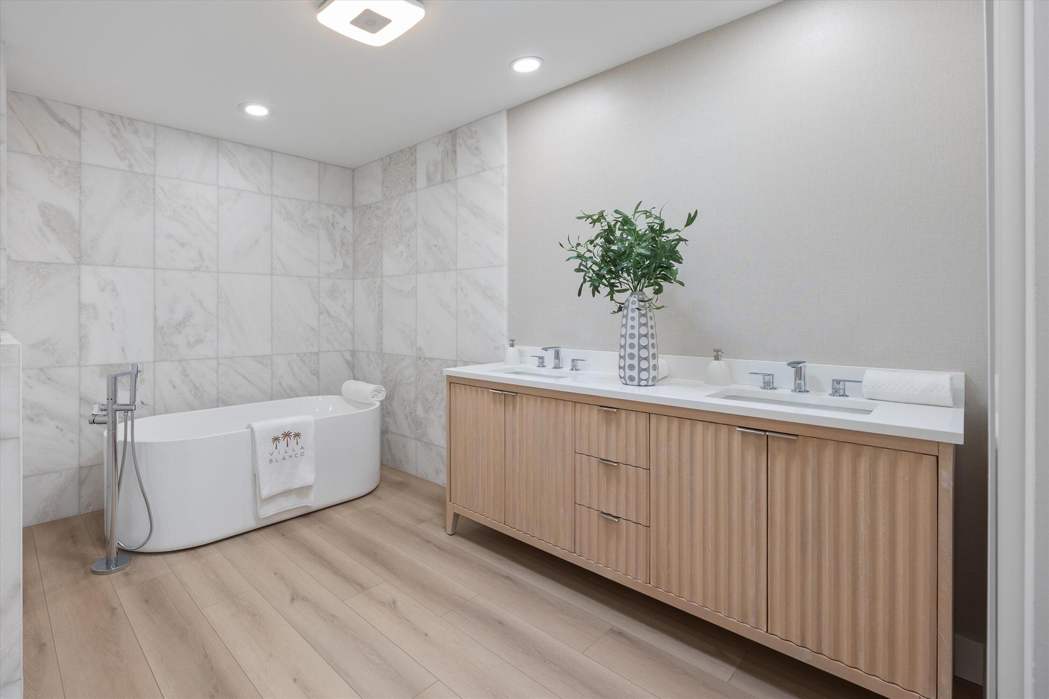 Welcome home to Villa Blanco, located in the coveted River community at The Bluffs. This reimagined three-bedroom, two-bath + loft single-family residence embodies the essence of a luxury villa, exuding a timeless, tropical modern ambiance. The custom finishes in this home are unprecedented for The Bluffs, making Villa Blanco the closest experience to new construction you'll find within this community. Prepare to fall in love the moment you step inside. Valuted ceilings, skylights, and numerous sliding doors offer beautiful natural light, complementing the tropical earth-toned finishes and timeless marbles. This full renovation was completed in October 2025 and has not been lived in since completion. The River at the Bluffs offers a community pool, playground, tennis and pickleball.