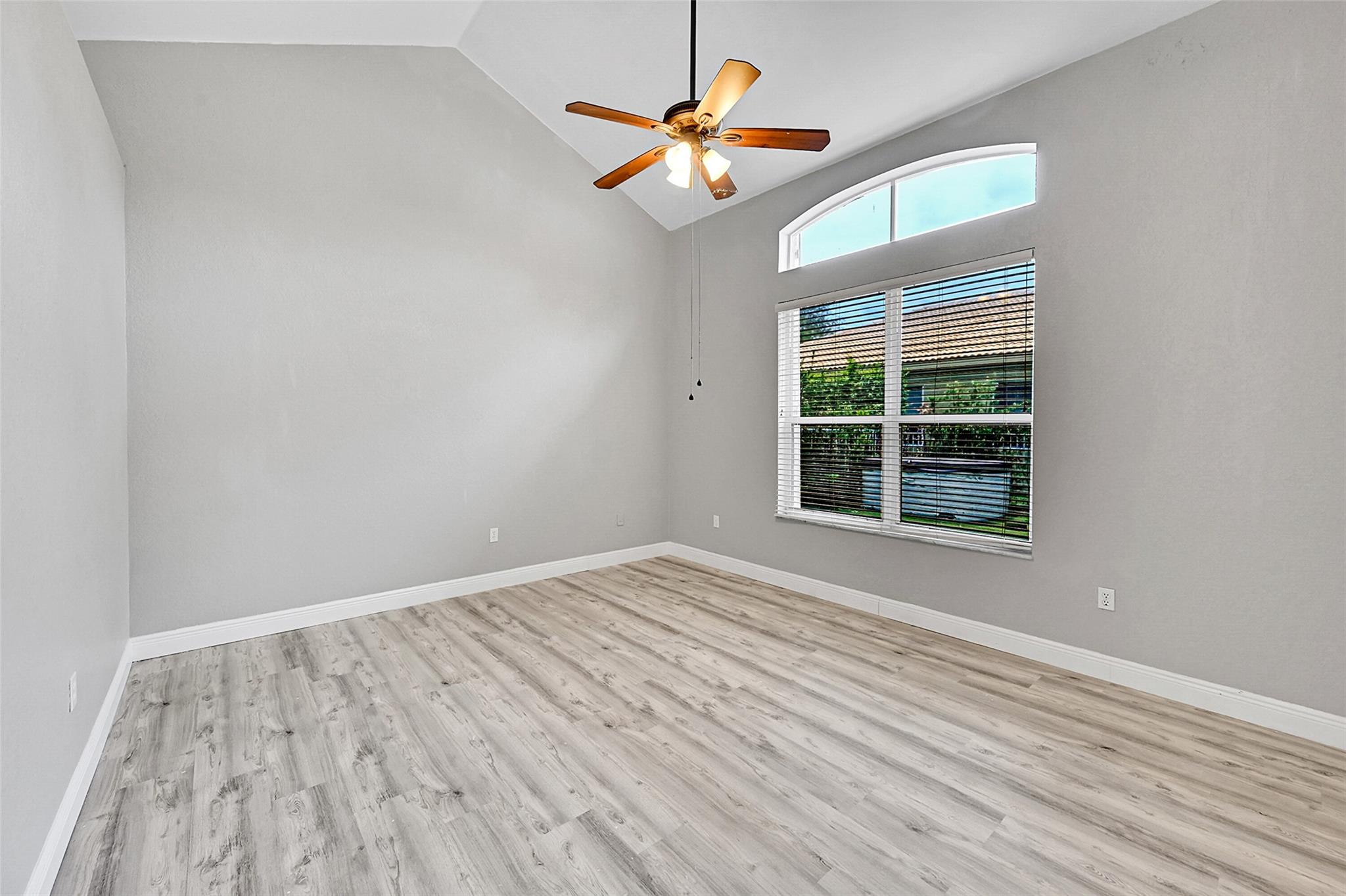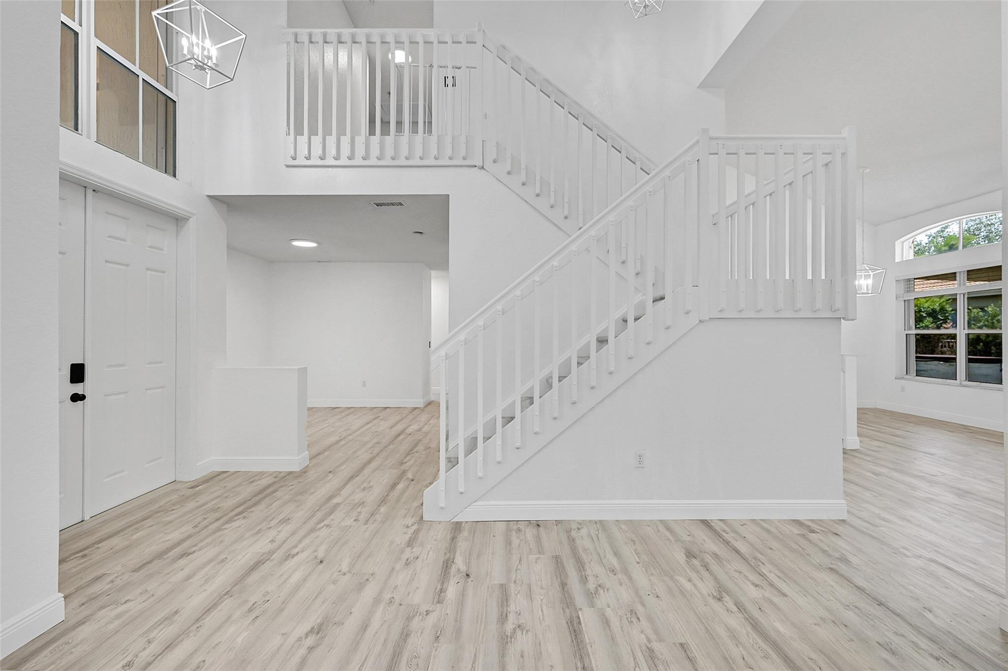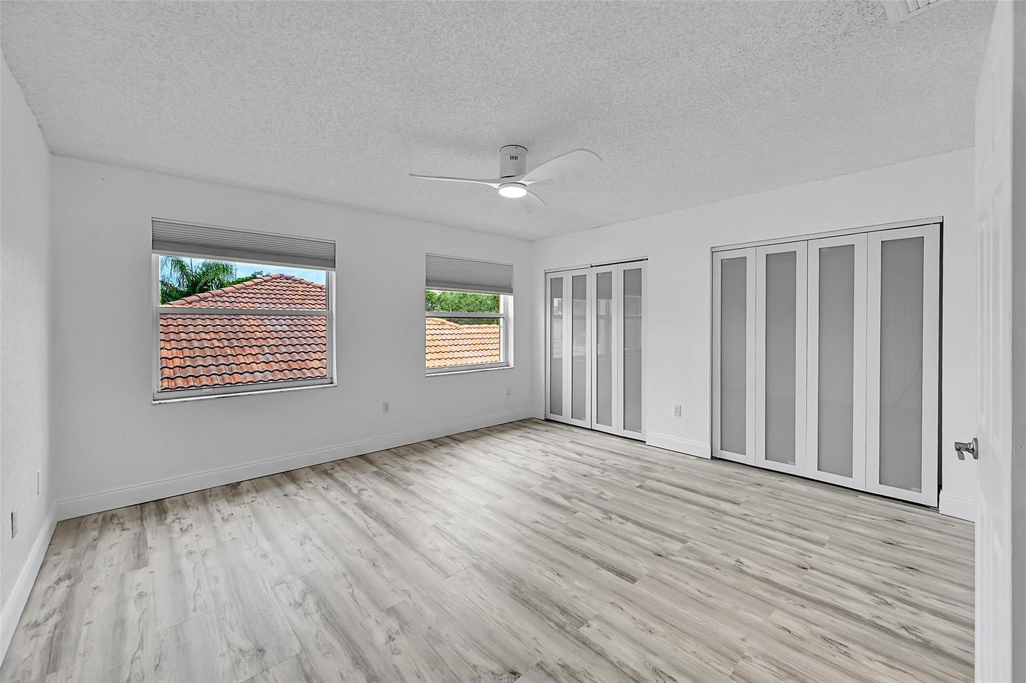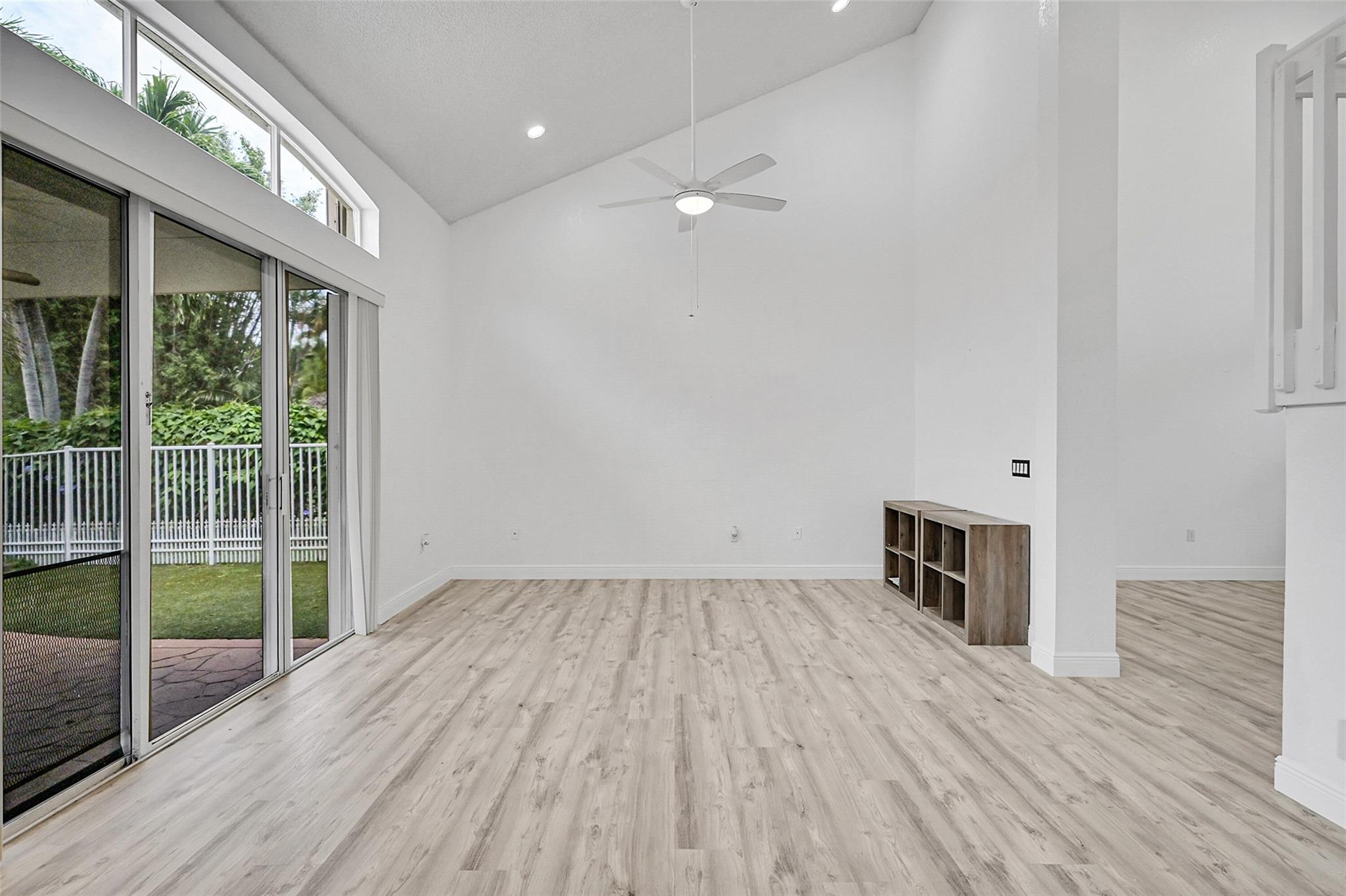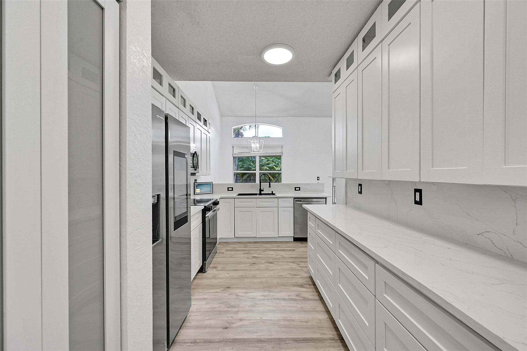 Live the dream in this beautifully updated 4/3.5 home in a gated community with a 3-car garage & lake views. 2 Primary bedrooms with bathrooms. Enjoy a first-floor primary suite, newly remodeled modern white kitchen with quartz counters and brand-new SS Samsung Bespoke appliances. Soaring ceilings, luxury waterproof laminate flooring throughout with lifetime warranty. Completely upgraded bathrooms, & hurricane shutters. Perfect for multigenerational living with a 2nd primary like En suite upstairs. Relax in the fenced backyard with your covered patio & room for a pool. Backyard lawn is professional artificial turf with lifetime warranty. Located on a quiet cul-de-sac with access to community pool, gym, fast 2Gig internet & more. Not in a flood zone! Accordion Shutters for your protection.