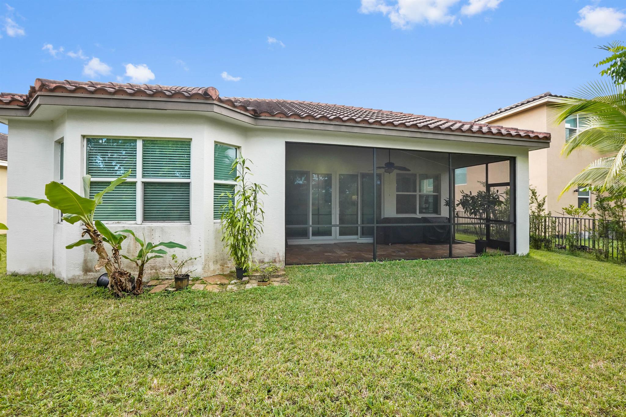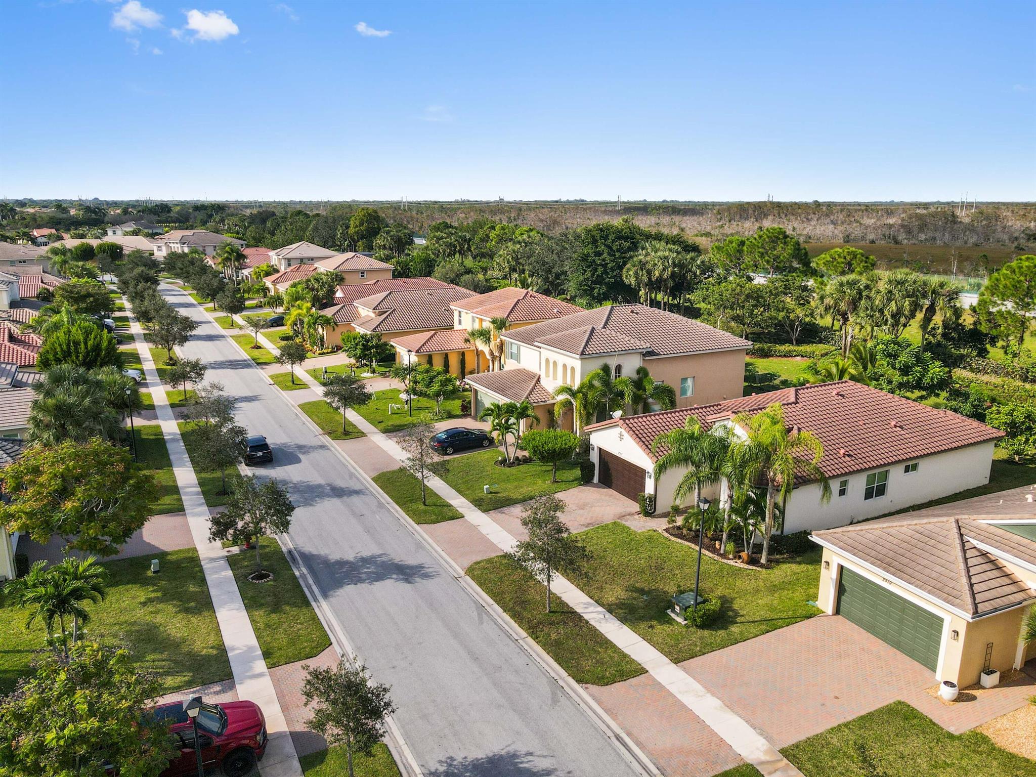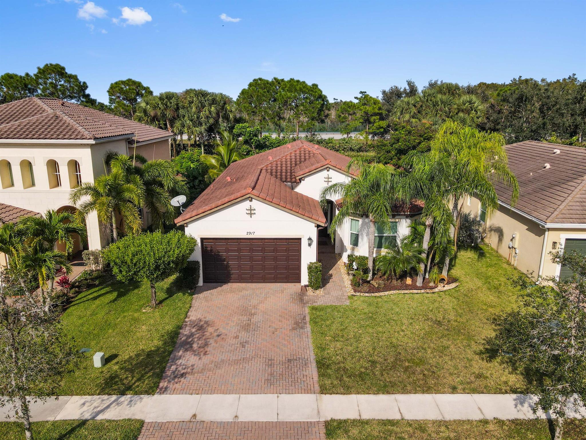 Welcome to this stunning single-family home, perfectly situated on a quiet circle in the desirable gated community of Portosol in Royal Palm Beach. The residence offers 3 bedrooms and 2 bathrooms with exceptional curb appeal, featuring attractive Mediterranean architecture with a tile roof, impact windoews a paver driveway, and lush tropical landscaping. A spacious, arch-covered entry leads to an elegant dark wood front door, setting a sophisticated tone from the moment you arrive.