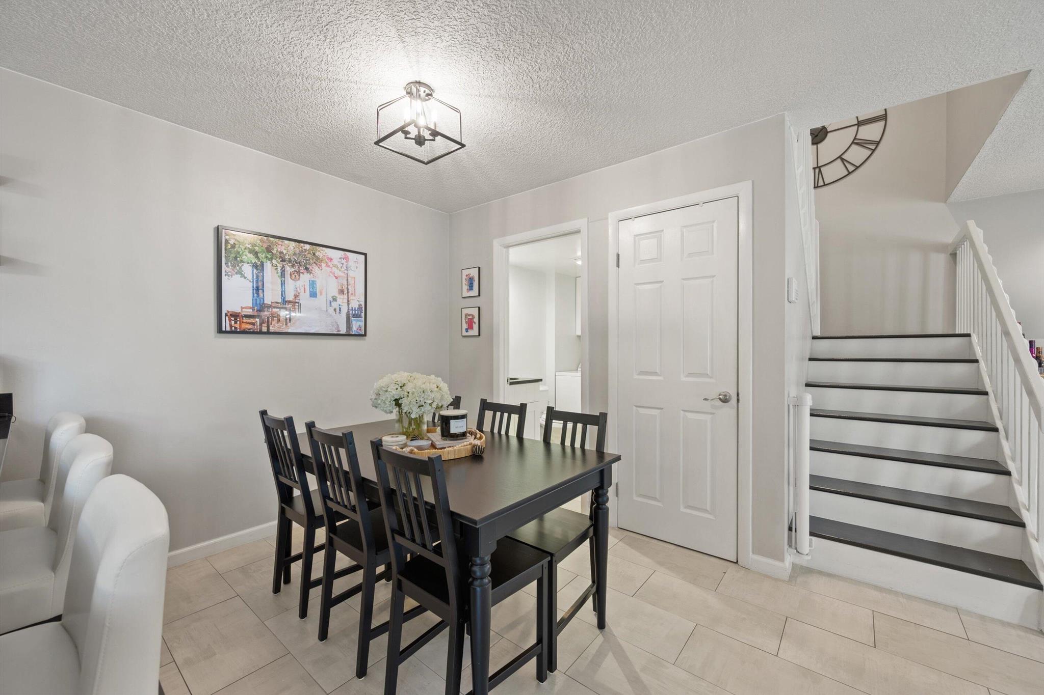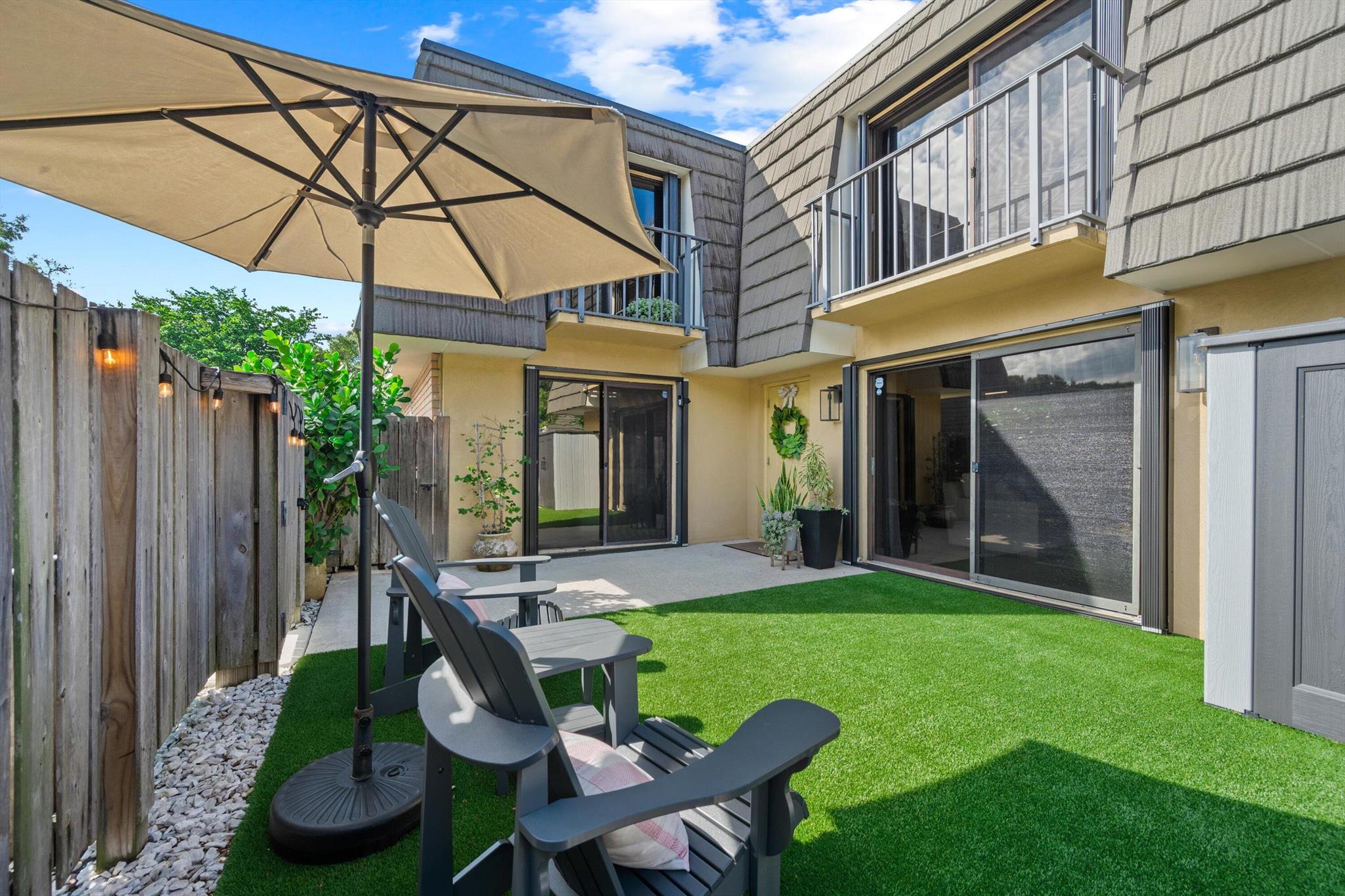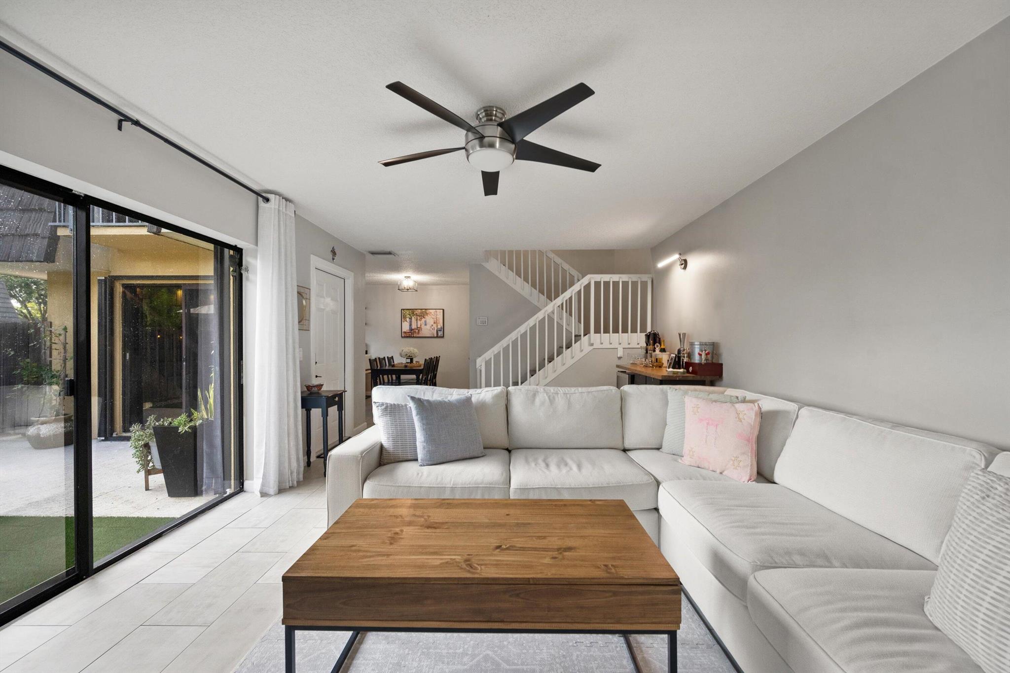 Come past the gate and find yourself in a private patio oasis perfect for entertaining and afternoon relaxation. New pet friendly high end turf area and spacious shed along with 3M film on all sliders, new 2024 accordion shutters and impact door for added convenience, full insurance mitigation credit, and peace of mind. Inside you will find a spacious living area with modern neutral tiles throughout, knockdown ceiling, newly redone wood staircase, and renovated modern kitchen with stainless steel appliances, one-level countertop island with huge workspace and bar style seating, white cabinets and open modern feel with additional dining area. Laundry room with new 2022 washer/dryer, added cabinets and updated powder room with additional storage round off the first floor.