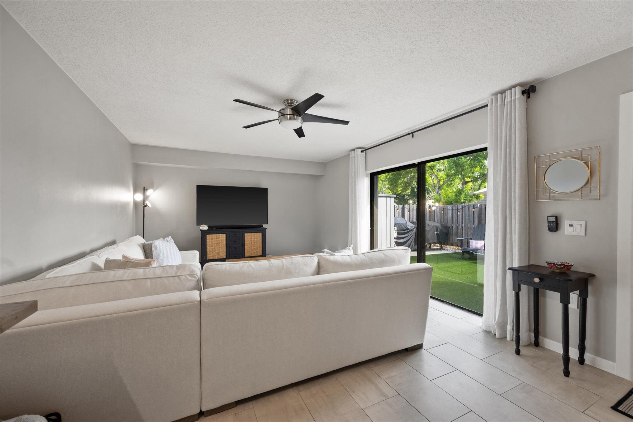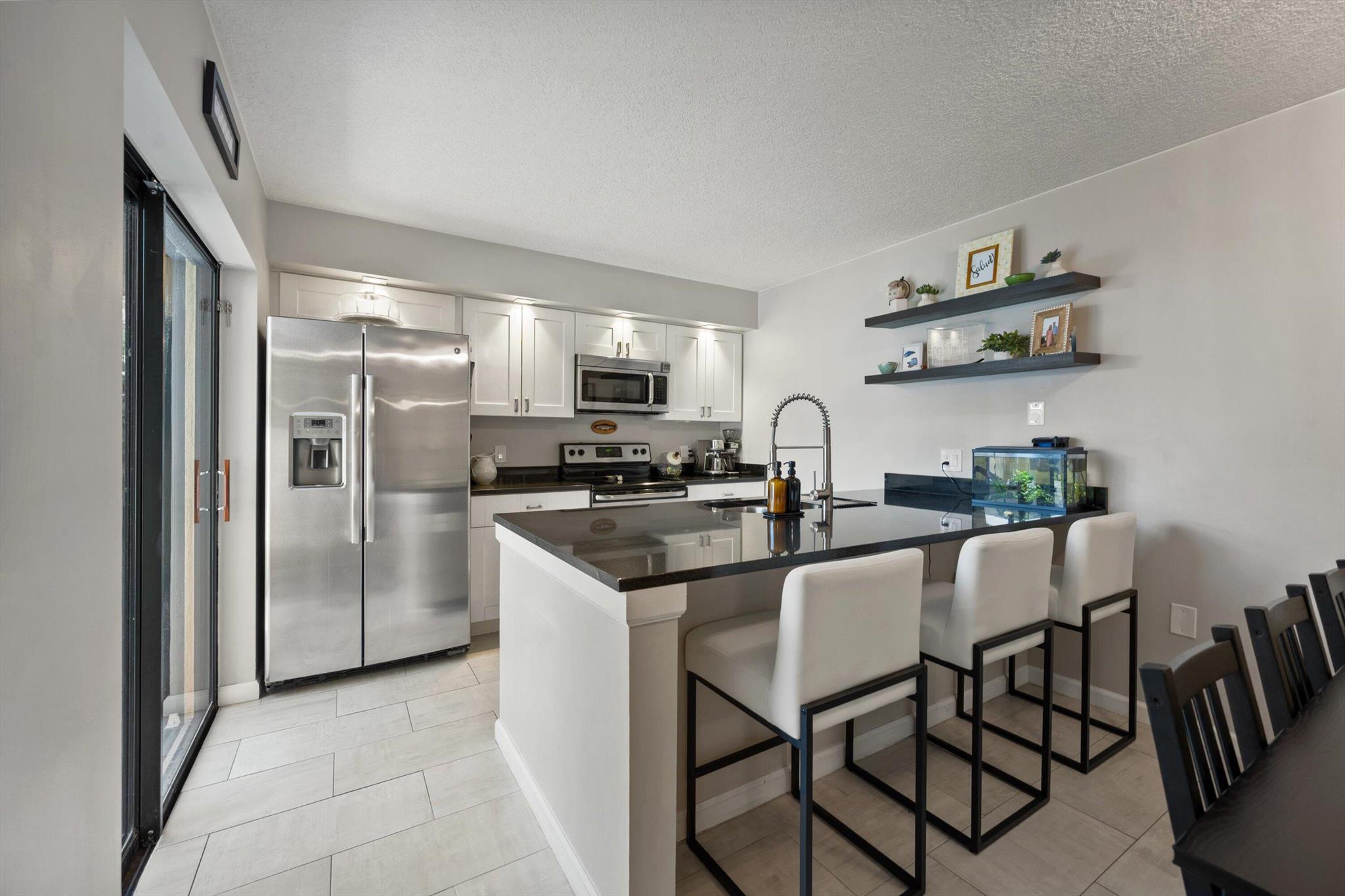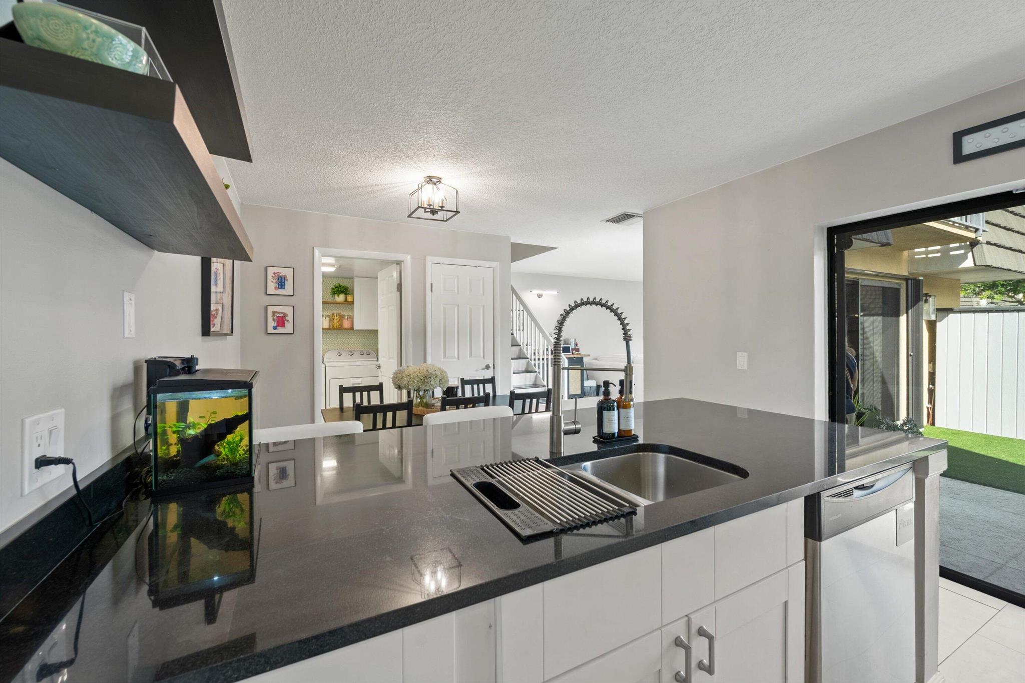 Come past the gate and find yourself in a private patio oasis perfect for entertaining and afternoon relaxation. New pet friendly high end turf area and spacious shed along with 3M film on all sliders, new 2024 accordion shutters and impact door for added convenience, full insurance mitigation credit, and peace of mind. Inside you will find a spacious living area with modern neutral tiles throughout, knockdown ceiling, newly redone wood staircase, and renovated modern kitchen with stainless steel appliances, one-level countertop island with huge workspace and bar style seating, white cabinets and open modern feel with additional dining area. Laundry room with new 2022 washer/dryer, added cabinets and updated powder room with additional storage round off the first floor.