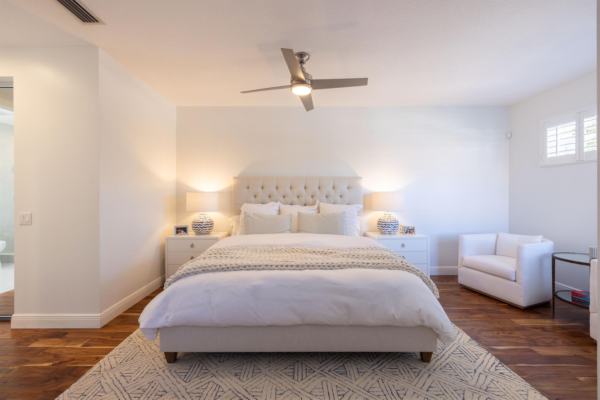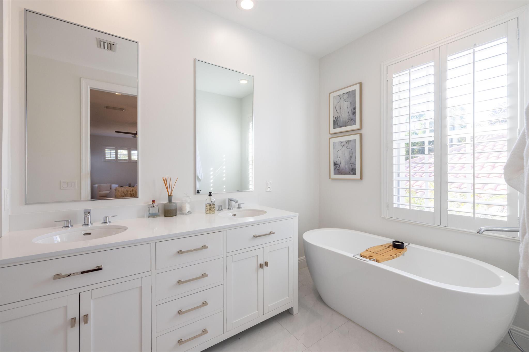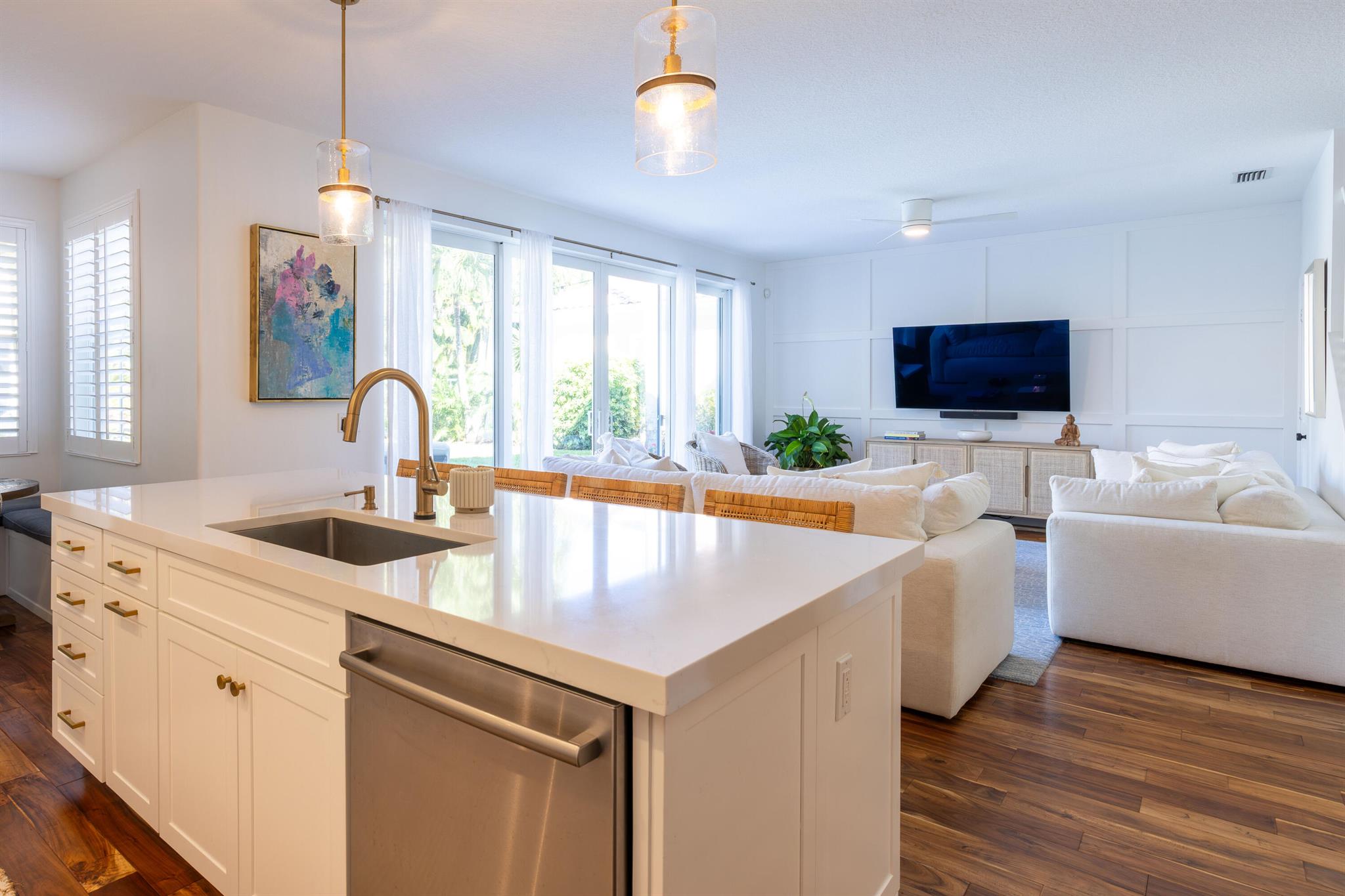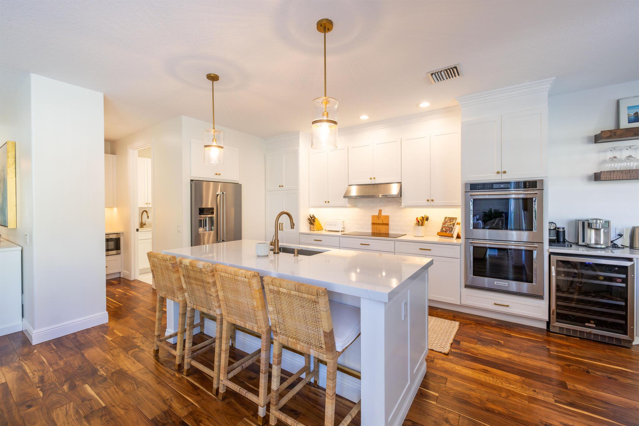 This stunning renovated 4-bedroom, 3-bathroom residence with a dedicated office seamlessly blends sophistication, comfort, and functionality. The chef's kitchen is a true centerpiece, featuring custom wood cabinetry with detailed moldings, under-cabinet lighting, quartz countertops, double oven, microwave drawer, and a distinctive butler's pantry for added storage and style. The primary suite offers a spa-inspired bathroom with large-format porcelain tile, a freestanding soaking tub, a Restoration Hardware vanity, a Toto toilet, and sleek Grohe fixtures. Step outside to your private, fenced oasis; a beautifully designed backyard with a sparkling pool, integrated spa, and elegant leathered travertine decking surrounded by gorgeous tropical landscaping which offers both beauty and privacy.