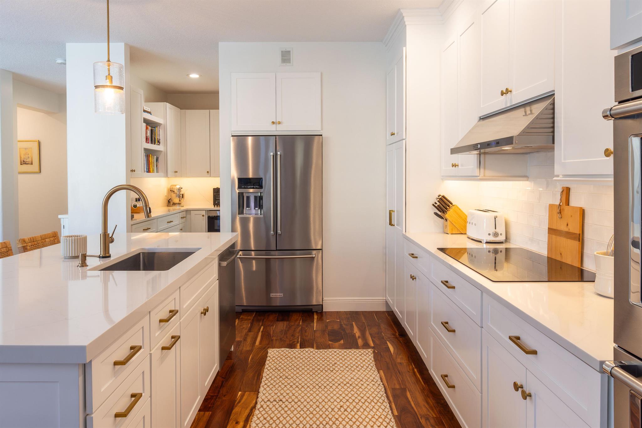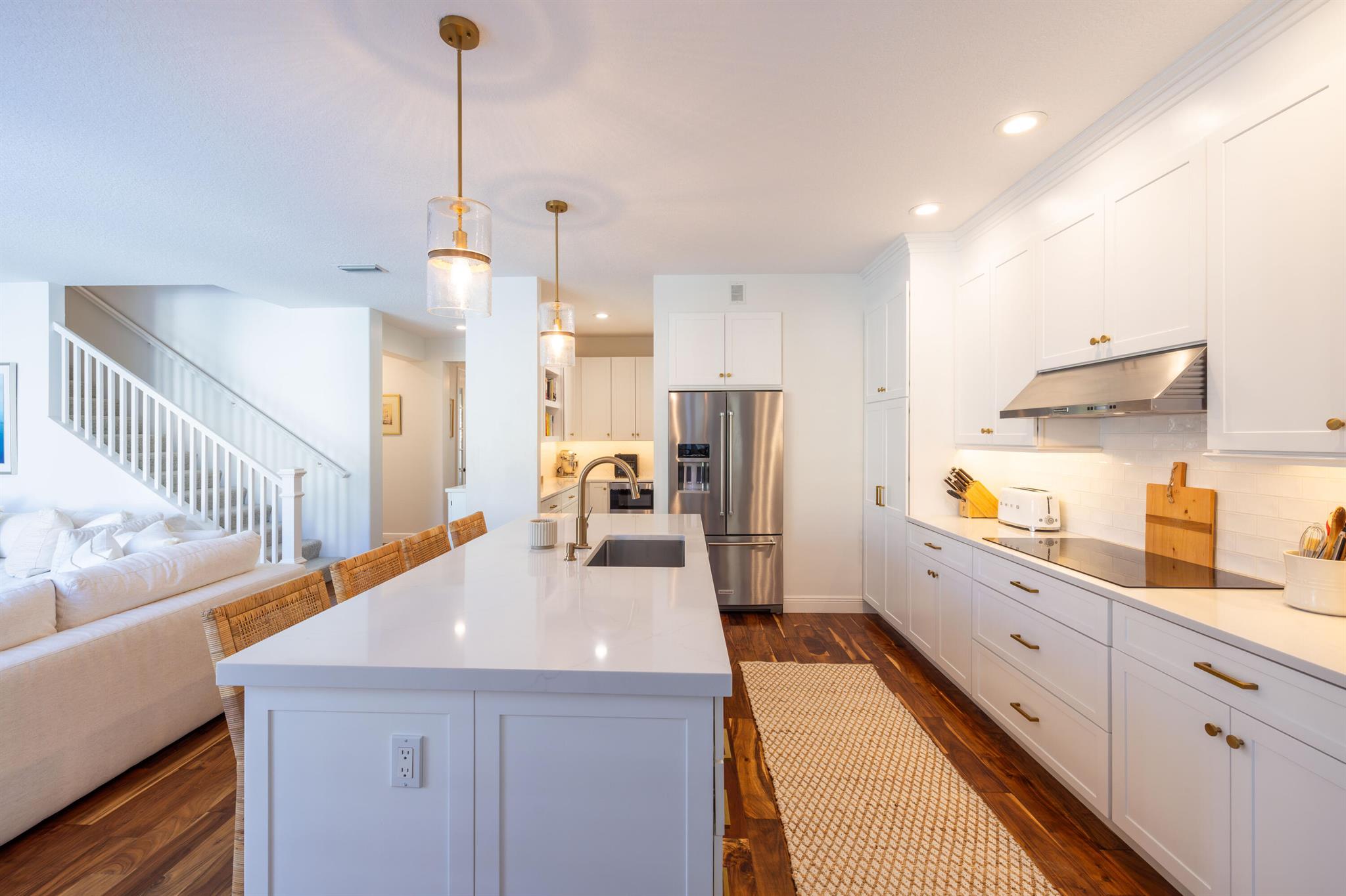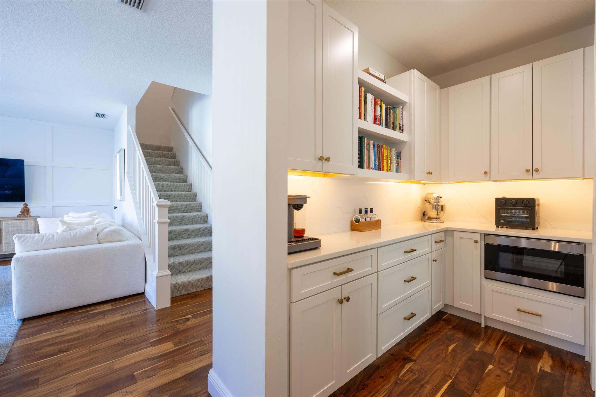 This stunning renovated 4-bedroom, 3-bathroom residence with a dedicated office seamlessly blends sophistication, comfort, and functionality. The chef's kitchen is a true centerpiece, featuring custom wood cabinetry with detailed moldings, under-cabinet lighting, quartz countertops, double oven, microwave drawer, and a distinctive butler's pantry for added storage and style. The primary suite offers a spa-inspired bathroom with large-format porcelain tile, a freestanding soaking tub, a Restoration Hardware vanity, a Toto toilet, and sleek Grohe fixtures. Step outside to your private, fenced oasis; a beautifully designed backyard with a sparkling pool, integrated spa, and elegant leathered travertine decking surrounded by gorgeous tropical landscaping which offers both beauty and privacy.