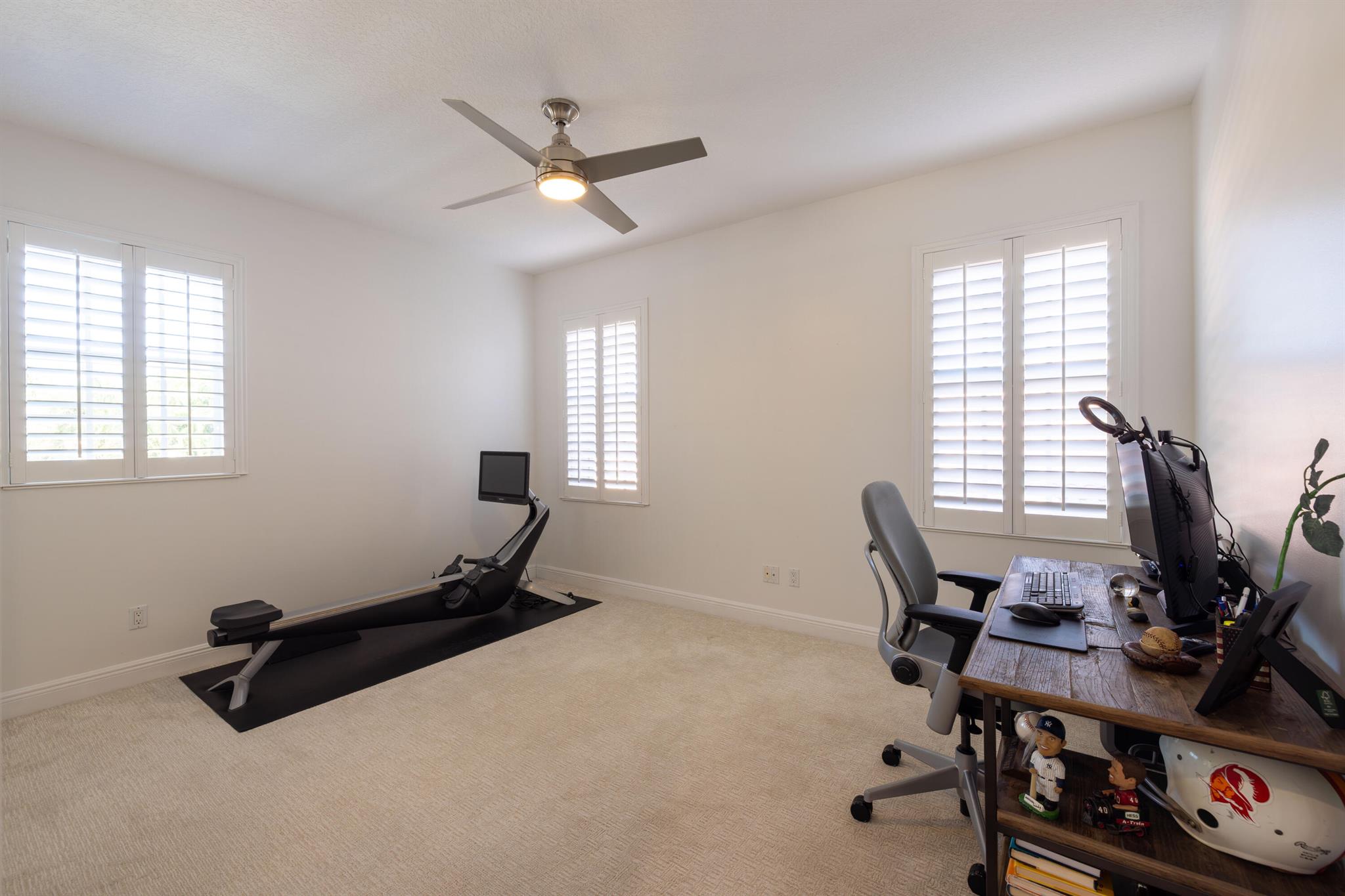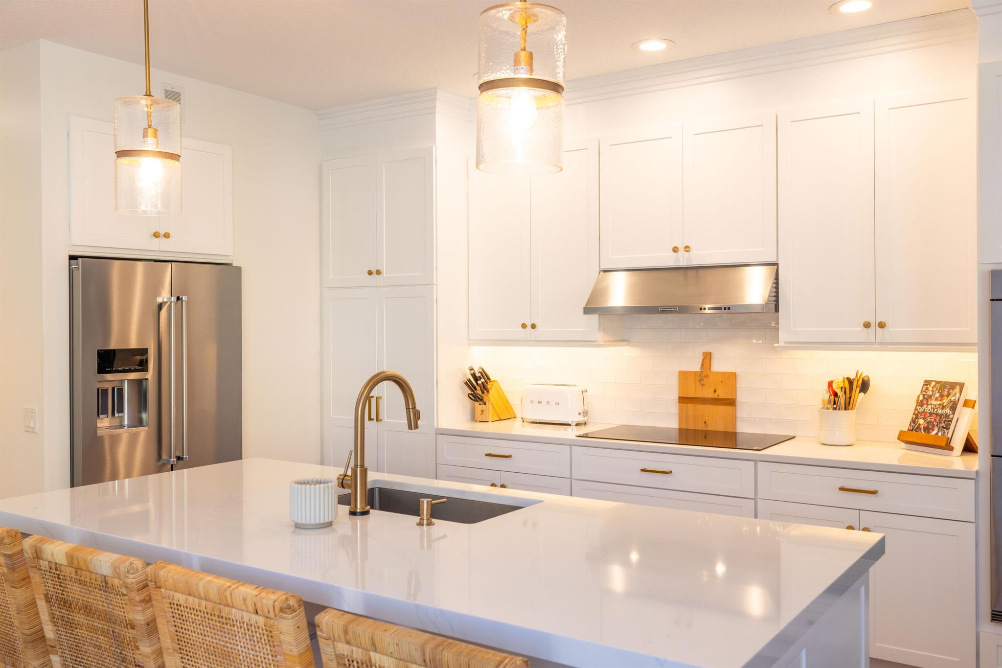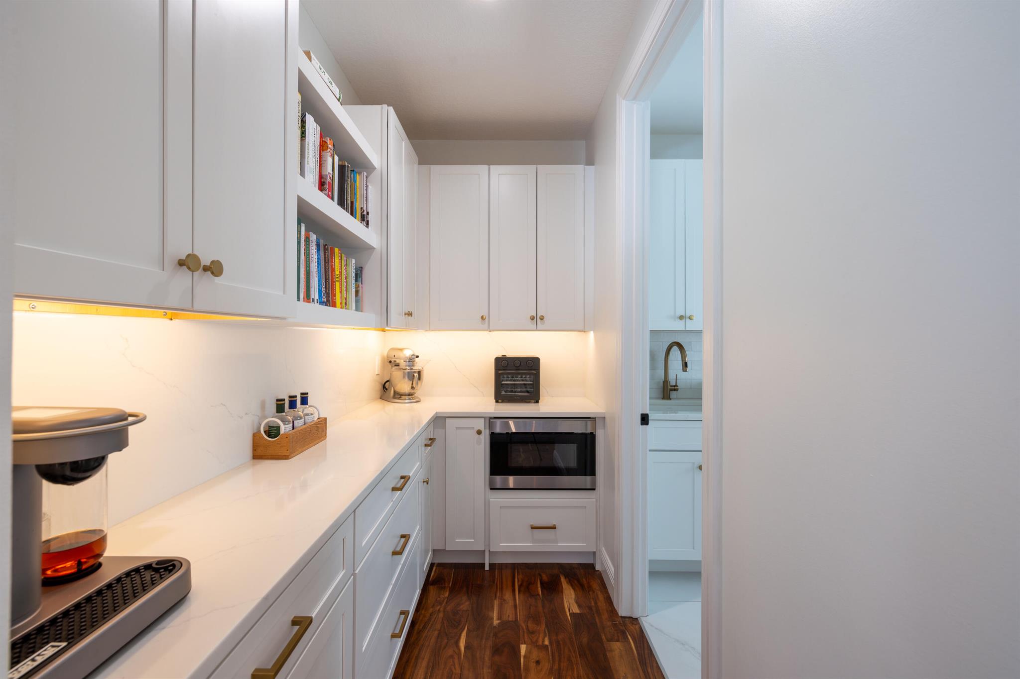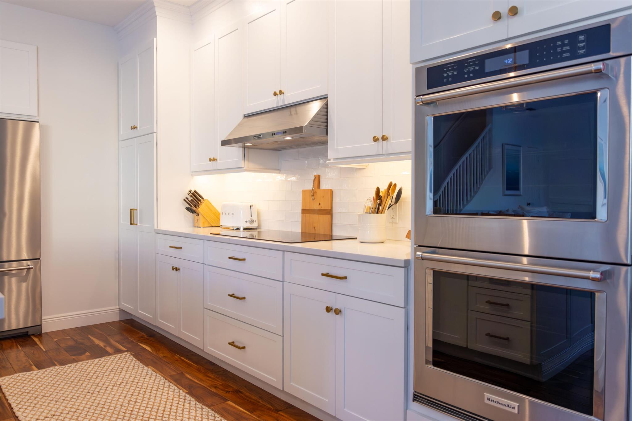 This stunning renovated 4-bedroom, 3-bathroom residence with a dedicated office seamlessly blends sophistication, comfort, and functionality. The chef's kitchen is a true centerpiece, featuring custom wood cabinetry with detailed moldings, under-cabinet lighting, quartz countertops, double oven, microwave drawer, and a distinctive butler's pantry for added storage and style. The primary suite offers a spa-inspired bathroom with large-format porcelain tile, a freestanding soaking tub, a Restoration Hardware vanity, a Toto toilet, and sleek Grohe fixtures. Step outside to your private, fenced oasis; a beautifully designed backyard with a sparkling pool, integrated spa, and elegant leathered travertine decking surrounded by gorgeous tropical landscaping which offers both beauty and privacy.