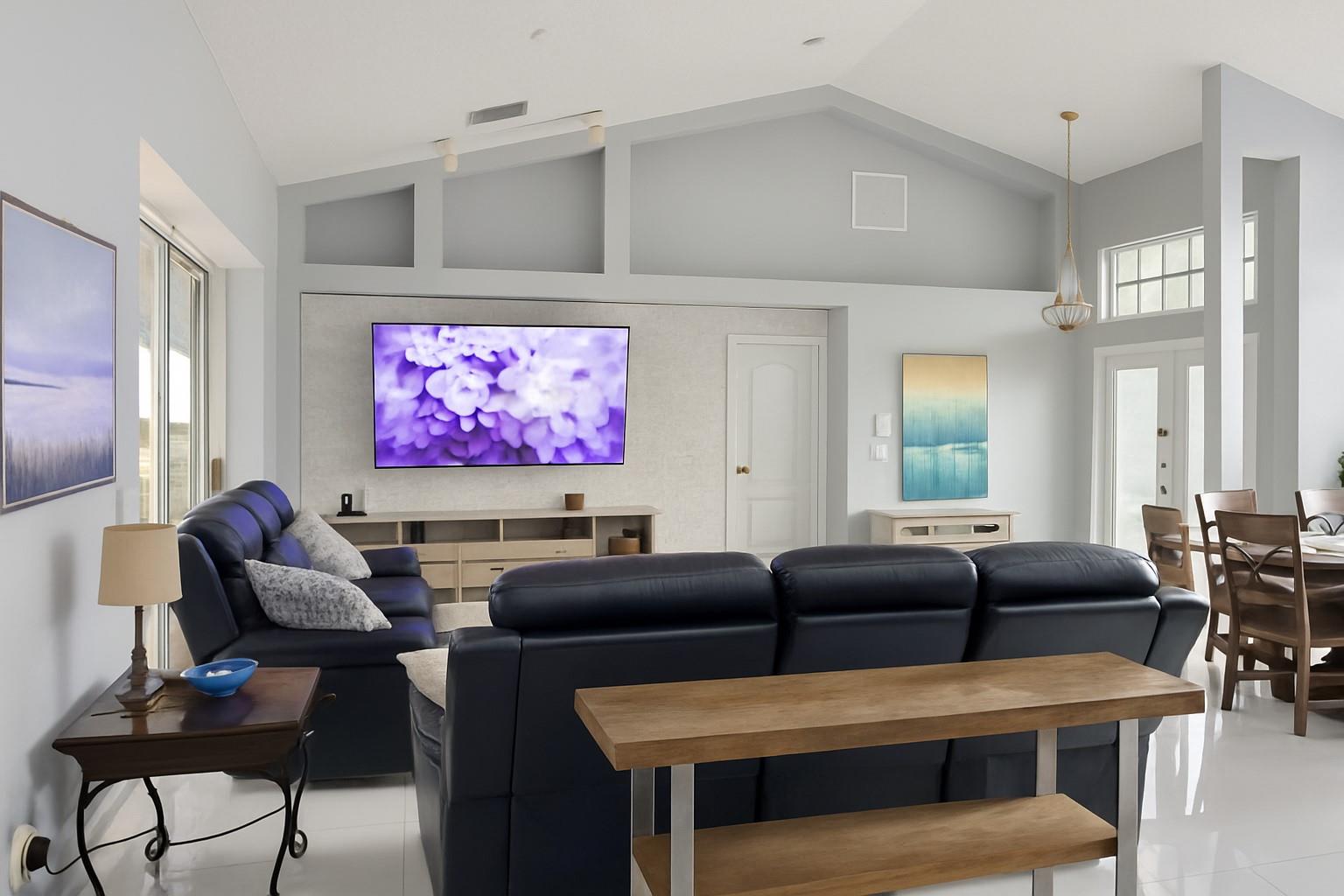 Beautifully updated home with an open-concept layout and modern finishes. The kitchen features white shaker cabinets, granite countertops, stainless steel appliances, and a large island with seating—perfect for entertaining. Enjoy vaulted ceilings, recessed lighting, and glossy porcelain tile floors throughout. The living area includes a custom stone accent wall with a built-in media space. Bright and airy with a neutral palette, this home blends comfort and style. Conveniently located near beaches, shopping, and dining. Den can be used as a 4th bedroom!