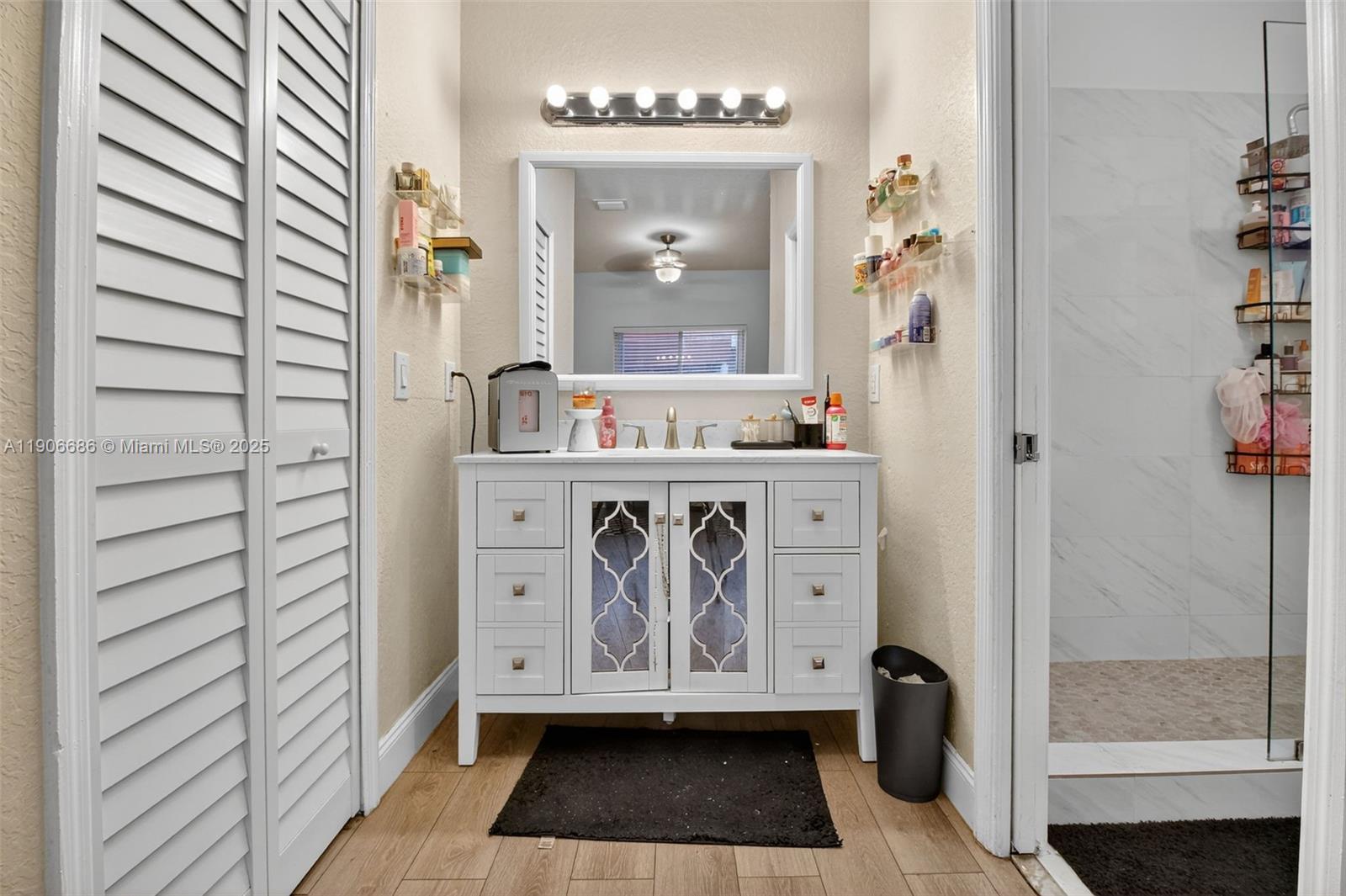 Beautifully remodeled 5-bedroom, 2-bath home featuring a bright open layout and stylish laminate flooring throughout. Enjoy peace of mind with impact doors offering both safety and energy efficiency. Plus, accordion shutters for extra protection in every opening. The updated kitchen and bathrooms add a modern touch, while the converted one-car garage provides additional living space—perfect for a home office, playroom, or guest area. Step outside to a spacious yard ideal for entertaining and family gatherings. Conveniently located near schools, shopping, and major highways. Move-in ready and built to impress! NO HOA and low Property Taxes.