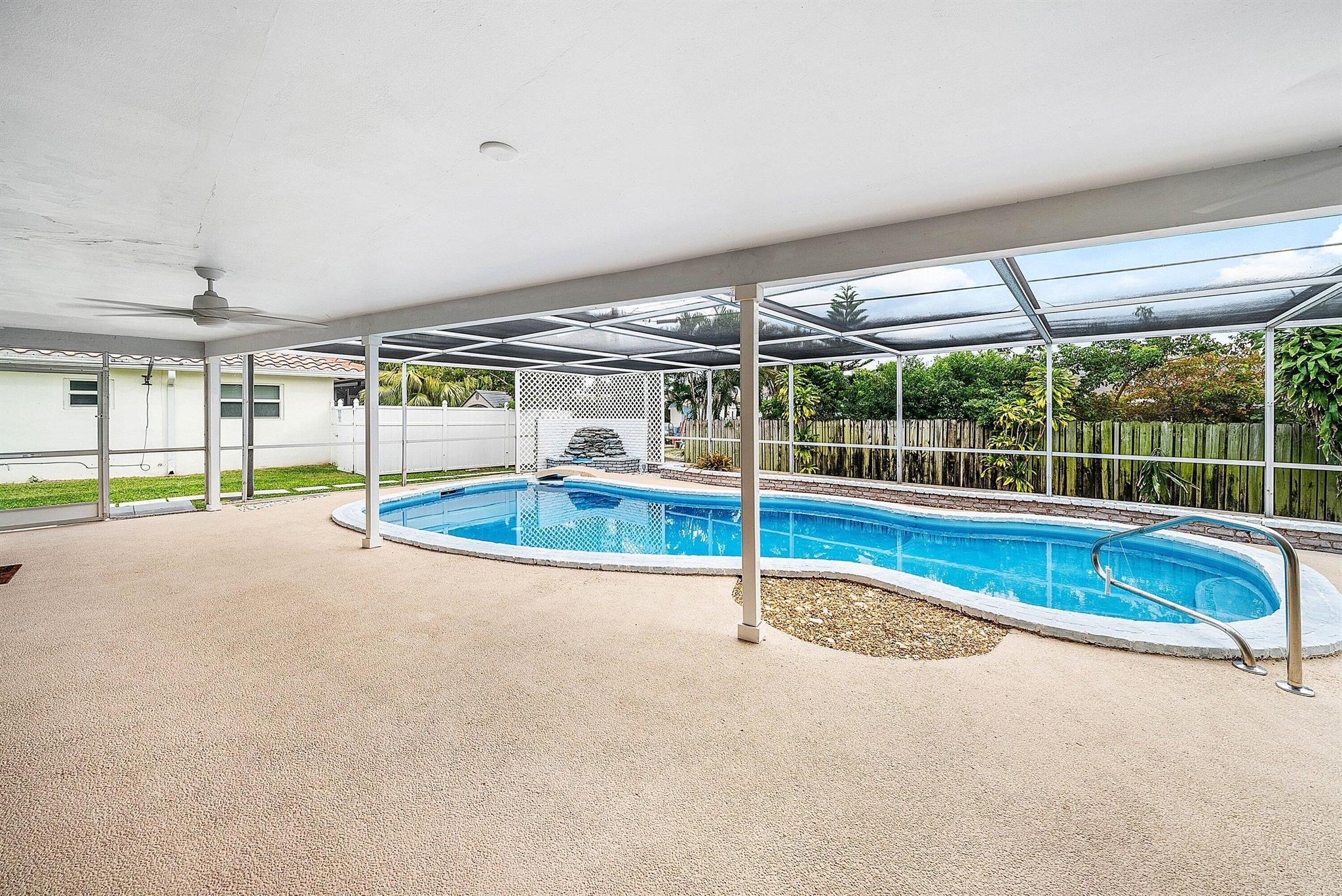 Discover this lovely pool home located in a prime downtown Boca Raton location with no HOA! New roof in 2023 and brand-new floors and fresh paint throughout. This bright, open floor plan offers a split bedroom layout, providing privacy and comfort. The spacious living and dining rooms feature an expansive wall of sliders, creating a seamless indoor-outdoor flow. Enjoy a beautiful kitchen with a convenient pass-through window to outdoor barstool seating. The primary bedroom features a walk-in closet and an upgraded vanity. Enjoy the screened in patio while relaxing by the newly resurfaced pool or gathering around the fire pit. Hurricane panels protect the house during the summer for peace of mind. A circular driveway adds convenience to this beautiful home located on a quiet street.