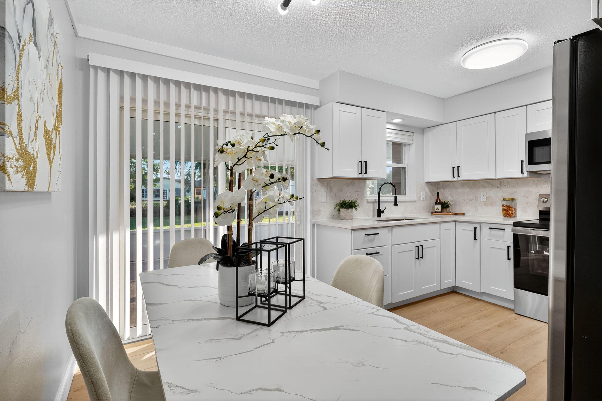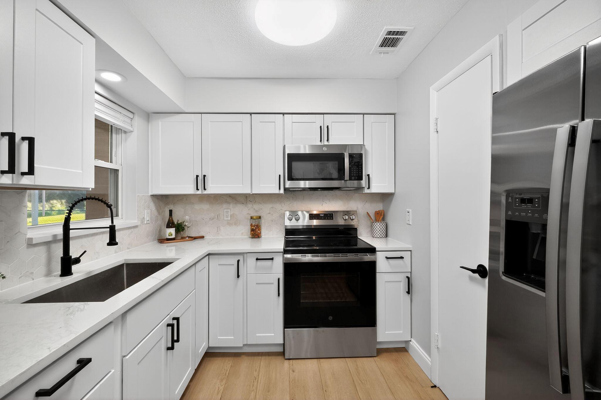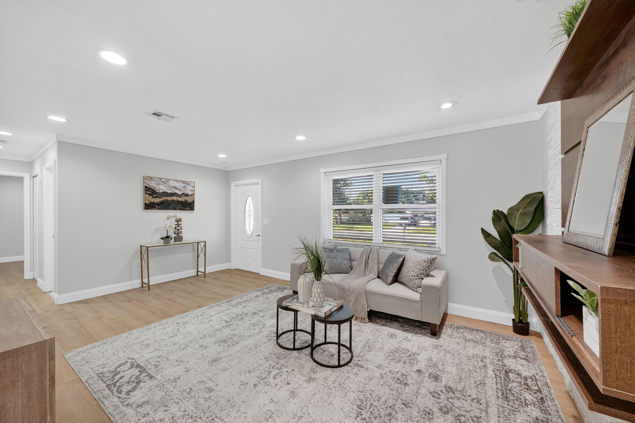 Come see this beautifully remodeled 2 bedroom/1 bathroom concrete-block home with a large, covered lanai in the back, a fenced-in yard and extra storage shed! New exterior and interior paint, refinished driveway, stunning interior upgrades including new luxury vinyl flooring throughout, ALL NEW Kitchen with new cabinets, backsplash, quartz countertops and stainless-steel appliances. Gorgeous accent wall in the living room gives the home a cozy feeling. Fully remodeled bathroom with a new tub, toilet, vanity, mirror and retiled shower. BRAND NEW 2025 ROOF! NO HOA. Schedule a showing now!