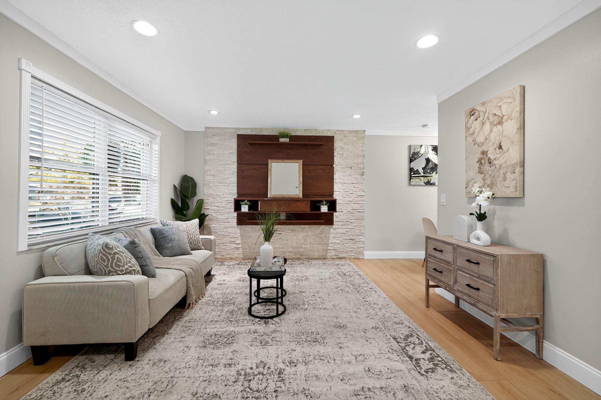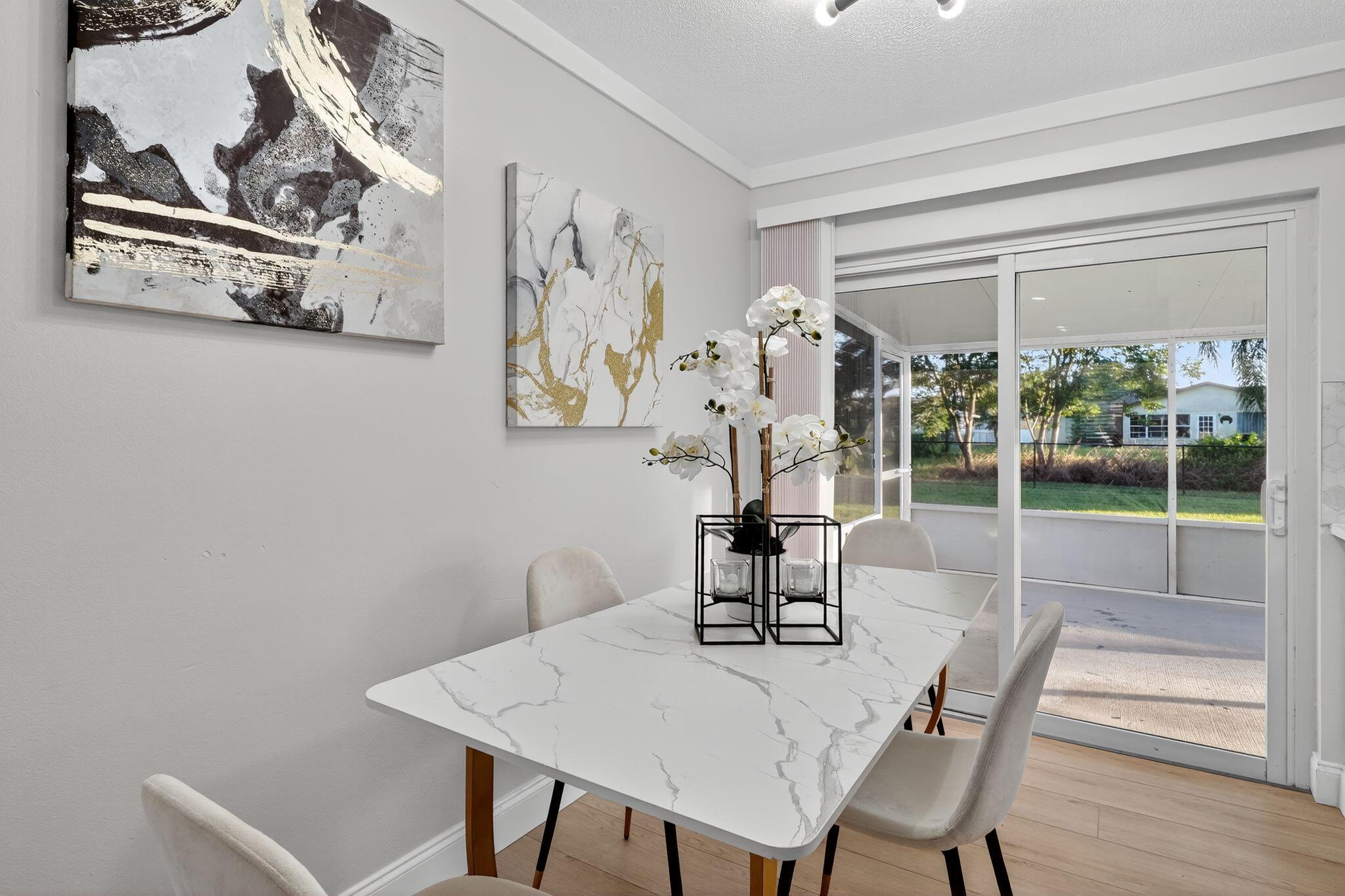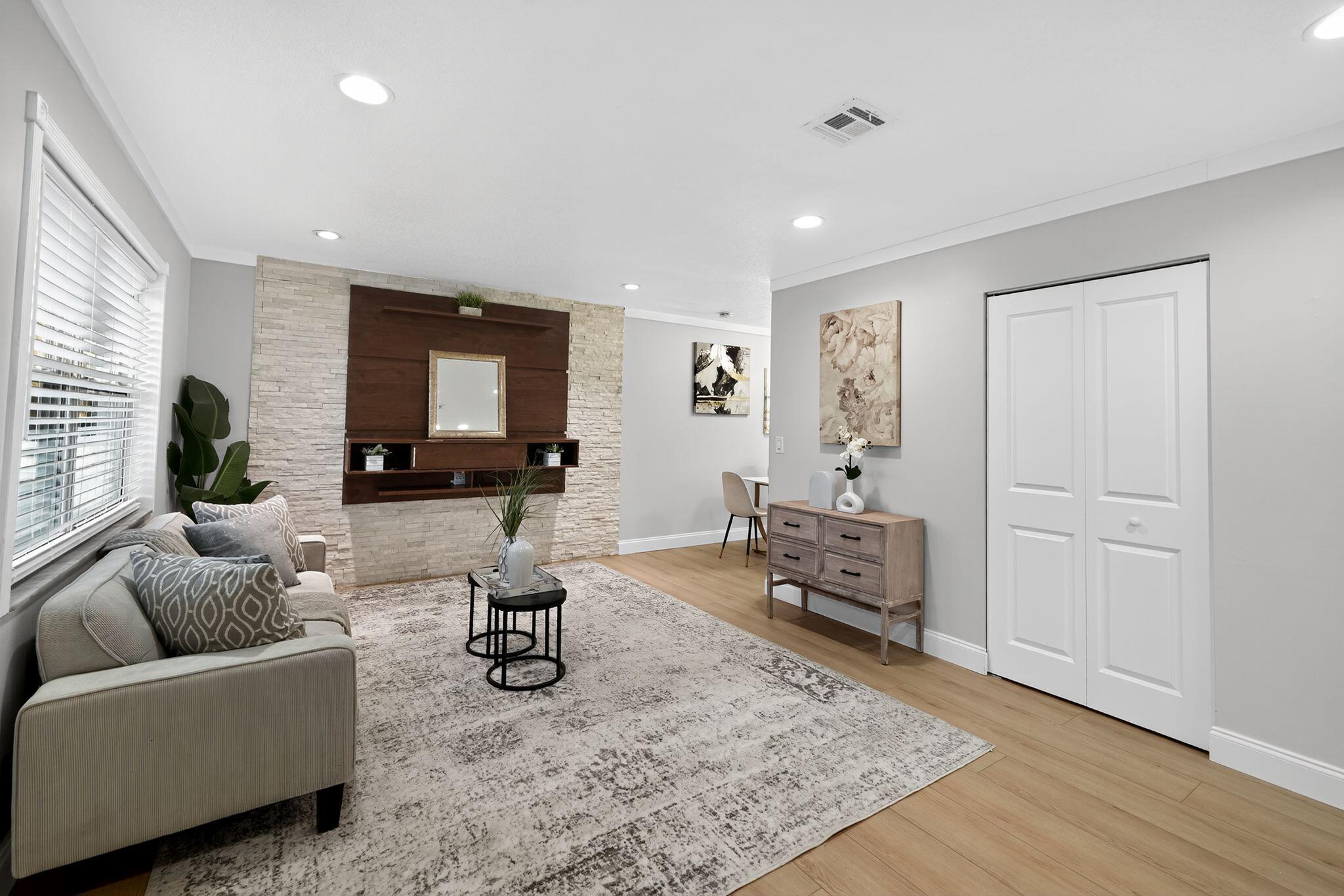 Come see this beautifully remodeled 2 bedroom/1 bathroom concrete-block home with a large, covered lanai in the back, a fenced-in yard and extra storage shed! New exterior and interior paint, refinished driveway, stunning interior upgrades including new luxury vinyl flooring throughout, ALL NEW Kitchen with new cabinets, backsplash, quartz countertops and stainless-steel appliances. Gorgeous accent wall in the living room gives the home a cozy feeling. Fully remodeled bathroom with a new tub, toilet, vanity, mirror and retiled shower. BRAND NEW 2025 ROOF! NO HOA. Schedule a showing now!