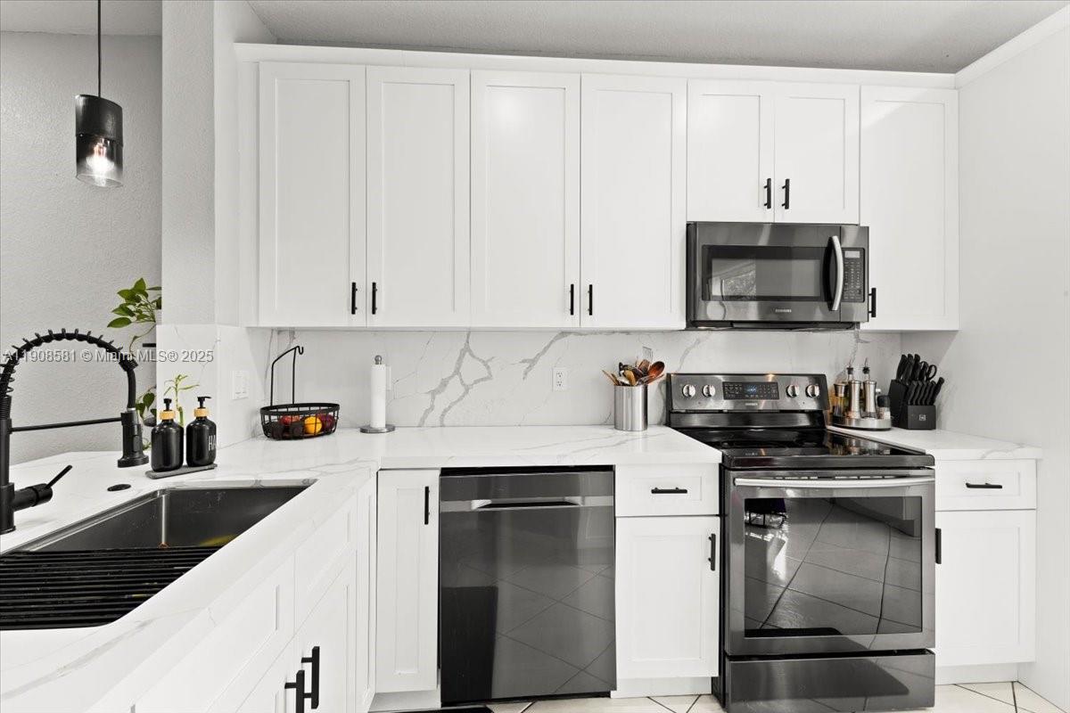 Gorgeous 3 Bed / 2.5 Bath townhouse offering over 1,400 sq. ft. of comfortable living space. This home features neutral tile flooring on the first floor and elegant wood floors upstairs. The bright, fully renovated kitchen boasts all-white cabinetry, matching Whirlpool appliances, and a modern design perfect for any home chef. Enjoy peace of mind with impact windows, a brand-new roof, and a private one-car garage with a driveway for 2 vehicles. The spacious master suite includes a large walk-in closet and a luxurious Roman tub. Full-size washer and dryer included. Community amenities feature gated entry with security cameras, two heated pools, and a playground. Pets are welcome. FHA/VA approved.