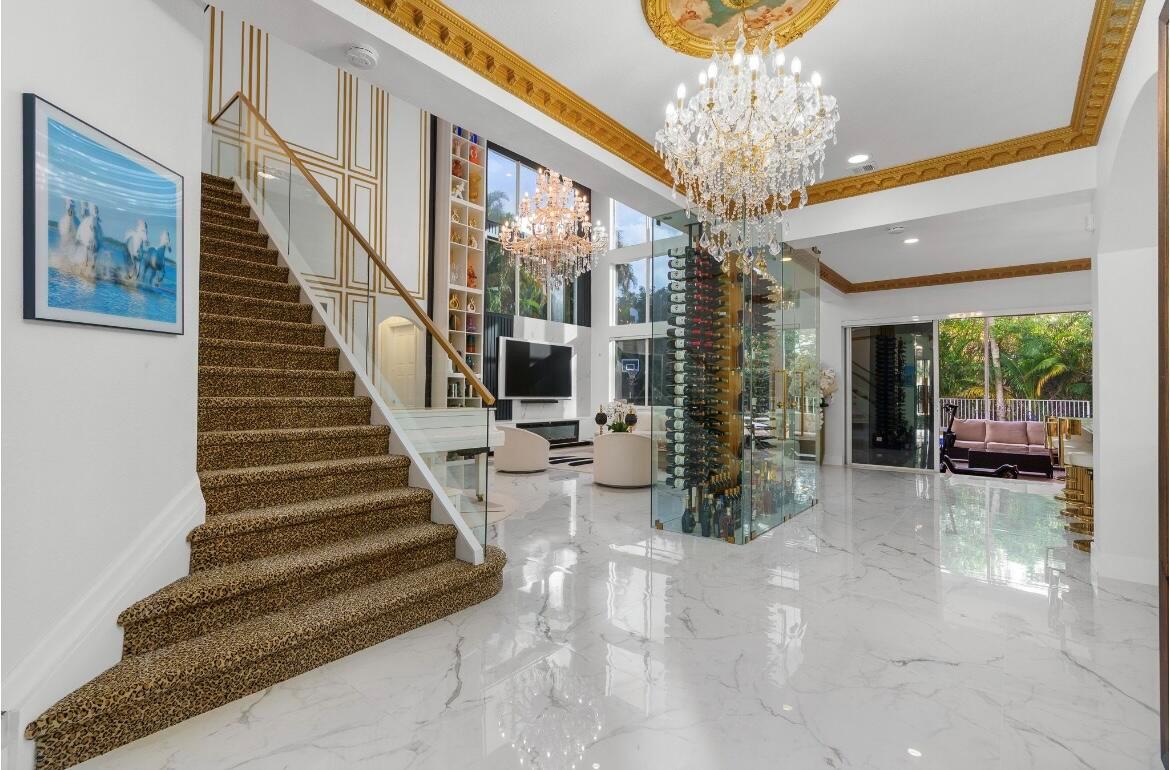 This exquisite home offers an open floor plan with high-end upgrades throughout. The main level features new 32''x32'' white and gray porcelain tile, glass stair railings, crown moldings, and a renovated kitchen and guest bath. A custom 300-bottle wine cellar adds sophistication. Recent updates include a resurfaced pool and new carpet on the stairs and all upstairs bedrooms. A first-floor den or office with a full bath provides flexibility. Enjoy lush landscaping, a beautiful pool, a covered screened patio, and a private screened balcony off the primary suite.