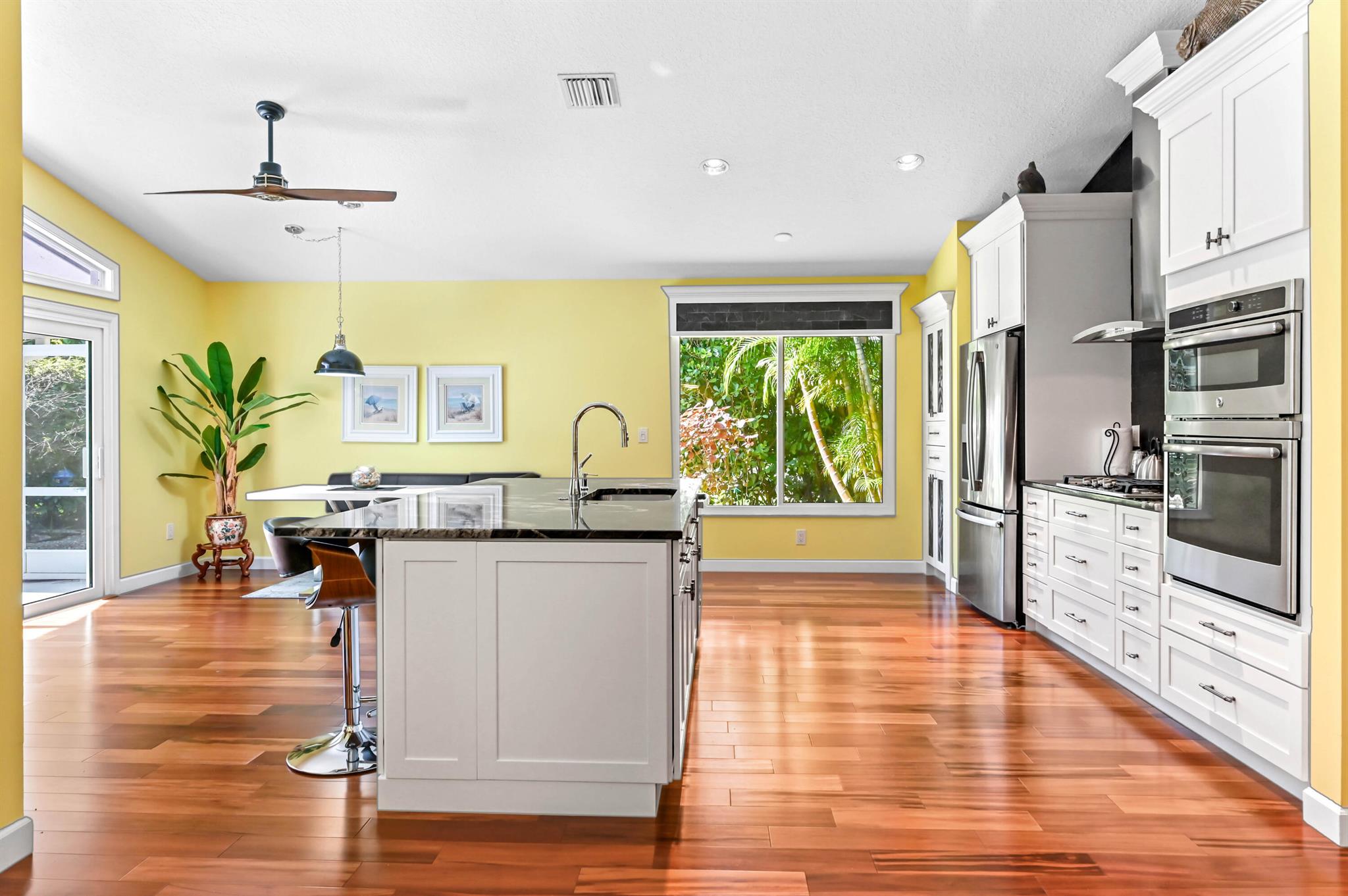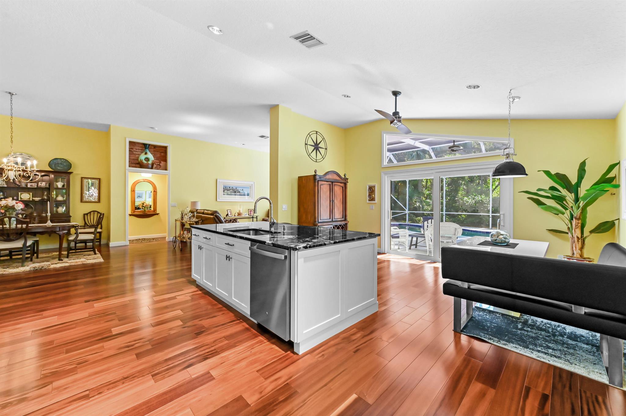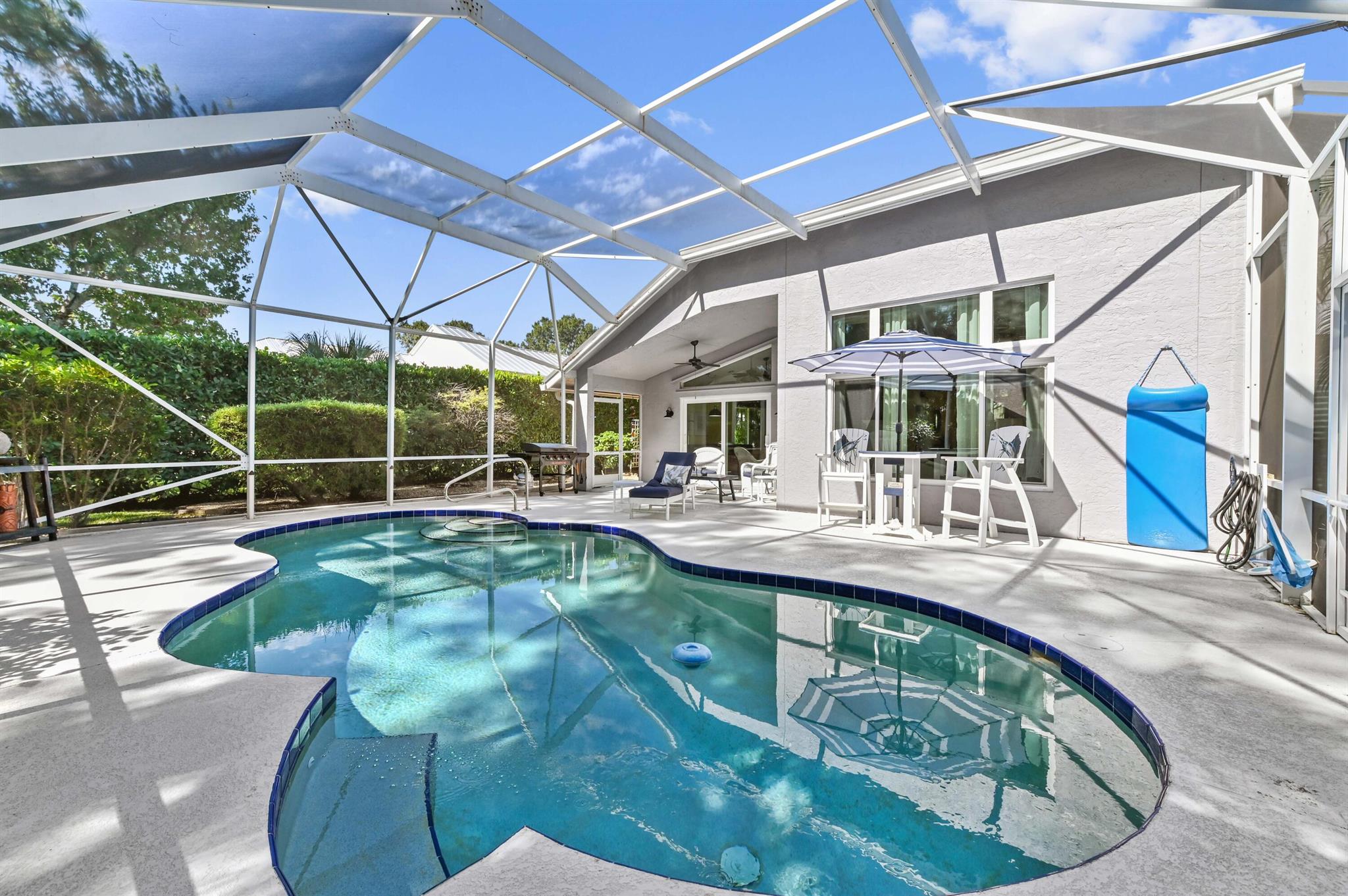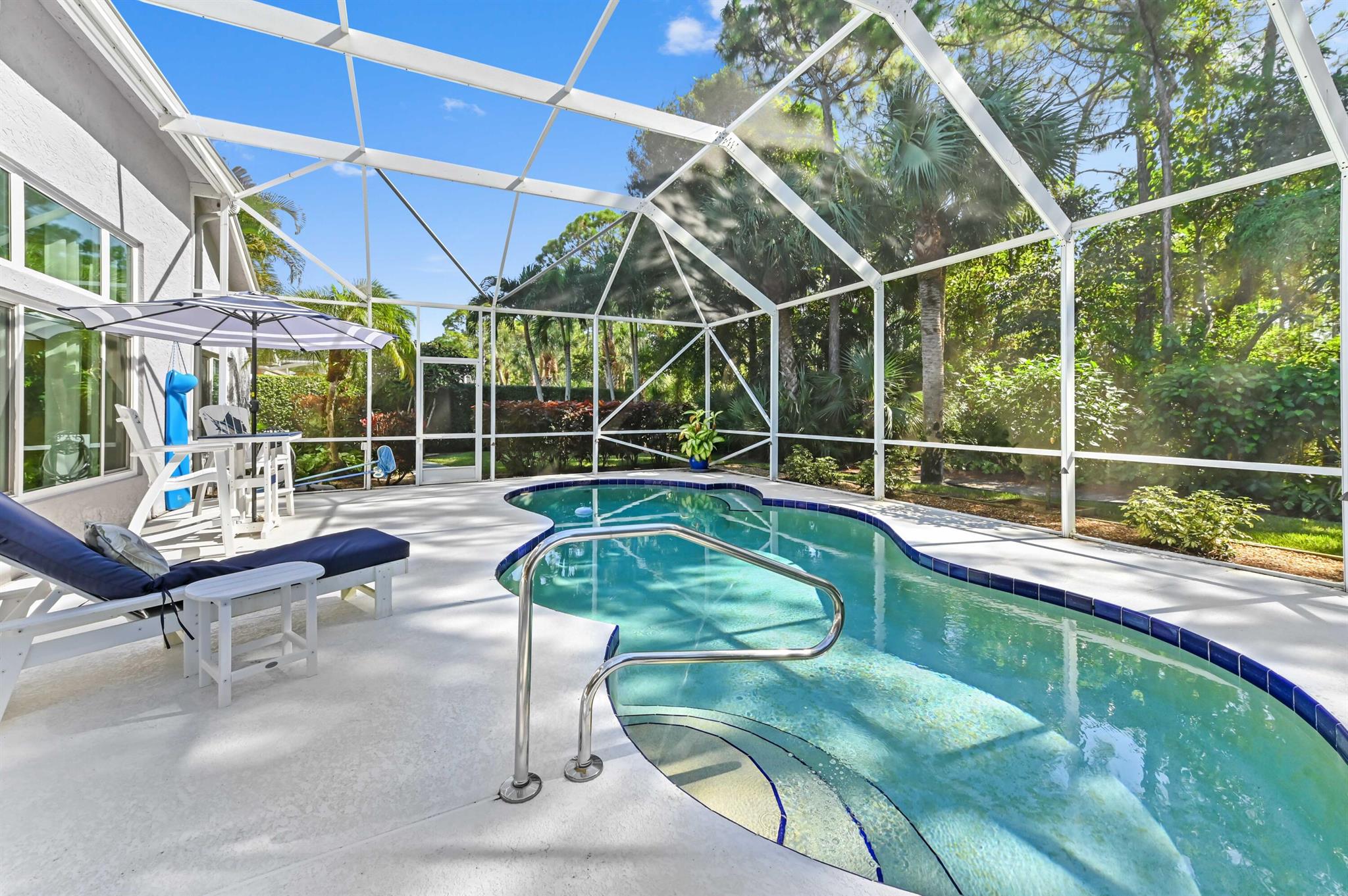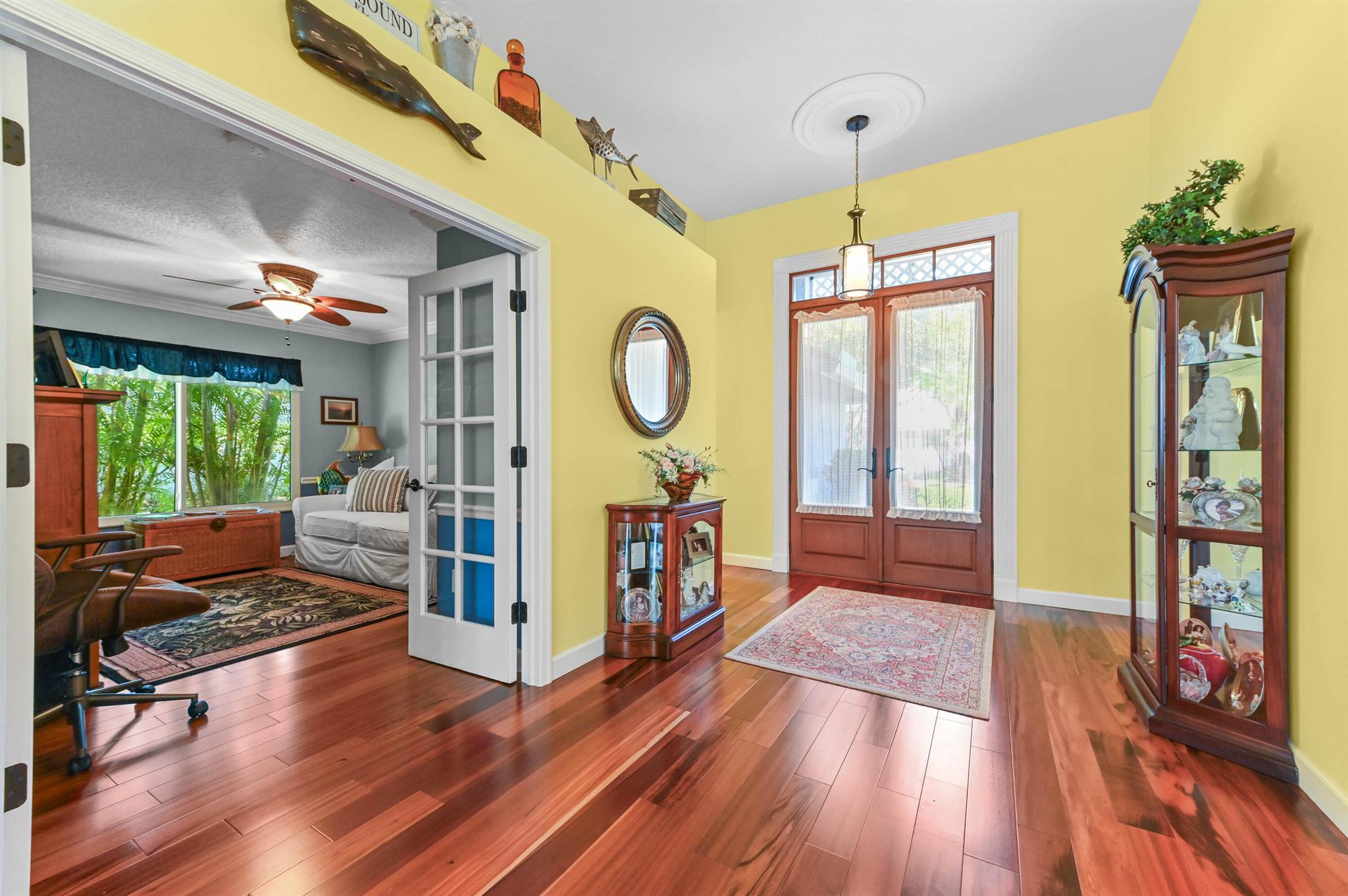 Prepare to be captivated by this stunning, custom-designed single-family pool home, perfectly situated in a desirable Hobe Sound community. The residence exudes charming curb appeal, featuring a modern metal roof, impact windows, a stylish stamped concrete driveway, and lush tropical landscaping that frames the home. The covered front entry features elegant columns and handsome double entry doors with unique dark hardware, setting a sophisticated tone from the moment you arrive.