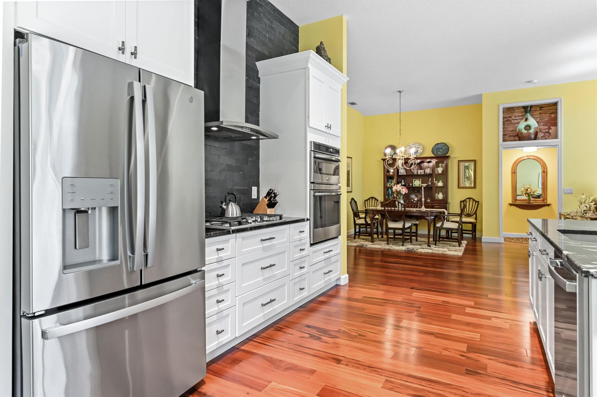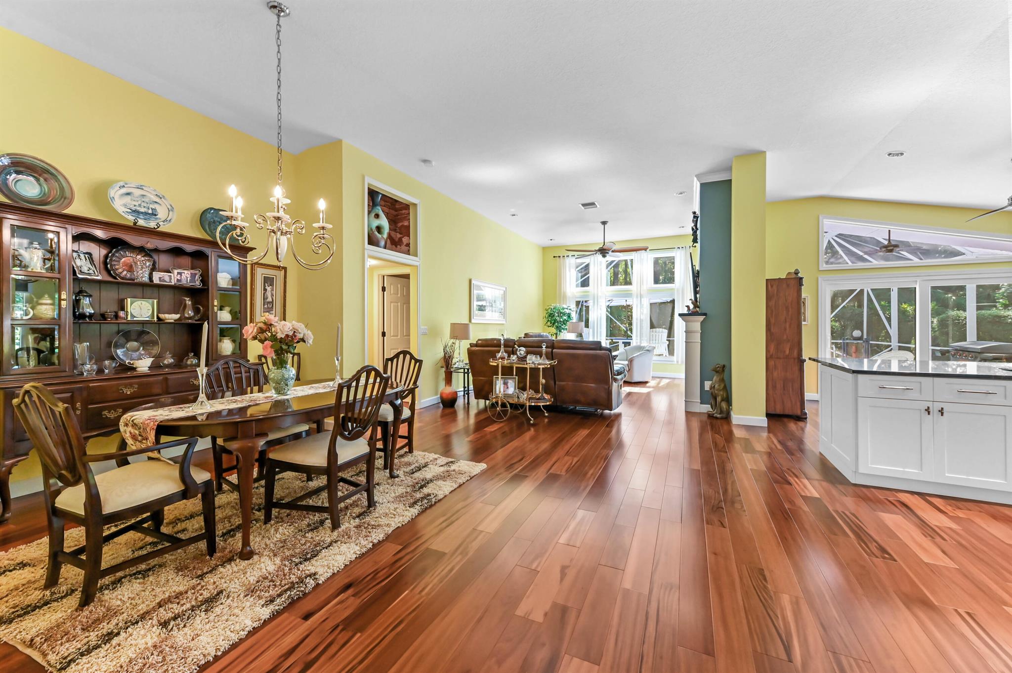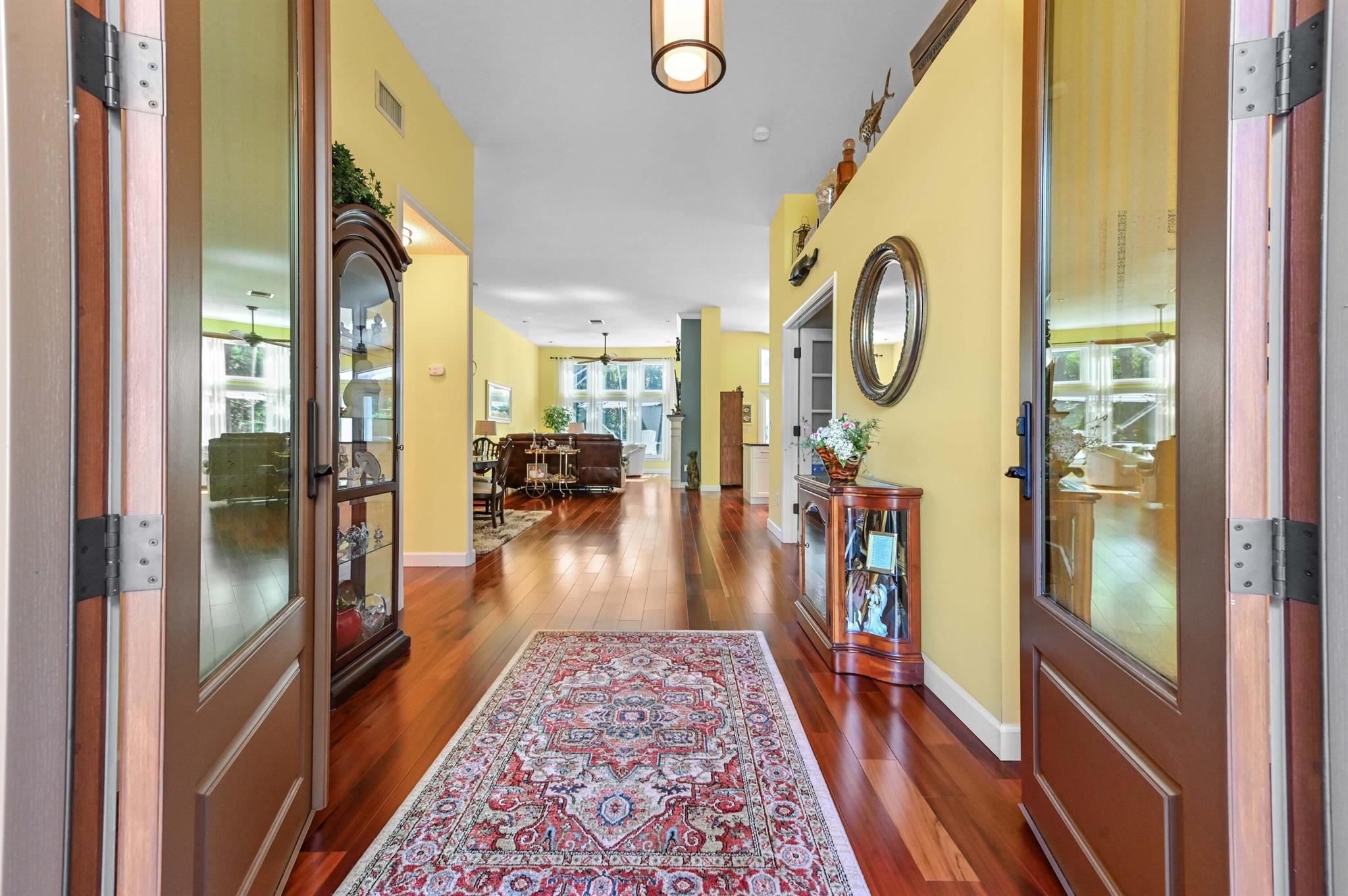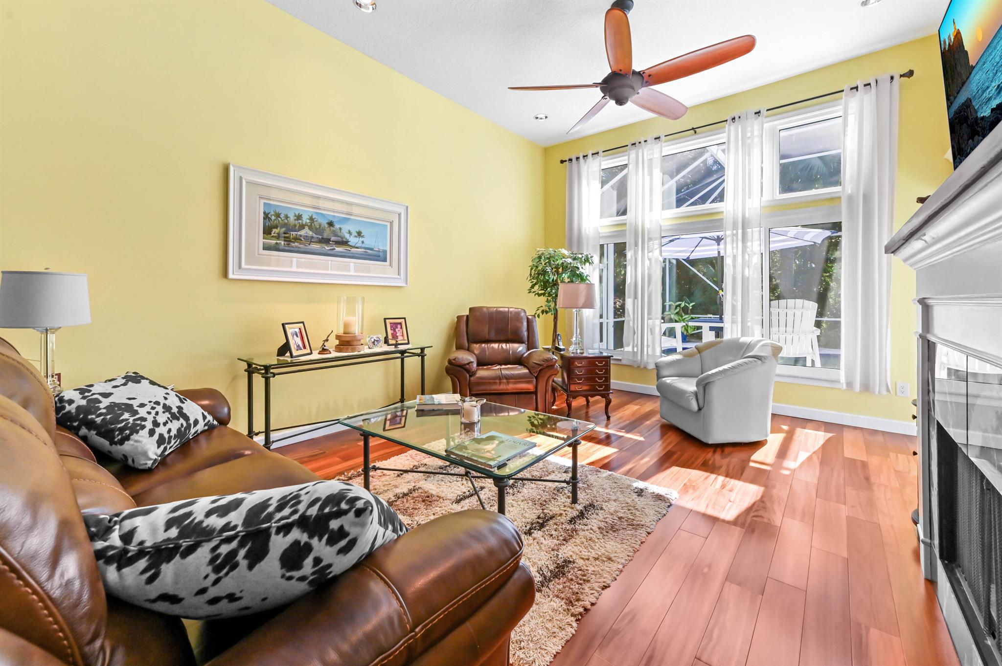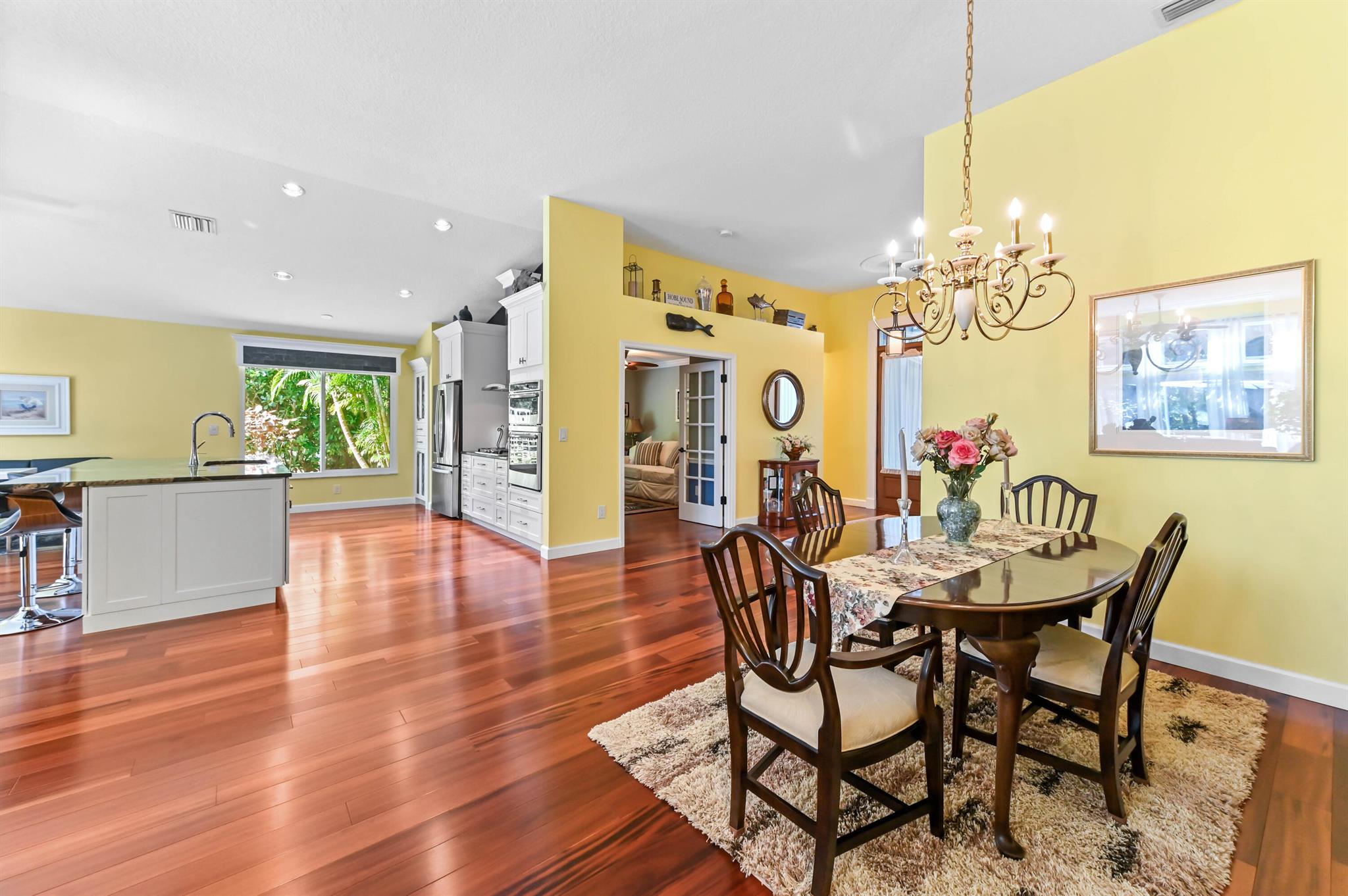 Prepare to be captivated by this stunning, custom-designed single-family pool home, perfectly situated in a desirable Hobe Sound community. The residence exudes charming curb appeal, featuring a modern metal roof, impact windows, a stylish stamped concrete driveway, and lush tropical landscaping that frames the home. The covered front entry features elegant columns and handsome double entry doors with unique dark hardware, setting a sophisticated tone from the moment you arrive.