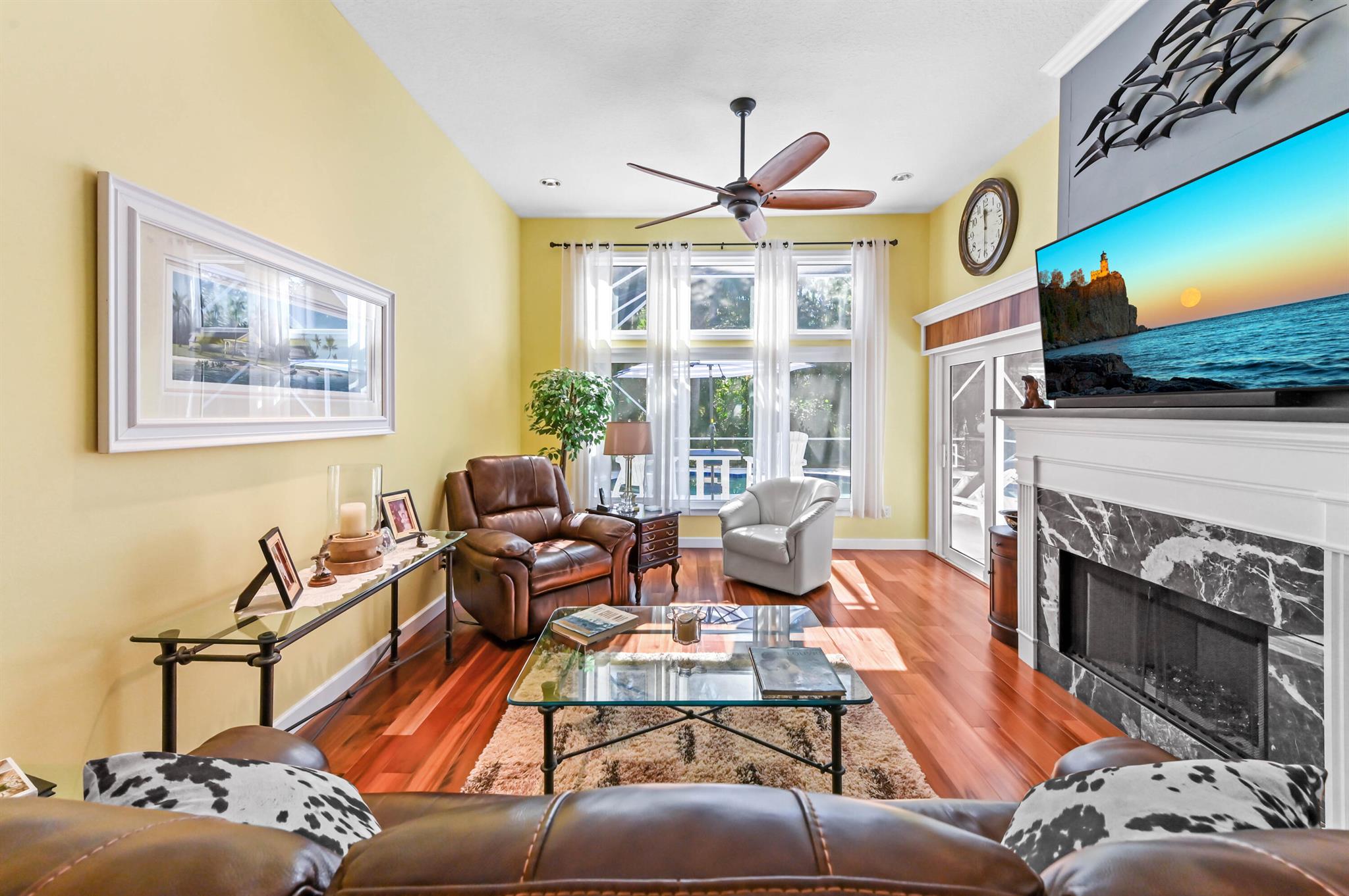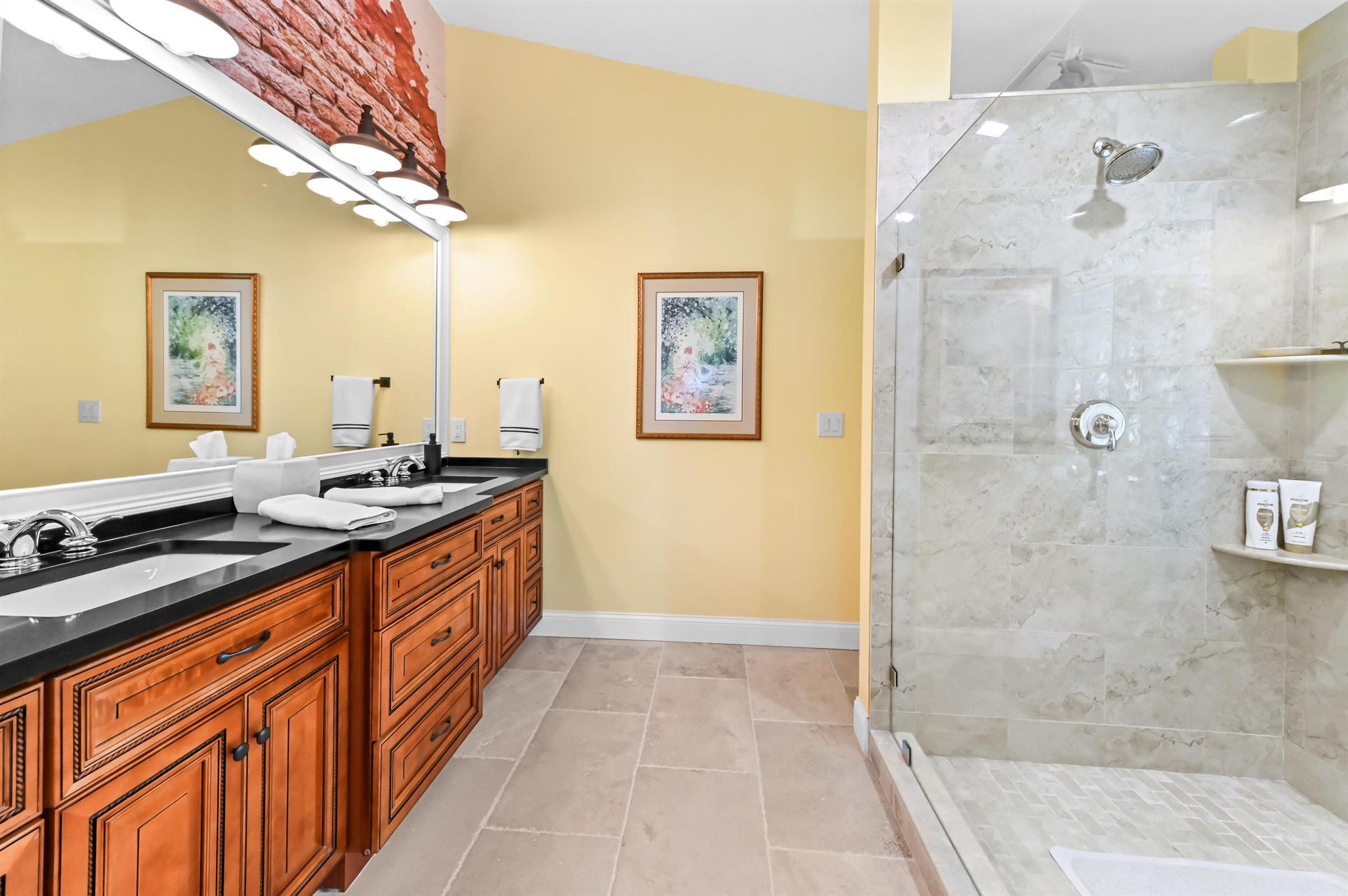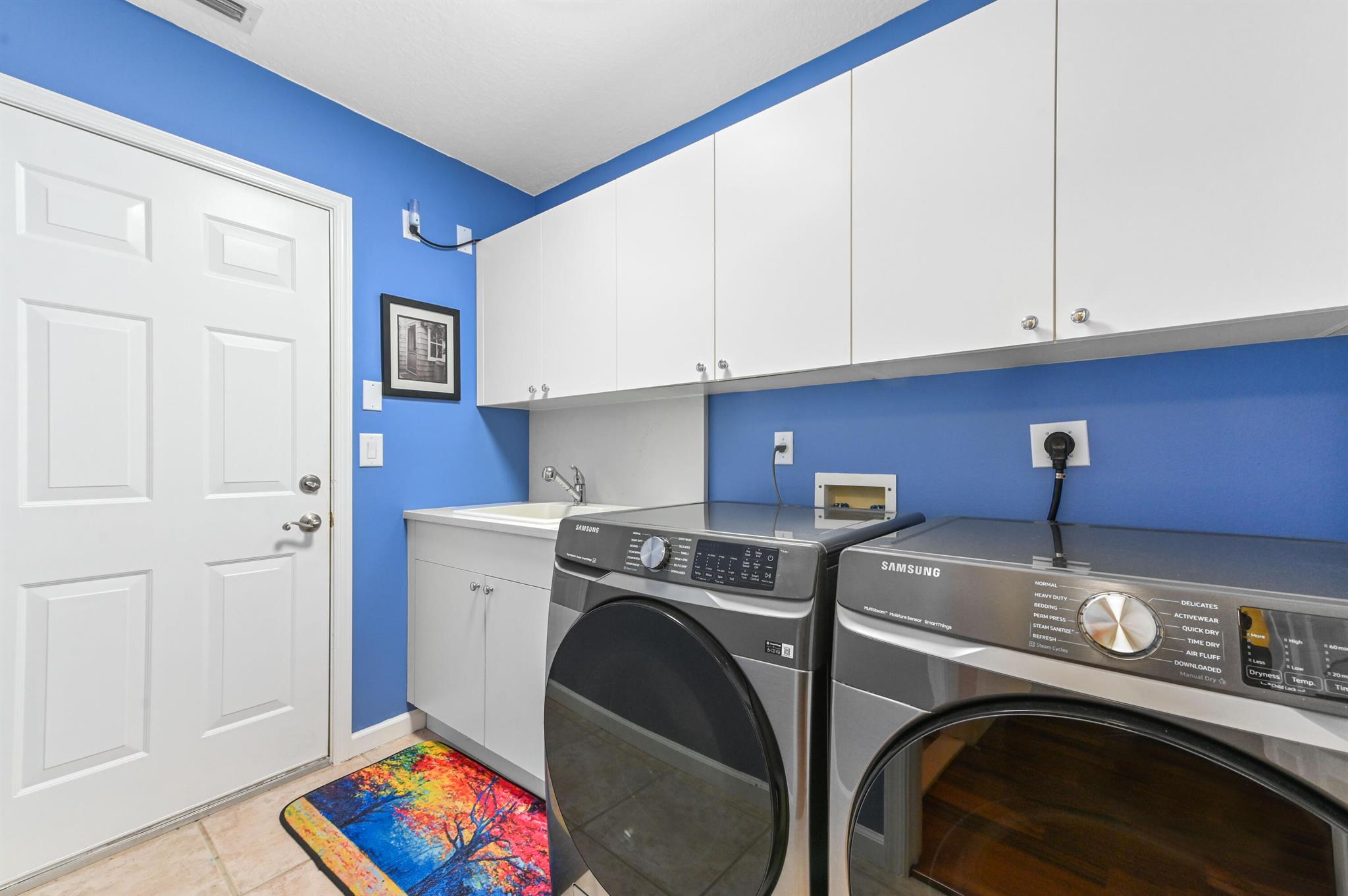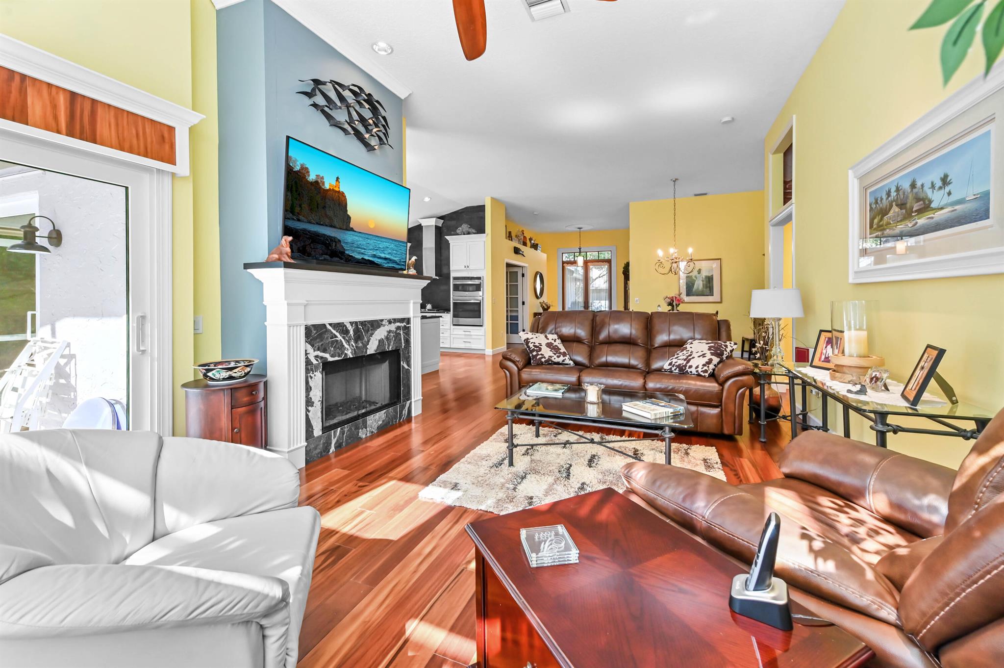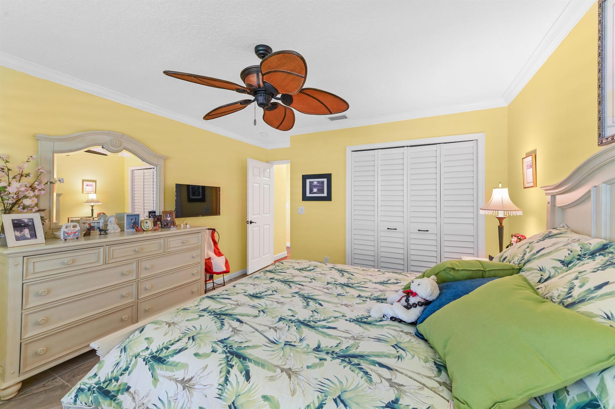 Prepare to be captivated by this stunning, custom-designed single-family pool home, perfectly situated in a desirable Hobe Sound community. The residence exudes charming curb appeal, featuring a modern metal roof, impact windows, a stylish stamped concrete driveway, and lush tropical landscaping that frames the home. The covered front entry features elegant columns and handsome double entry doors with unique dark hardware, setting a sophisticated tone from the moment you arrive.