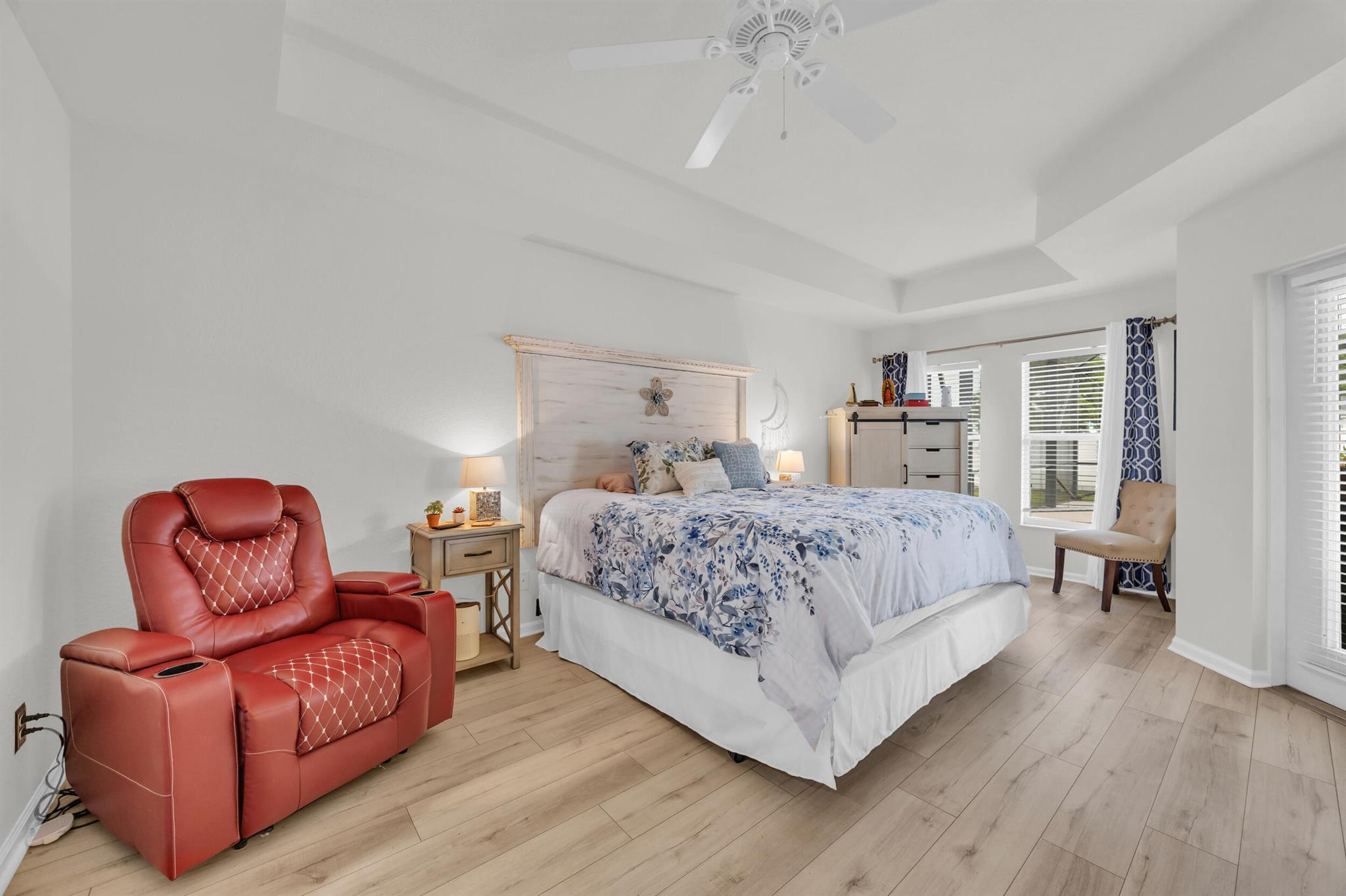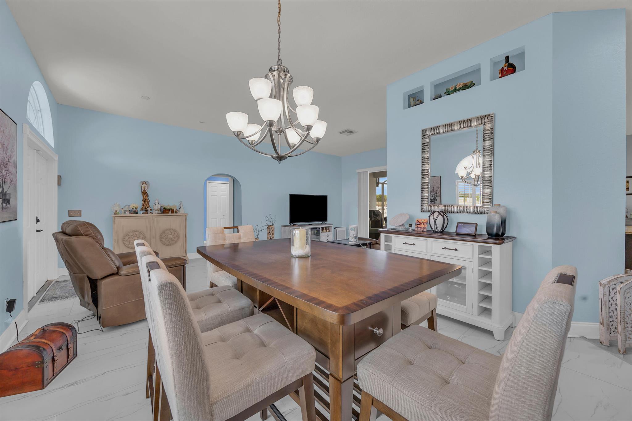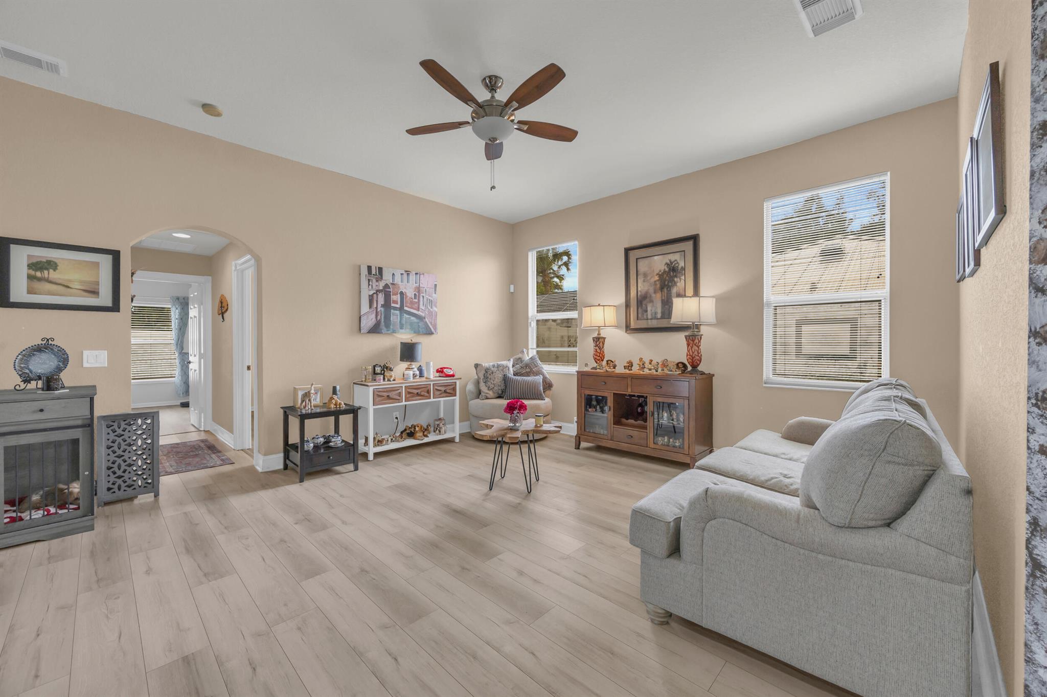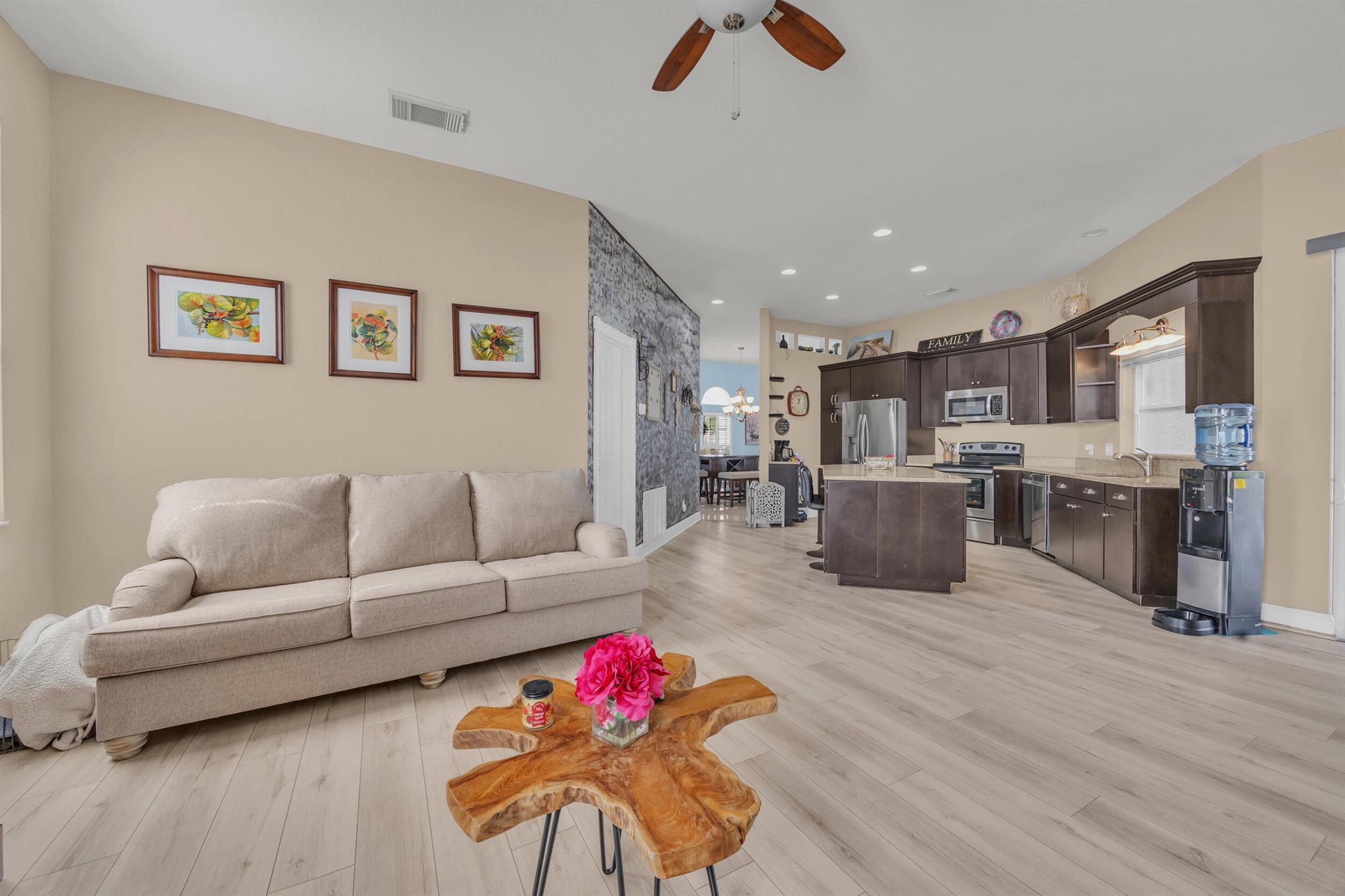 Welcome to Fairgreen Crossing, a sought-after non-HOA community ideally located just outside Tradition--offering all the convenience without the extra fees! Situated on a spacious corner lot with over a quarter acre of extra room, this property gives you the freedom to bring your RV, boat, and all your toys--no restrictions here. This 3-bedroom, 2-bath home has been lovingly maintained by a meticulous owner and features porcelain tile throughout and vinyl flooring in the bedrooms. The updated kitchen is filled with natural light and includes a stylish coffee station for your morning ritual. Step outside to your private paradise: a sparkling pool with a rock-cascade waterfall, surrounded by a large screened enclosure and a white vinyl fence for added privacy. The freshly painted patio