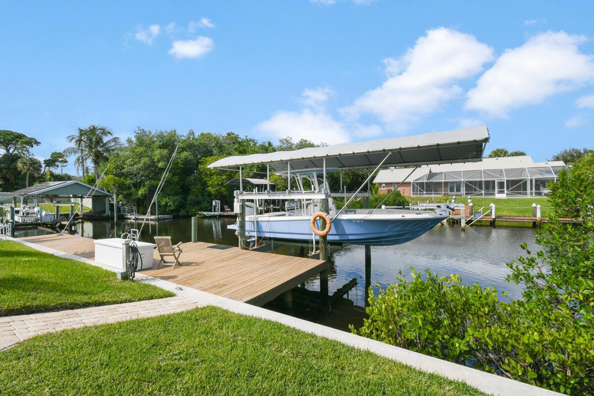 Waterfront Paradise with Dock & No Fixed Bridges! Enjoy the best of coastal living in this beautifully maintained 3-bedroom, 2.5-bath canal-front home just off the Intracoastal Waterway. Boaters will love the 100 ft. seawall, private dock with 16,000 lb lift, boat canopy and no fixed bridges to the ocean. Entertain effortlessly on the expansive patio with built-in grill, relax by the sparkling pool, or unwind under the covered lanai with tranquil water views. Inside, natural light fills the open-concept living and dining areas, complemented by volume ceilings and water-facing sliders that create seamless indoor-outdoor flow. The primary suite offers direct access to the lanai and pool, providing a serene retreat.