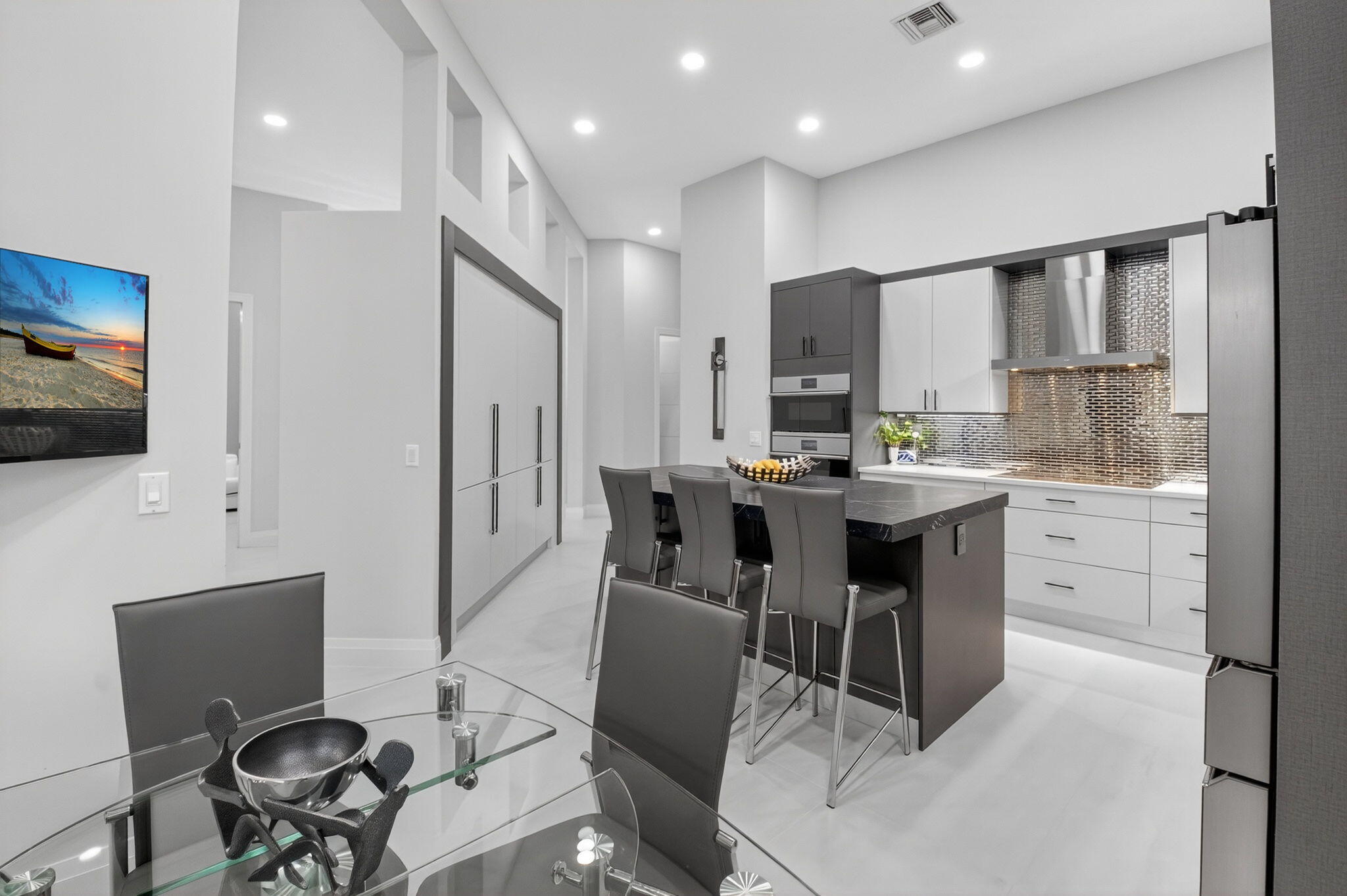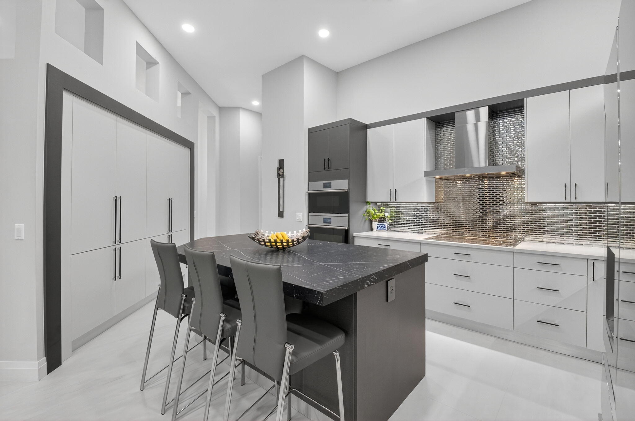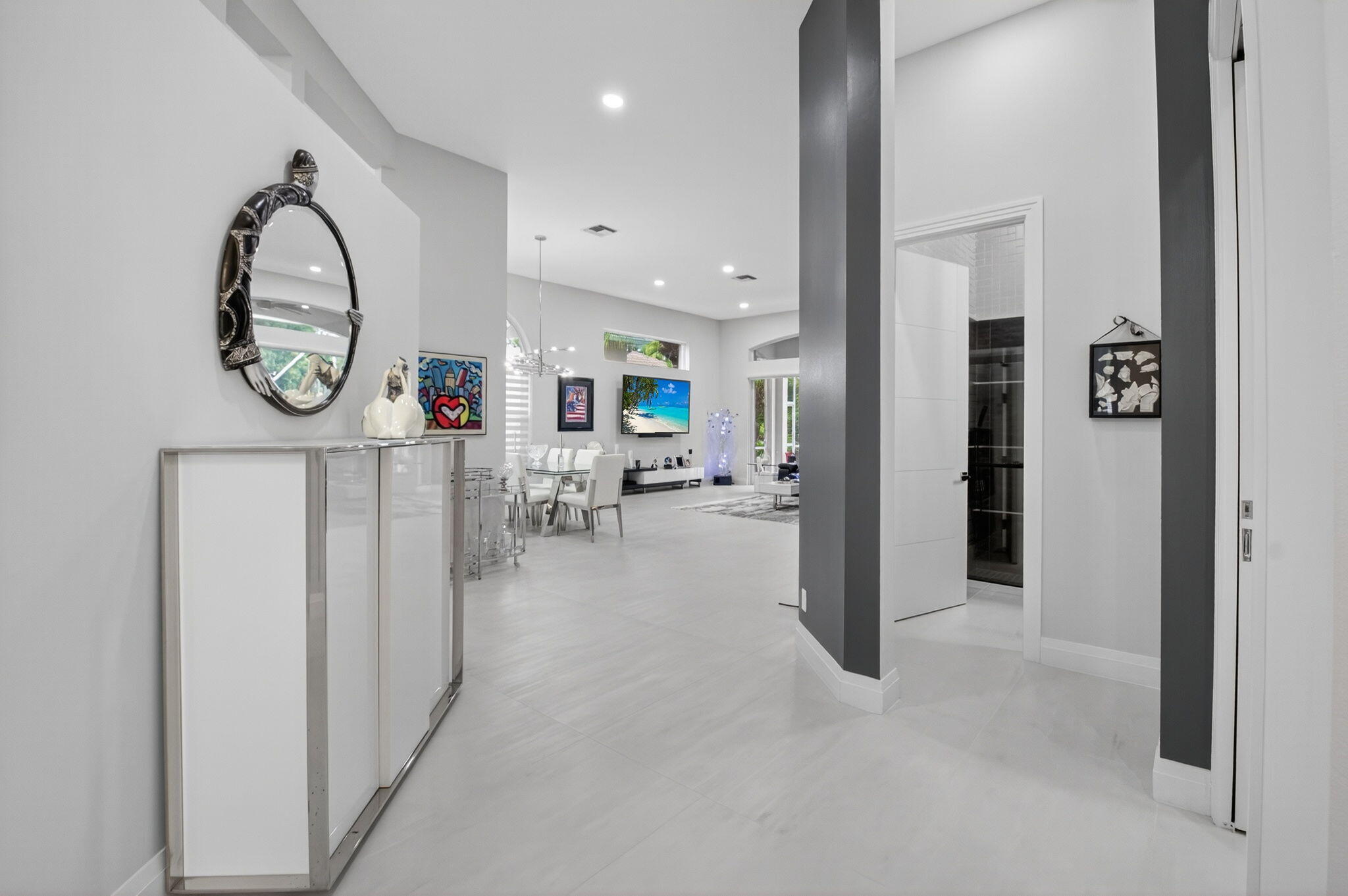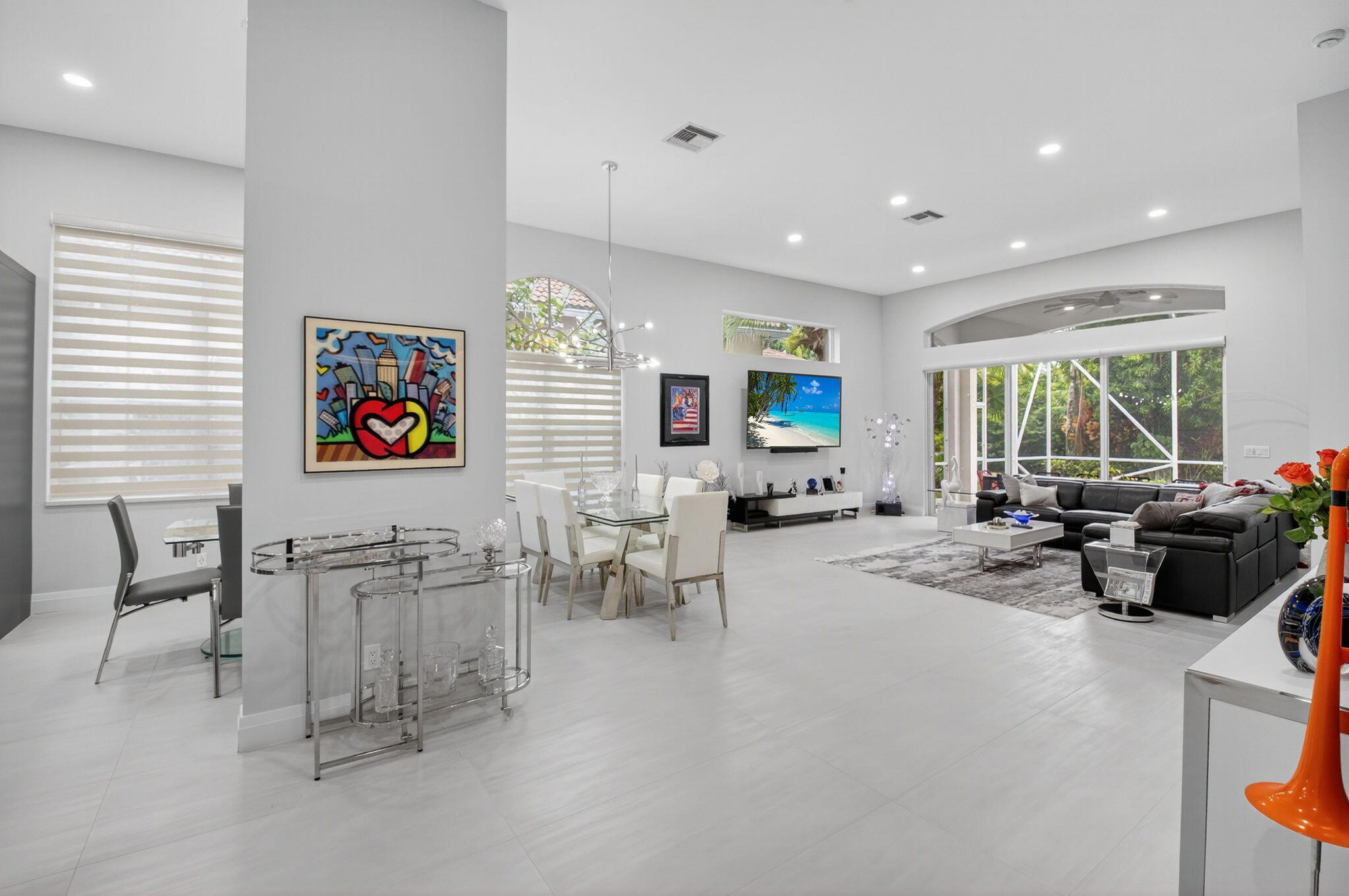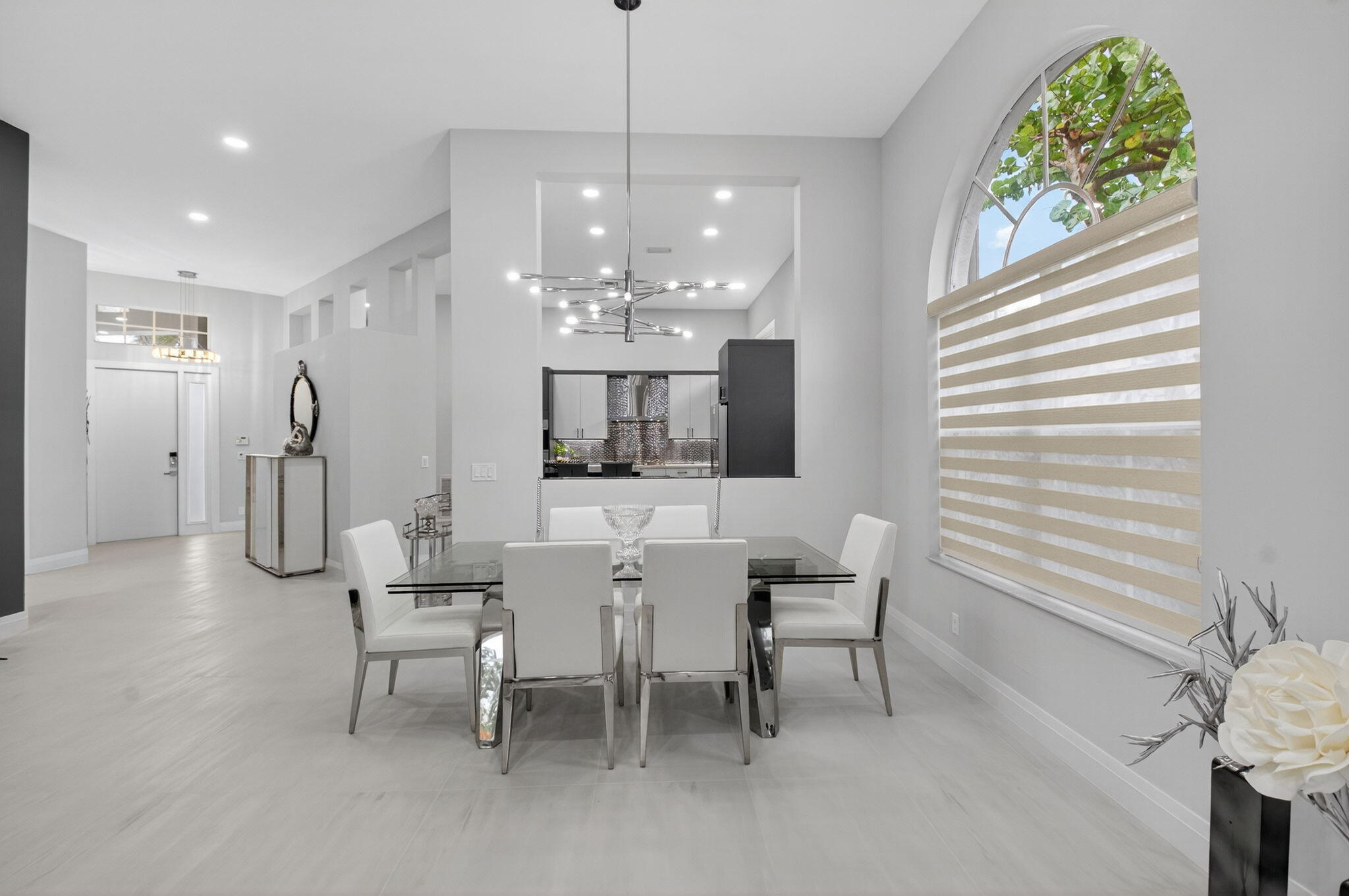 Step into luxury with this beautifully updated home featuring designer details and exceptional craftsmanship at every turn. The open-concept layout boasts 12' ceilings and porcelain 24x48-inch tile flooring throughout, creating an elegant and spacious feel. The gourmet kitchen is a chef's dream with quartz countertops, a striking porcelain island, GE Cafe appliances with Bluetooth capability and a granite composite sink with a Kohler touch free faucet.. You will find amazing storage space in the kitchen with pull out shelves in the pantries.Relax in the spa-inspired primary suite offering a separate raised soaking tub and walk in shower with raised floor, and enjoy the convenience of a large custom-fitted bedroom closet providing abundant storage.