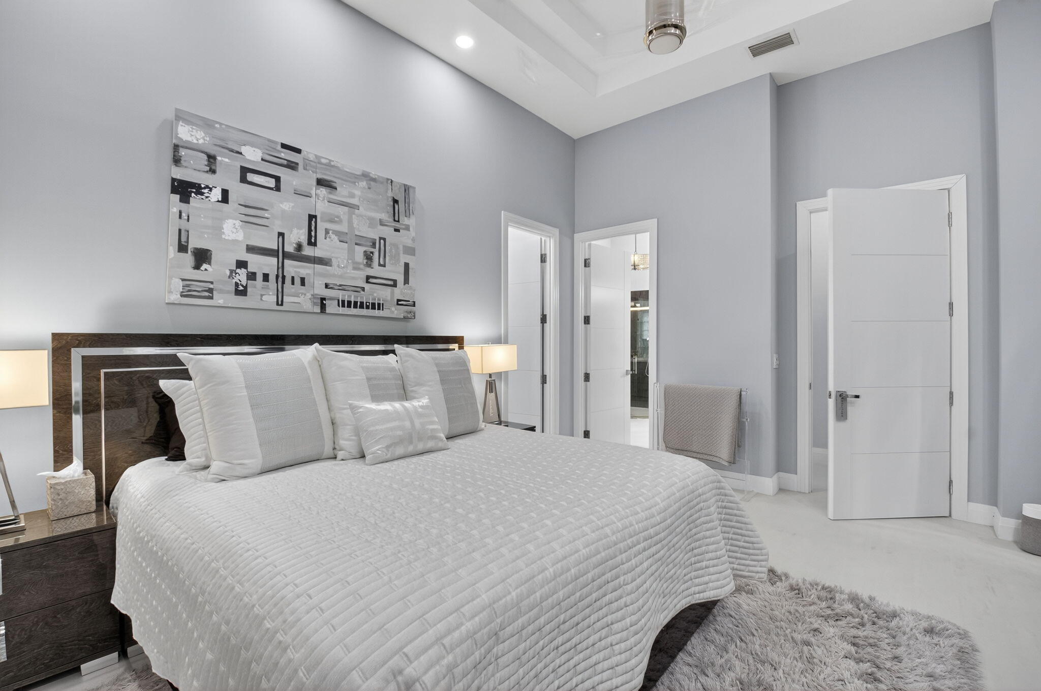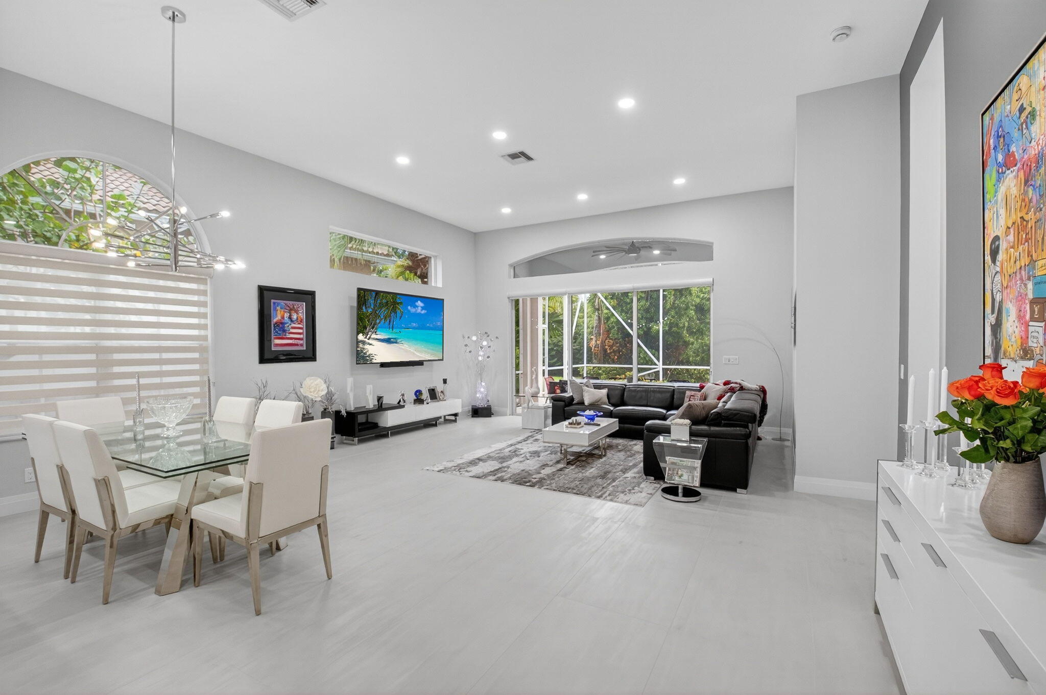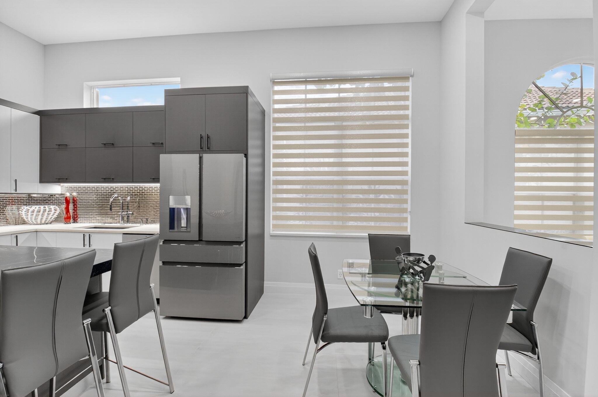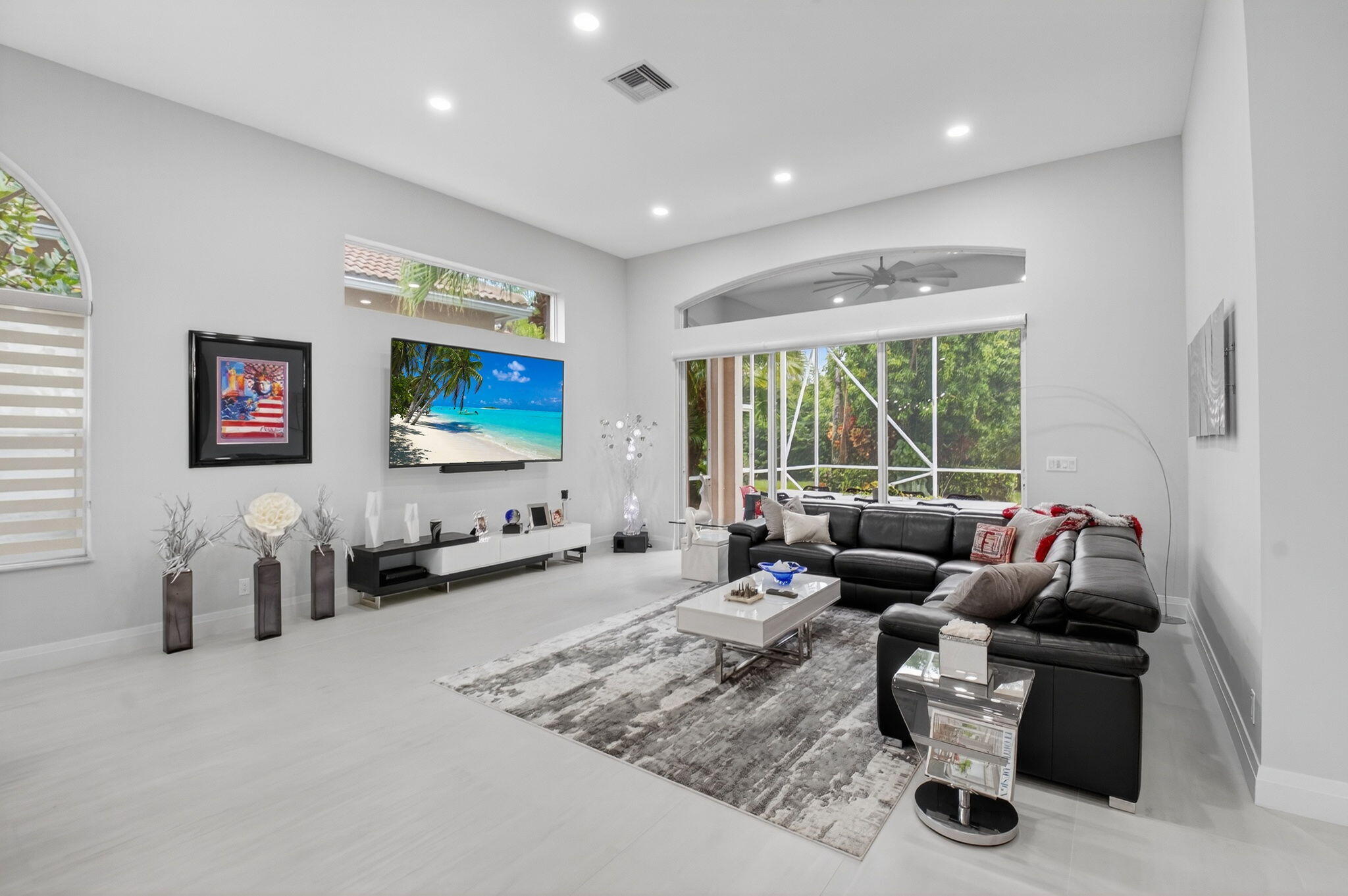 Step into luxury with this beautifully updated home featuring designer details and exceptional craftsmanship at every turn. The open-concept layout boasts 12' ceilings and porcelain 24x48-inch tile flooring throughout, creating an elegant and spacious feel. The gourmet kitchen is a chef's dream with quartz countertops, a striking porcelain island, GE Cafe appliances with Bluetooth capability and a granite composite sink with a Kohler touch free faucet.. You will find amazing storage space in the kitchen with pull out shelves in the pantries.Relax in the spa-inspired primary suite offering a separate raised soaking tub and walk in shower with raised floor, and enjoy the convenience of a large custom-fitted bedroom closet providing abundant storage.