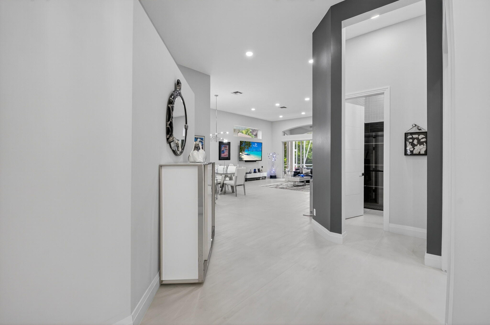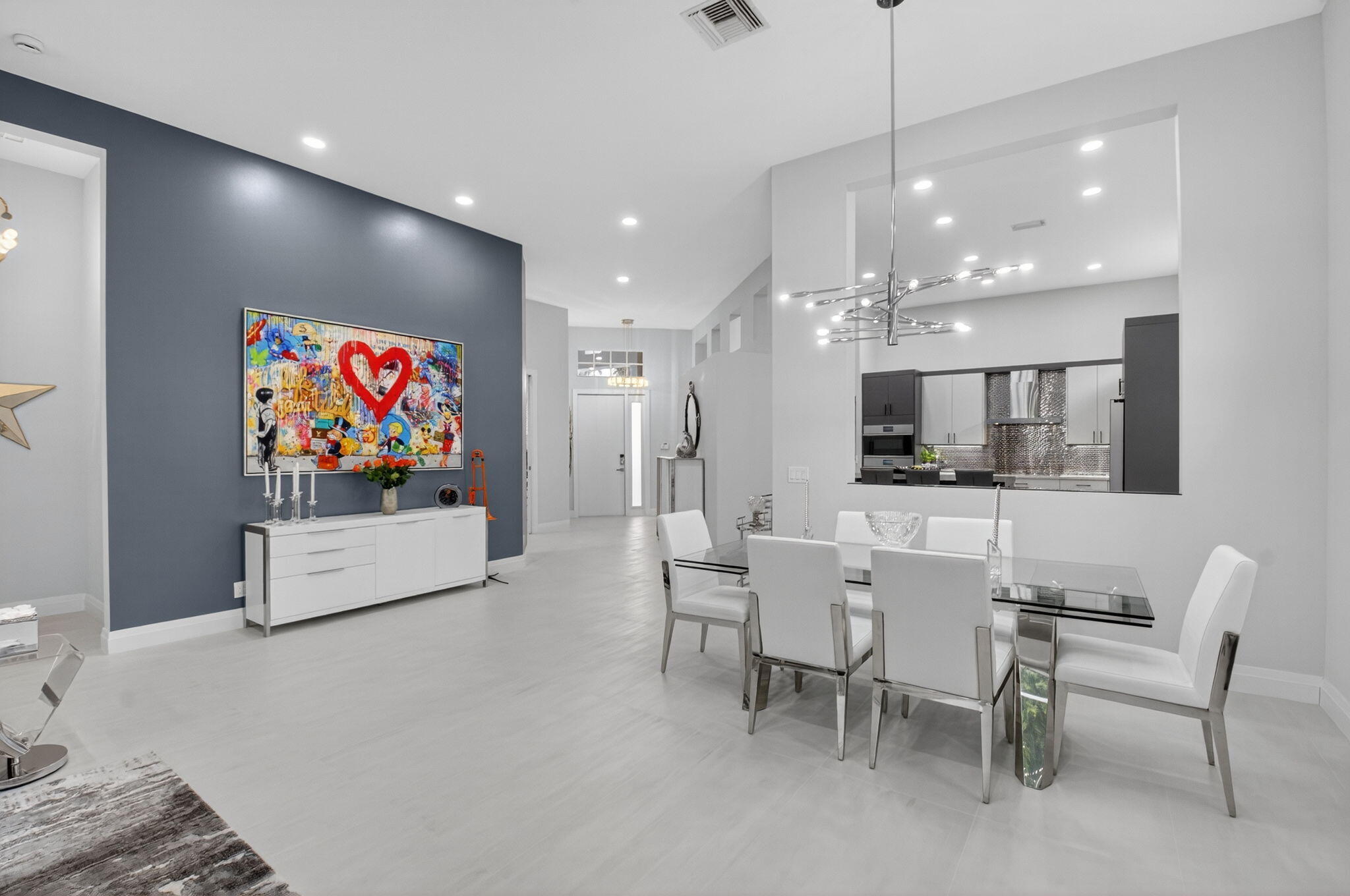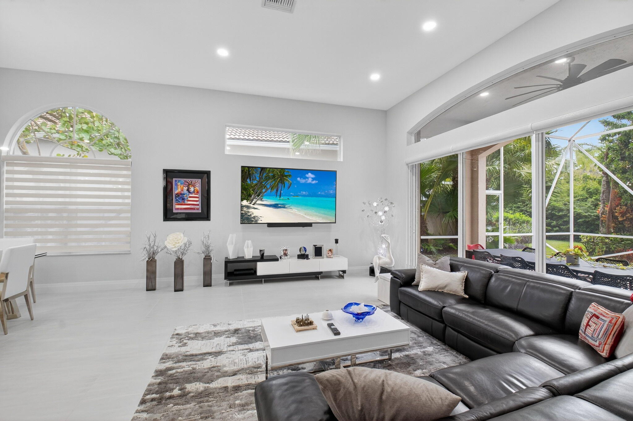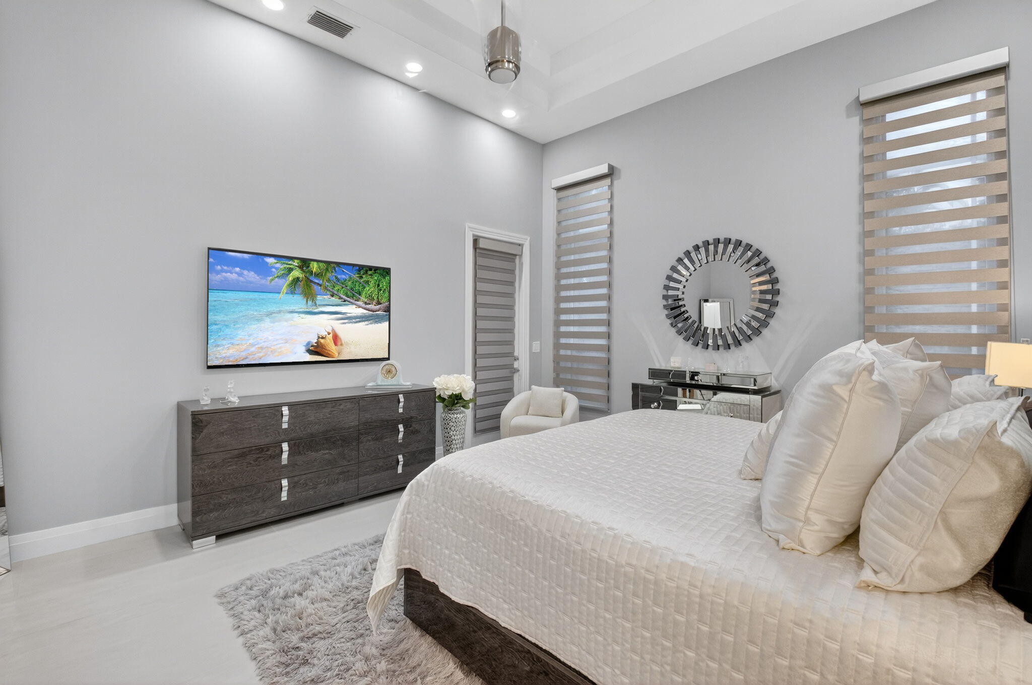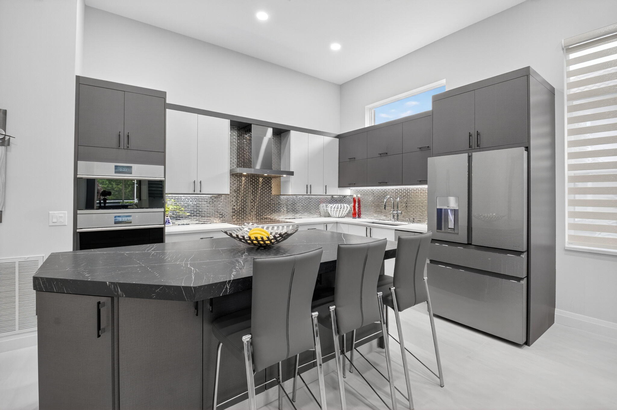 Step into luxury with this beautifully updated home featuring designer details and exceptional craftsmanship at every turn. The open-concept layout boasts 12' ceilings and porcelain 24x48-inch tile flooring throughout, creating an elegant and spacious feel. The gourmet kitchen is a chef's dream with quartz countertops, a striking porcelain island, GE Cafe appliances with Bluetooth capability and a granite composite sink with a Kohler touch free faucet.. You will find amazing storage space in the kitchen with pull out shelves in the pantries.Relax in the spa-inspired primary suite offering a separate raised soaking tub and walk in shower with raised floor, and enjoy the convenience of a large custom-fitted bedroom closet providing abundant storage.