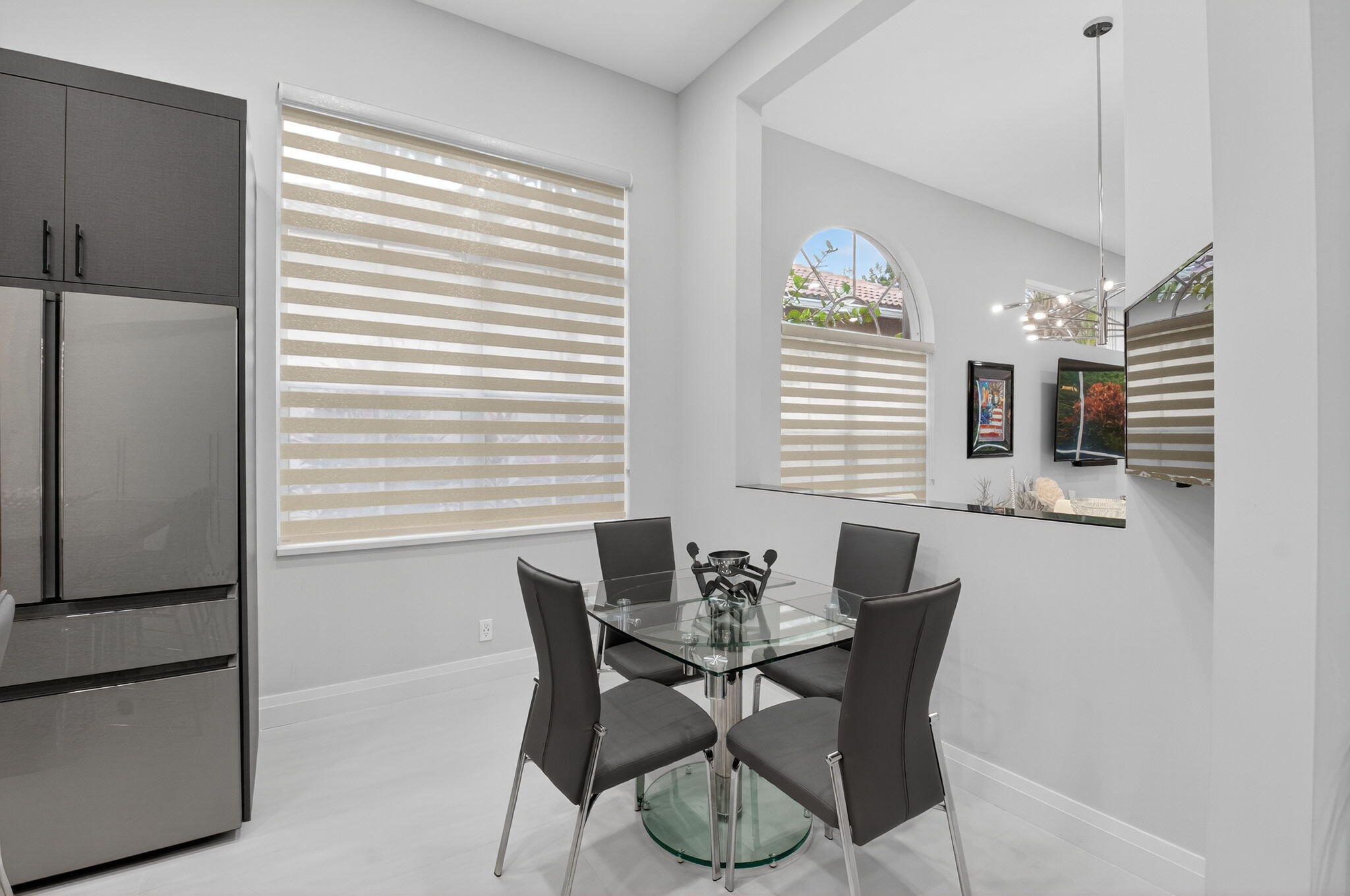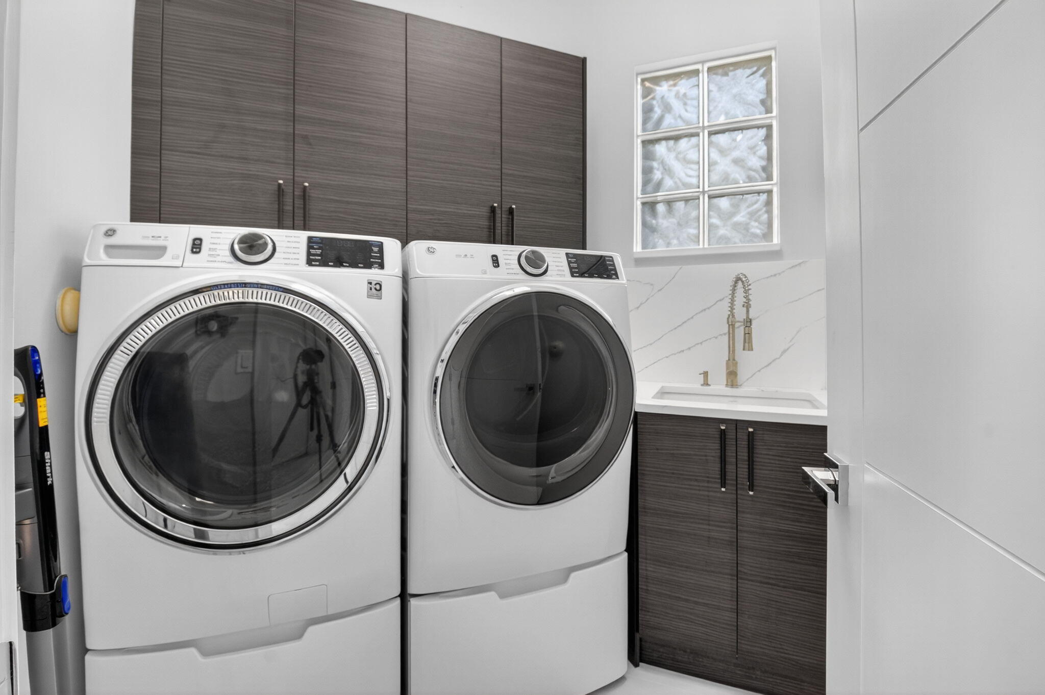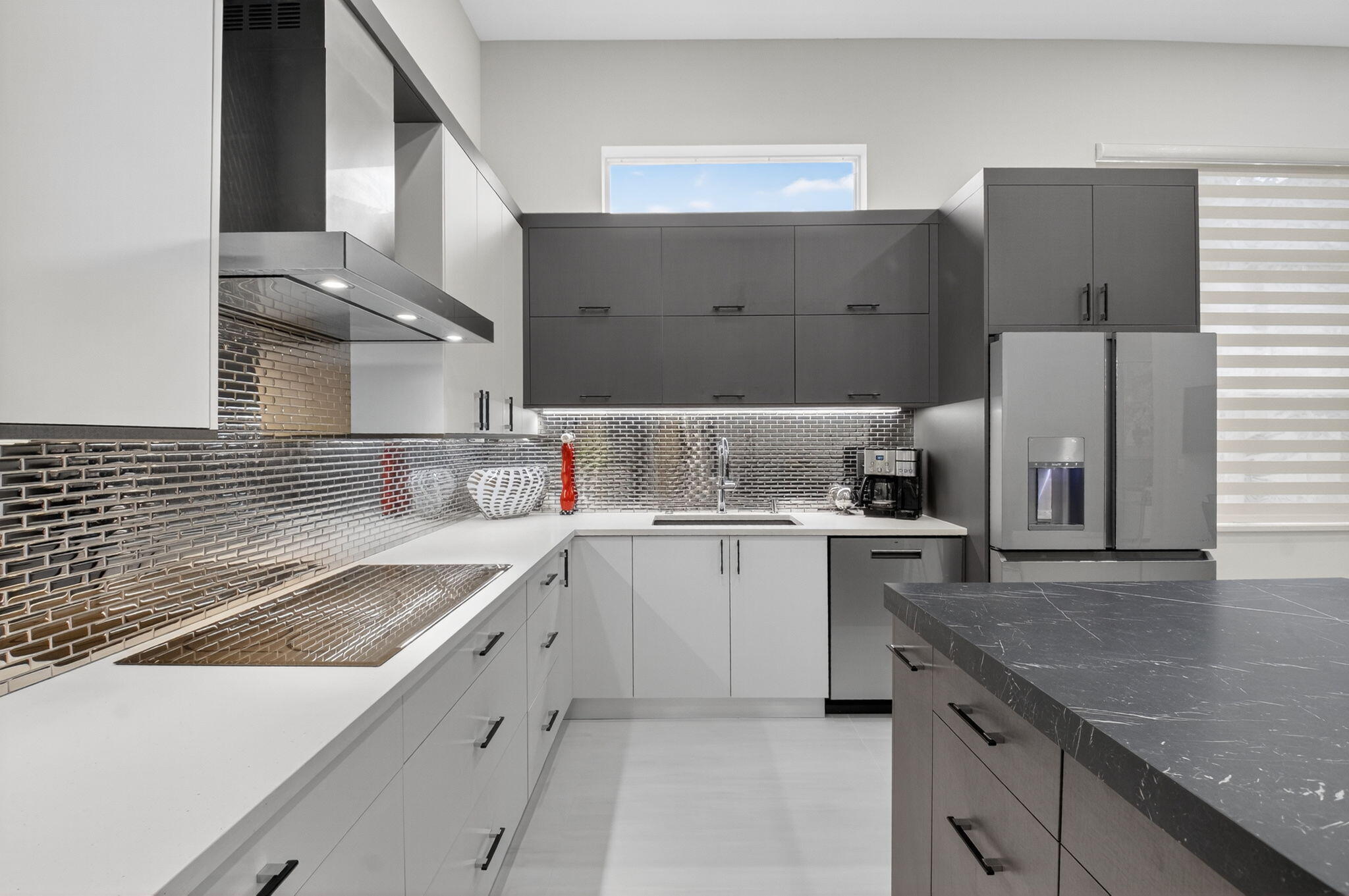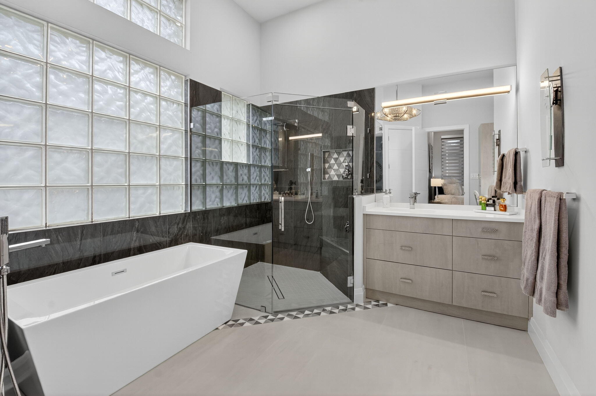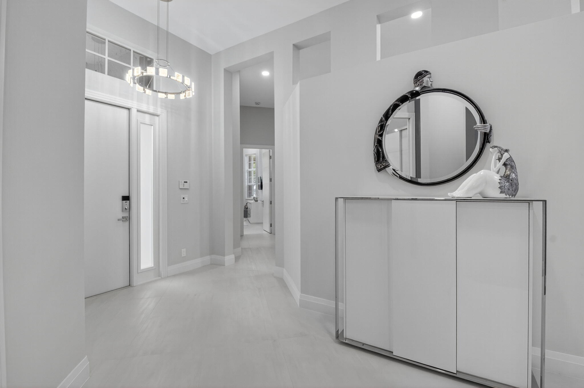 Step into luxury with this beautifully updated home featuring designer details and exceptional craftsmanship at every turn. The open-concept layout boasts 12' ceilings and porcelain 24x48-inch tile flooring throughout, creating an elegant and spacious feel. The gourmet kitchen is a chef's dream with quartz countertops, a striking porcelain island, GE Cafe appliances with Bluetooth capability and a granite composite sink with a Kohler touch free faucet.. You will find amazing storage space in the kitchen with pull out shelves in the pantries.Relax in the spa-inspired primary suite offering a separate raised soaking tub and walk in shower with raised floor, and enjoy the convenience of a large custom-fitted bedroom closet providing abundant storage.