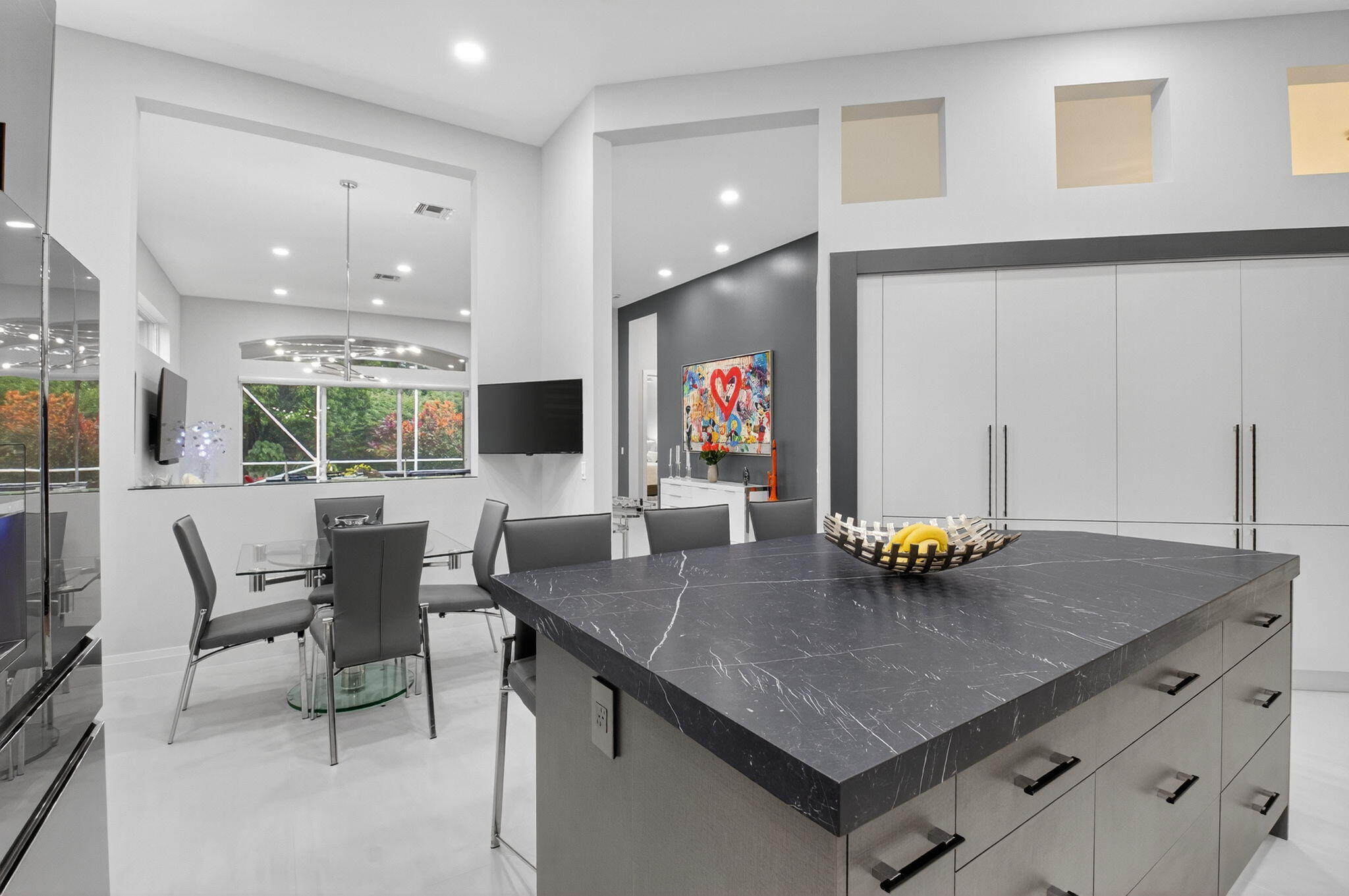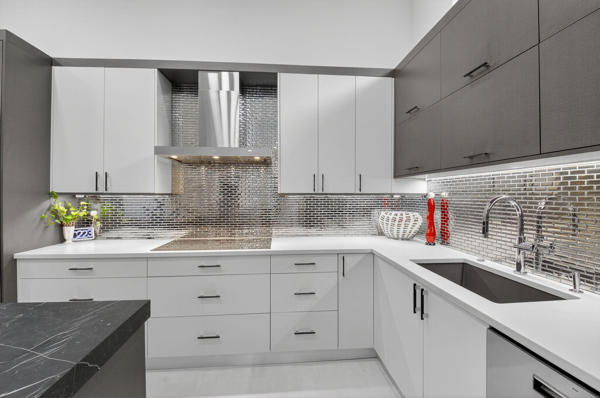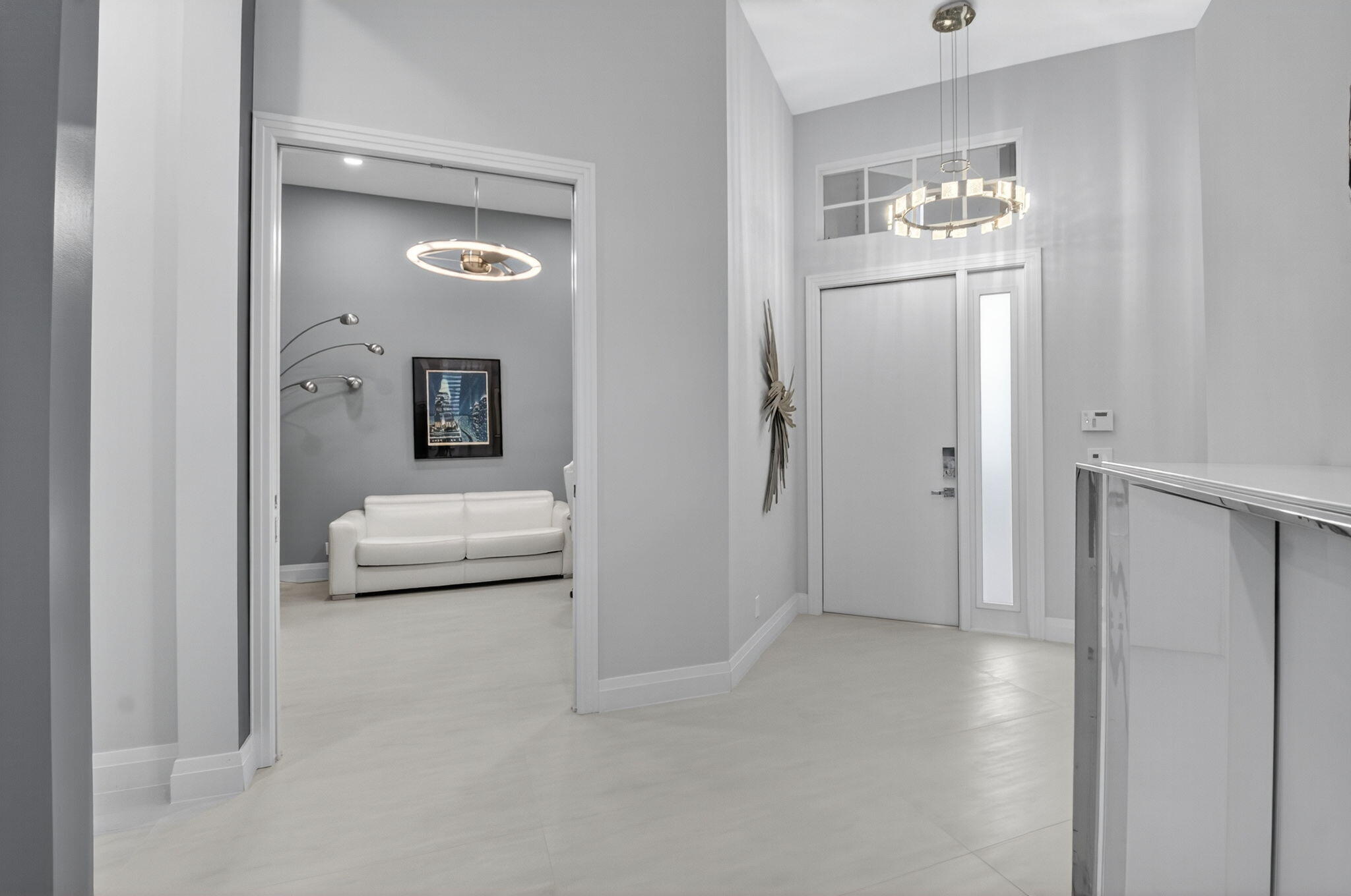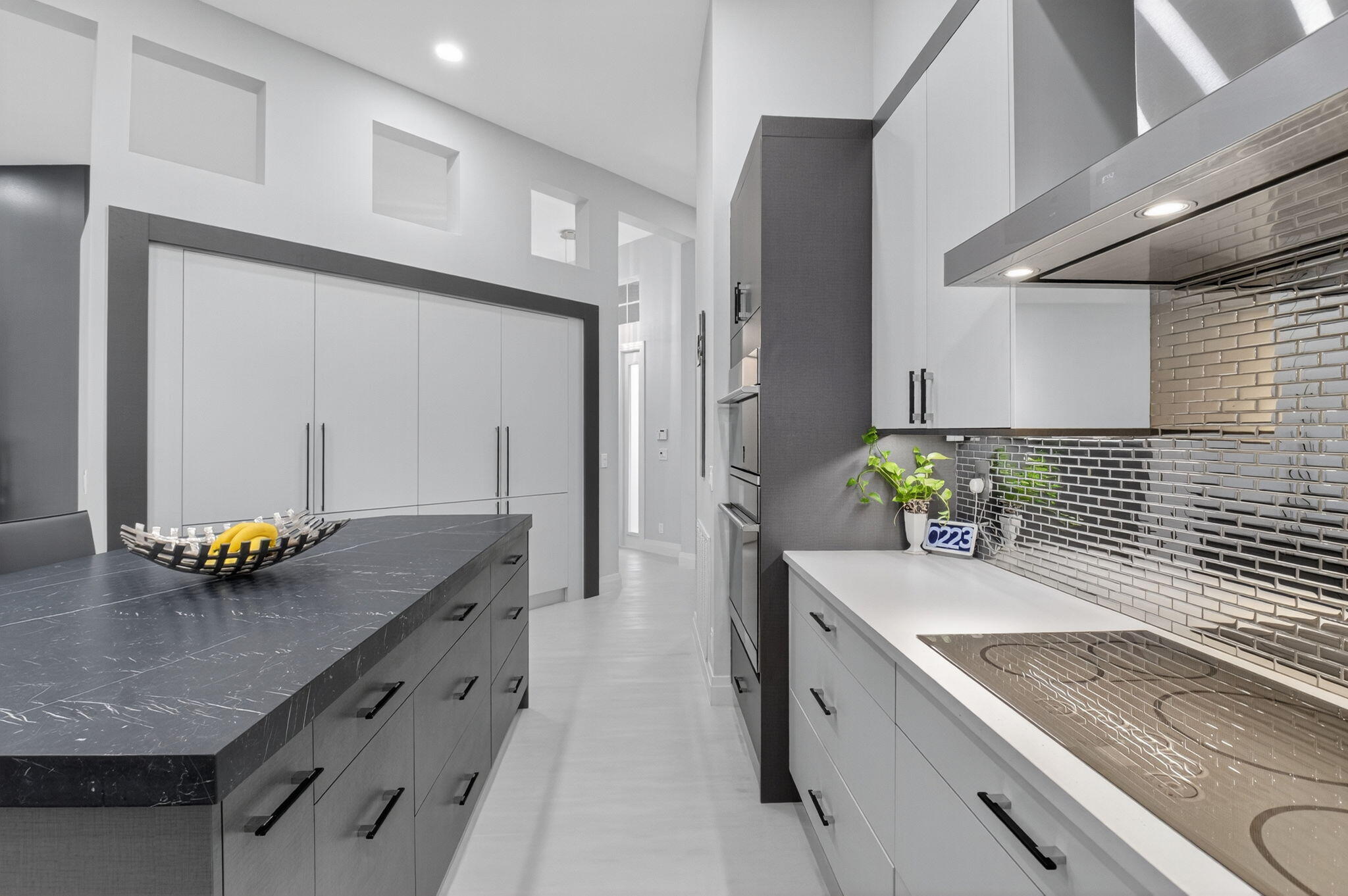 Step into luxury with this beautifully updated home featuring designer details and exceptional craftsmanship at every turn. The open-concept layout boasts 12' ceilings and porcelain 24x48-inch tile flooring throughout, creating an elegant and spacious feel. The gourmet kitchen is a chef's dream with quartz countertops, a striking porcelain island, GE Cafe appliances with Bluetooth capability and a granite composite sink with a Kohler touch free faucet.. You will find amazing storage space in the kitchen with pull out shelves in the pantries.Relax in the spa-inspired primary suite offering a separate raised soaking tub and walk in shower with raised floor, and enjoy the convenience of a large custom-fitted bedroom closet providing abundant storage.