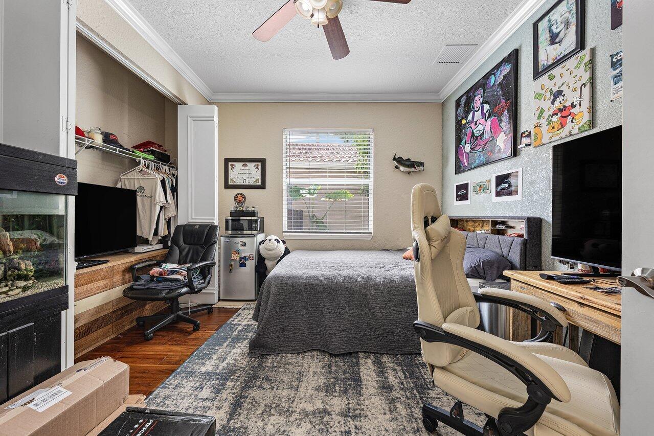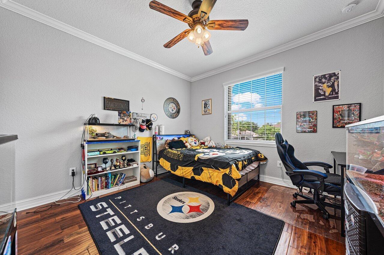 Beautifully Renovated 5 Bedroom Lakefront Home on a Fantastic Culdesac Lot. There's Accordion Hurricane Shutters for the Whole Home & Lush Landscaping. The Exterior & Interior of the Home have Just Been Repainted. Entering the Impact Glass Front Entry You'll be Impressed by the Soaring Ceilings & Amazing Natural Light. The Home Boasts Solid Wood Doors and Crown Molding Everywhere. The Stunning Updated Kitchen Includes Custom Quartz Counters with Waterfall Edge, Two Tone Wood Cabinets and Upgraded Appliances Including a Double Oven and Vented Hood. Out Back a Gorgeous Travertine Paver Patio Overlooks Incredible Lake Views. The Huge Pie Lot has Been Fenced as Well. Upstairs there are Wood Floors Throughout. The Large Primary Suite has Custom Walk-In Closets & a Luxurious Primary Bath.
