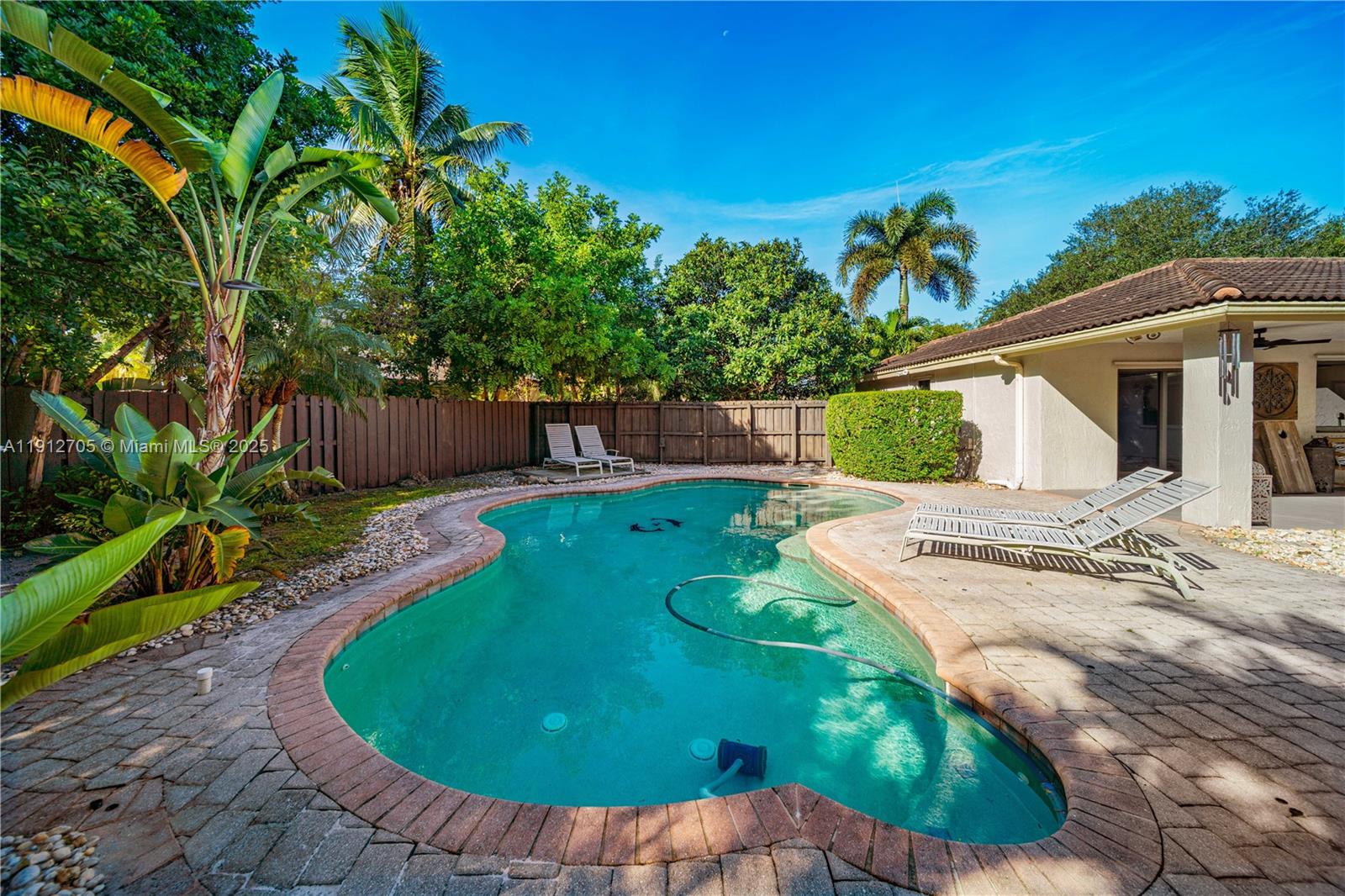 Stunning pool home located on an oversize cul-de-sac lot! Completely renovated Italian modern kitchen with gorgeous custom wood cabinets, stainless appliances, & breakfast bar open to the huge family room. Primary bedroom with direct access to pool & patio features a massive bathroom with a double vanity, free-standing elegant tub, and walk-in shower. Renovated guest bathroom. Whole-house hurricane protection with high impact windows and sliding doors. The back yard is a dream come true with its free form pool and surrounding patio, expansive designed paver play area with fire pit, covered patio, and lush privacy landscaping. Side yard offers space to park your boat. Excellent schools. Easy access to highways, shopping, theater, restaurants, hospitals. Low $30 monthly maintenance.