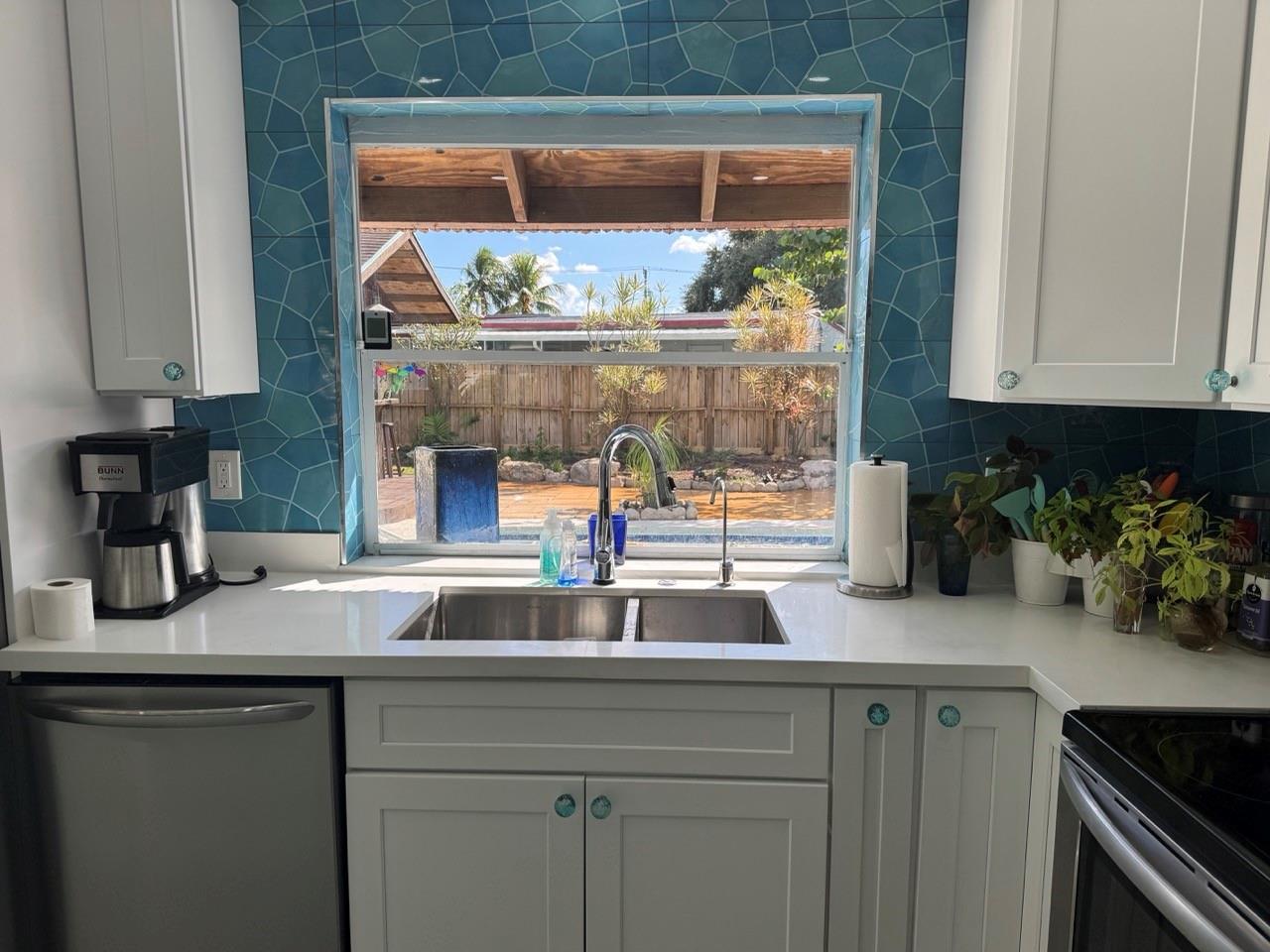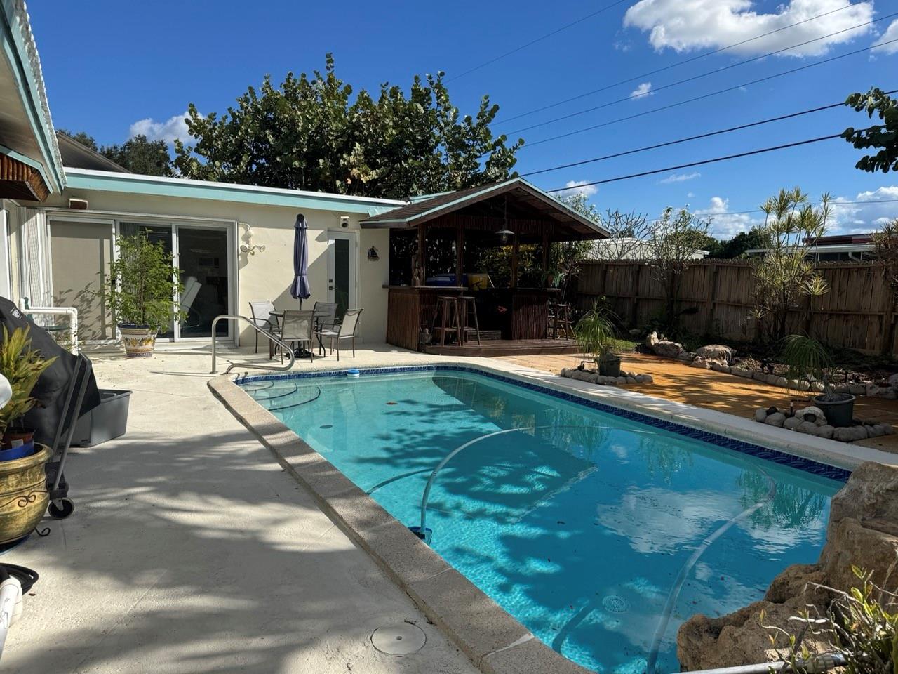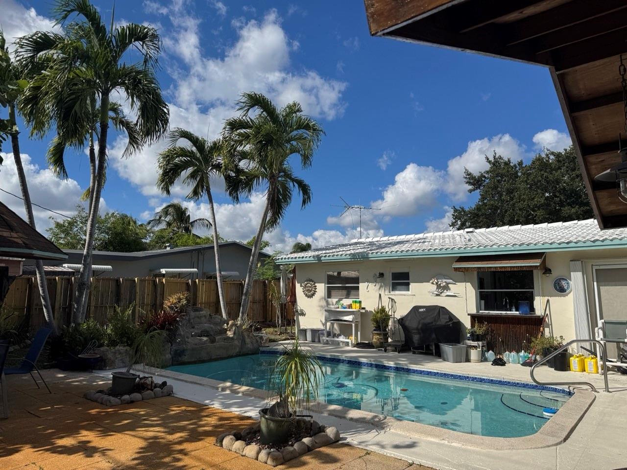 Beautifully updated 4BR/2BA pool home featuring a tropical waterfall, Covered jacuzzi Hut, with entertaining bar area. Bright new kitchen and baths, split-bedroom layout, spacious utility room, and large closets. Light vinyl plank flooring throughout. Tile roof with new flat roofs. Circular driveway fits 4+ cars, with boat and RV parking allowed. Owner has a current title search, 4 point & Wind mitigation to share! Ready to go! Large fenced lot on a quiet street—walk to schools, parks, and shopping. Boat launch 3 minutes away, close to I-95, 595, and the Turnpike, just 15 minutes to Downtown and Las Olas. Current 4-point and wind mitigation reports available. Priced to sell—owner may assist with closing costs! Public Gas is available from the street!