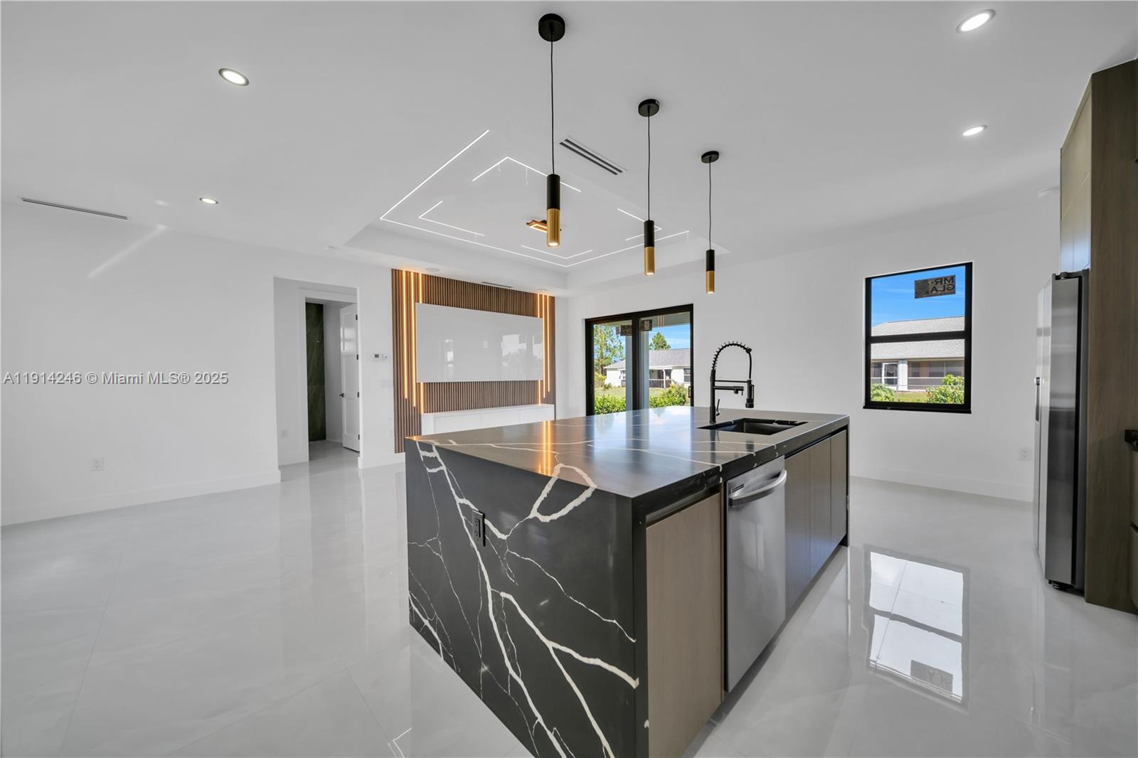 READY TO MOVE IN! This stunning new construction home combines modern design, comfort, and security. It features 3 bedrooms, 2 bathrooms, and impact-resistant windows for safety and energy efficiency. The modern kitchen offers quartz countertops, stainless steel appliances, and an open-concept layout perfect for everyday living or entertaining. Upgrades include a built-in audio system, a full security camera system, an irrigation system, and washer and dryer included. Outside, enjoy a beautifully landscaped garden with a living fence made of Clusia plants, providing both privacy and natural beauty. The exterior is fully illuminated, creating a warm and elegant ambiance. This move-in-ready home is the perfect blend of style, functionality, and peace of mind—a must-see opportunity!