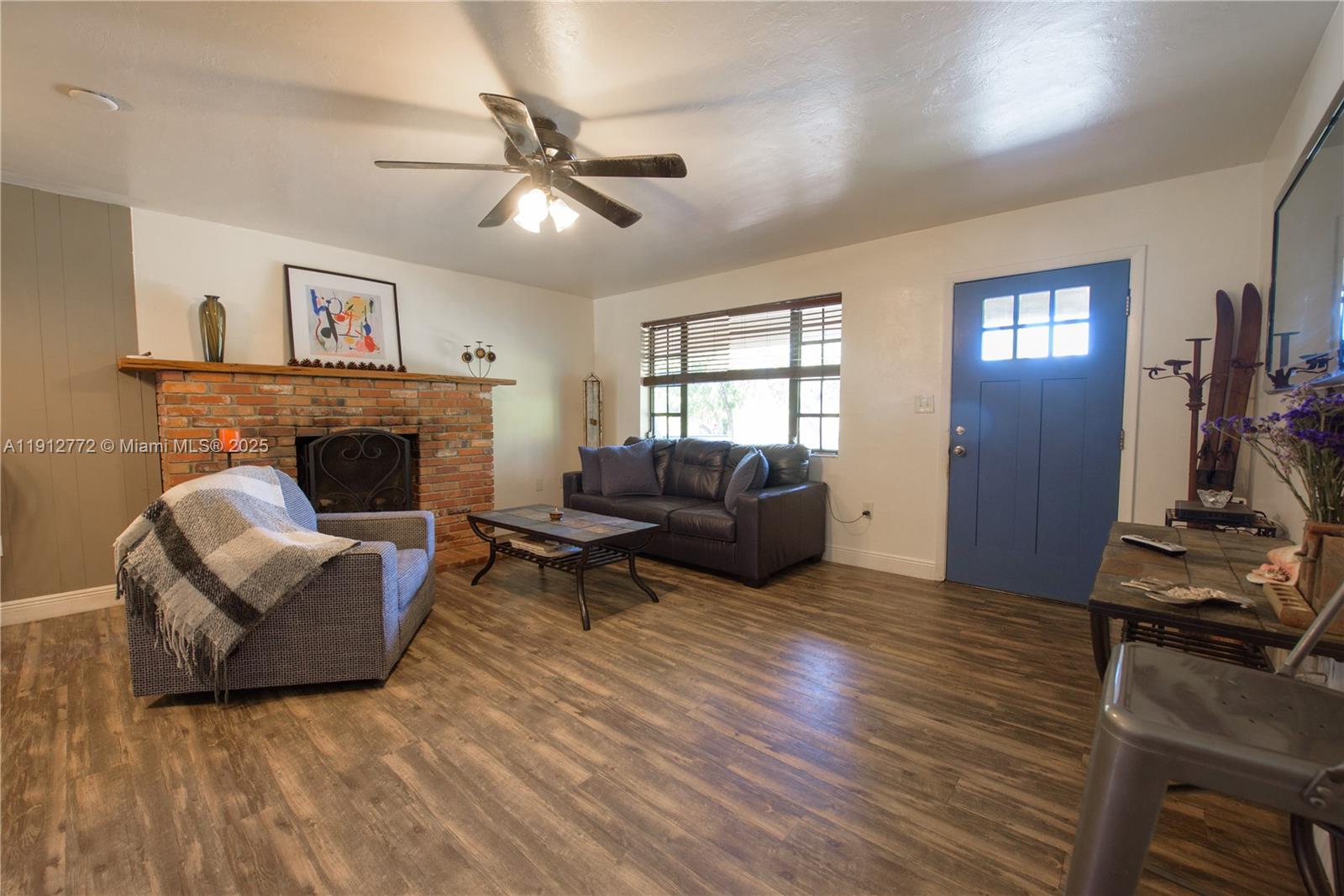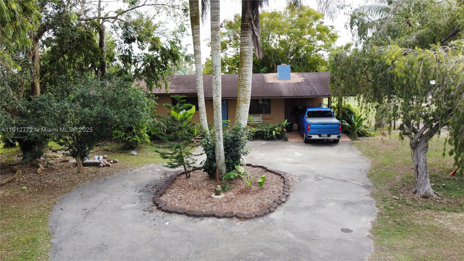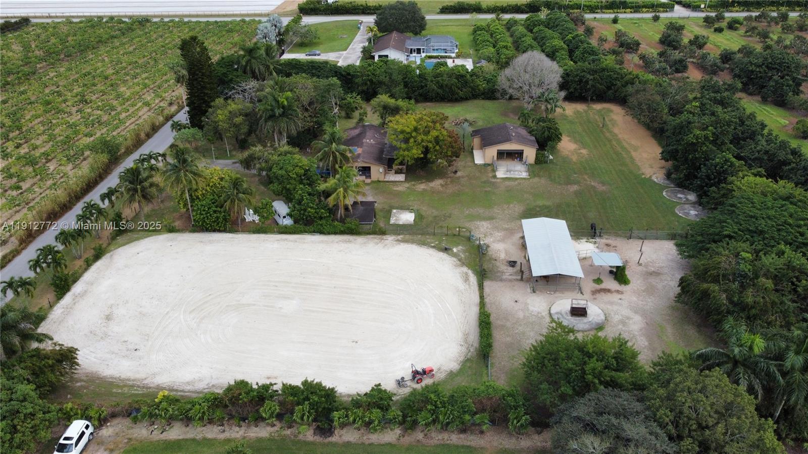 Gorgeous Homestead property! Features laminate & tile floors, fan/lights, blinds, and a cozy wood-burning fireplace in the living room. Elegant dining room with chandelier. Beautiful kitchen with dark wood cabinets, granite counters, stove, fridge & dishwasher. Master bedroom has sliding door, small walk-in closet & shower bath. Additional bedroom with wall-to-wall closet. Laundry room w/ W&D and window. Covered screened patio, carport, pump house with 2024 motor, water softener & storage. Full-size riding ring, metal 4-stall horse setup, detached garage with bathroom. Lush tropical fruit trees throughout—truly stunning! PROOF OF FUNDS AND/OR PRE-APPROVAL LETTER REQUIRED PRIOR TO SCHEDULING A SHOWING OF THE PROPERTY!