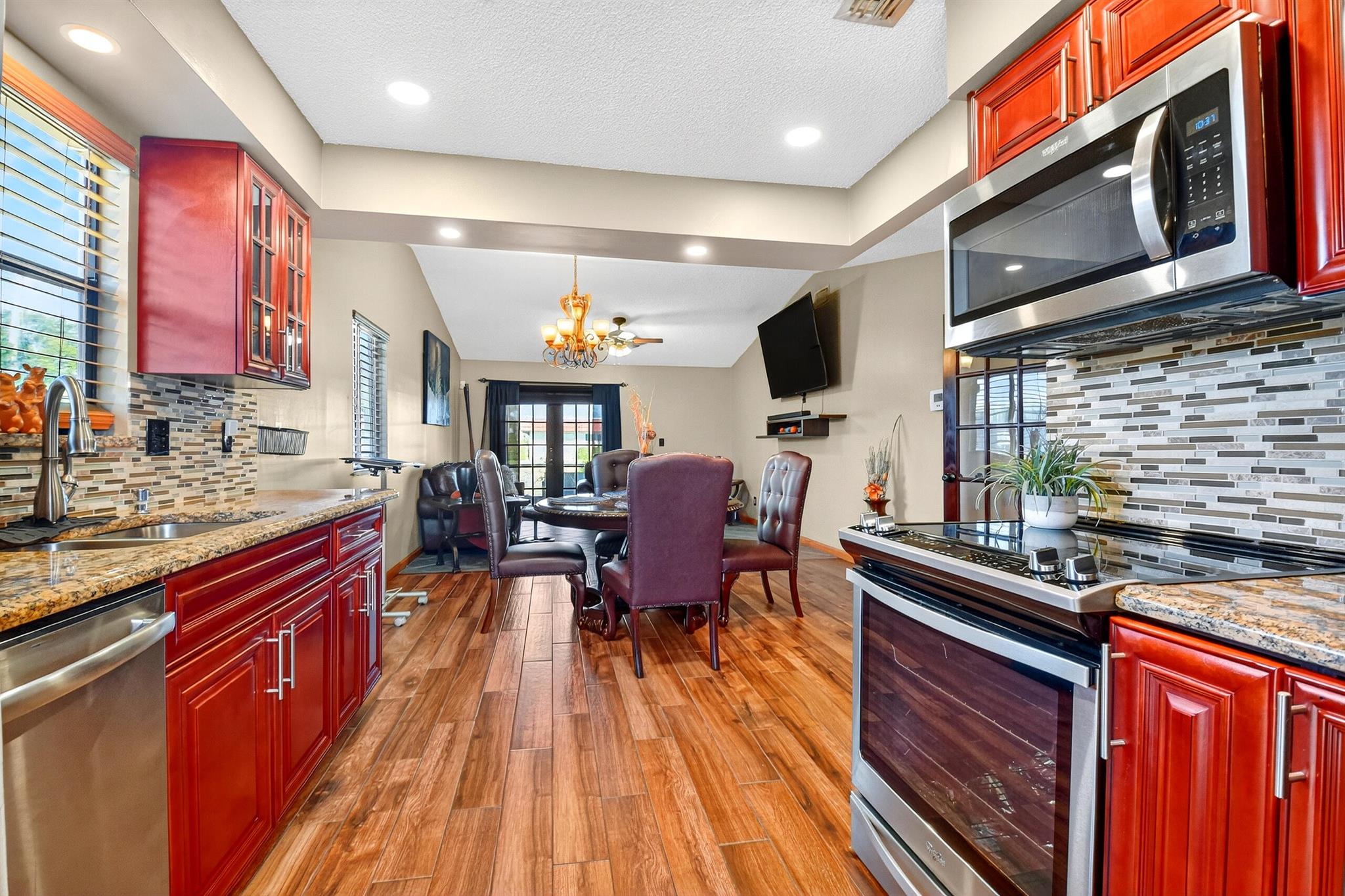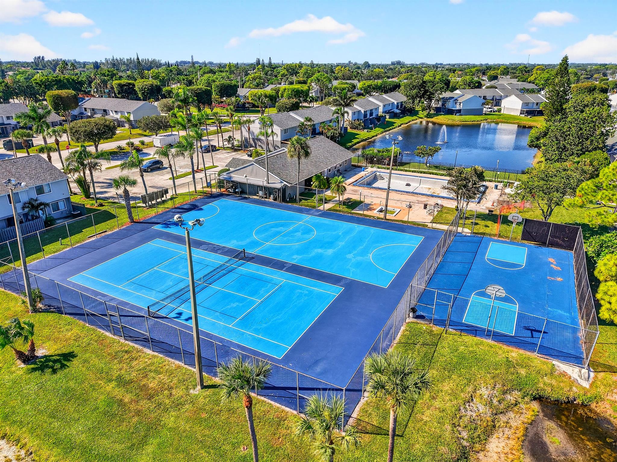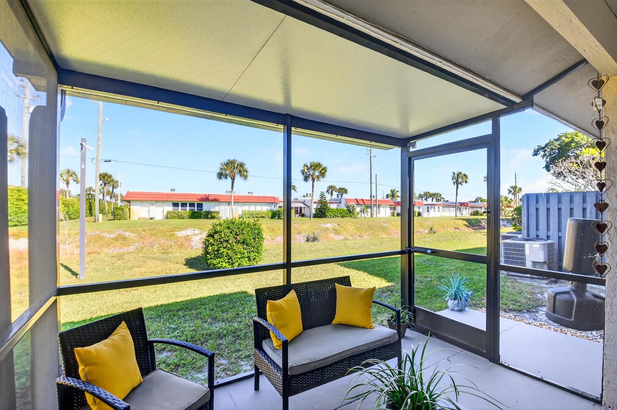 Beautiful upgraded end unit townhouse in centrally located community. As you enter this home, you will notice that it is meticulously maintained and features updated kitchen with high hat lighting, new cabinets and granite counter tops. The kitchen opens into the dining/living space which leads out to the screened patio. This end unit offers added privacy, which is great for entertaining Both bathrooms have been nicely renovated. It is tiled throughout with both bedrooms featuring large closets and ceiling fans. The community offers a pool, which is being renovated, as well as tennis/pickleball courts and a large club house. The unit has a front patio and a back screened in patio. The roof was replaced in 2023. Furniture is negotiable. TVs do not convey.