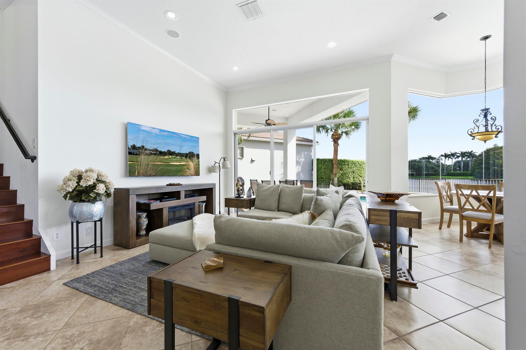 Step into this 4 bedroom plus loft and office/den on a beautiful lake. This extremely light,bright home features a redone kitchen with new cabinets, counter and subway tile backsplash. The stainless steel appliances and island sink have all been updated. The open spaces give you a view of the lake in many rooms in this home. The primary bedroom and another guest suite and office/ den is downstairs . There are 2 guest bedrooms with a jack and Jill full bathroom and a loft for your guests to enjoy upstairs. The backyard has a pool and spa and a lanai looking at the lake where there is a small pier for fishing or just taking in the lake view . There is a grassy area for children or dogs to run. Come see this well cared for, open airy space floorplan for absolute relaxation and enjoyment!!