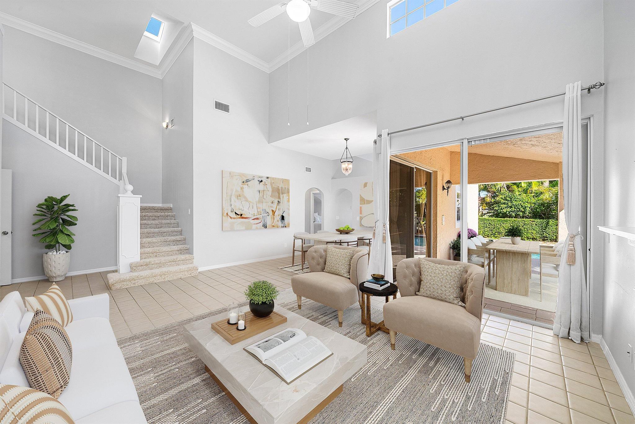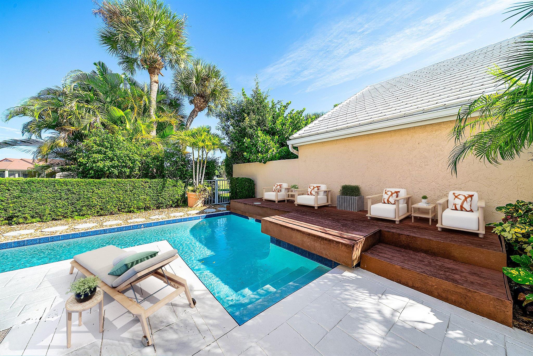 Live the prestigious PGA National lifestyle at the beautiful Barclay Club. Situated on the 15th fairway, enjoy exceptional expansive views of the Fazio golf course and fountain. This spacious single-family home with cathedral ceilings features 3-bedrooms and 2.5-bathrooms with a sunny, south-facing exposure. The living space, kitchen and primary bedroom provide direct access to the resurfaced pool and covered patio spaces for outdoor living and entertaining. Numerous updates throughout, including the roof, kitchen appliances, and plantation shutters. The spotlessly clean 2-car garage includes new Diamond flooring, water heater, and washer/dryer. No membership required. Ideally located in Palm Beach Gardens and close to fine dining, premier shopping and pristine beaches.