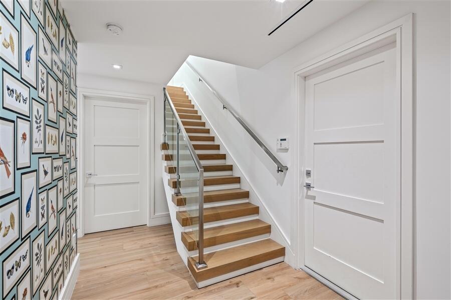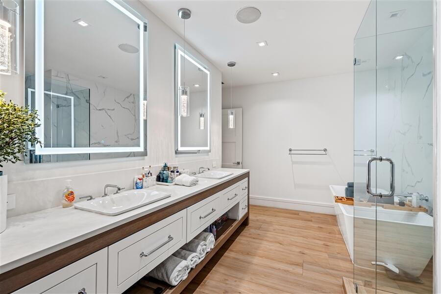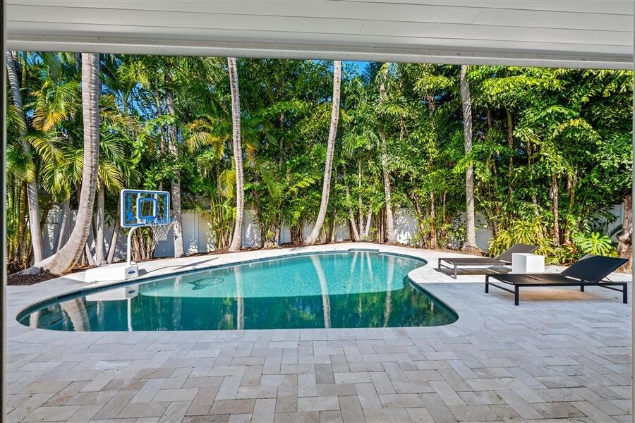 Custom Lake Ida residence, built in 2020, offers privacy at the end of cul-de-sac. Sunlit streamlined interiors showcase a pleasing white-on-white color palette complemented by pale wood-plank flooring and volume ceilings. The open-concept floor plan creates an effortless flow, with all major rooms opening to the lush tropically landscaped pool patio and fully-equipped outdoor kitchen