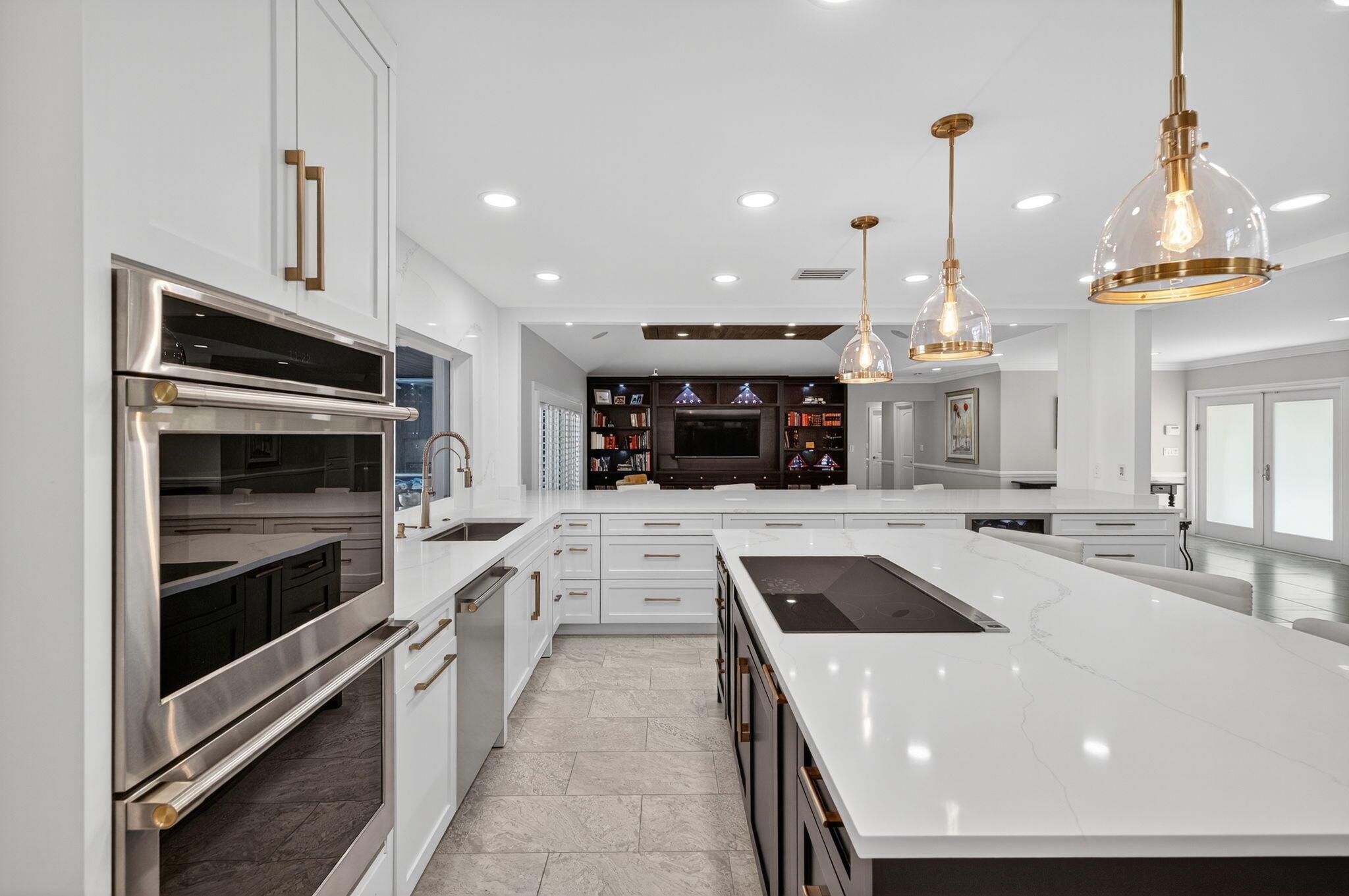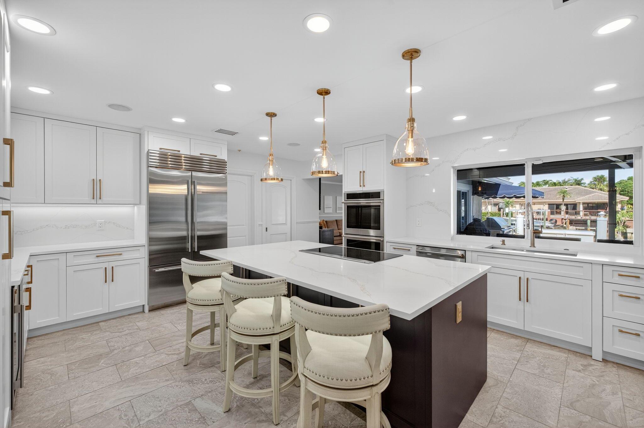 Discover coastal luxury living in this beautifully upgraded single-story ranch home located in the highly sought-after Tropic Isle community of East Boca Raton. Offering over 2,600 sqft of refined living space, this 3-bedroom, 2.5-bath residence blends modern comfort with timeless style, all just moments from the Intracoastal and the best of South Florida living. Step inside to find impact windows and doors throughout, along with a newly designed, chef-inspired kitchen. This stunning space features quartz countertops, an oversized 8-ft center island, champagne bronze hardware, dual beverage coolers, and top-of-the-line appliances, including a Sub-Zero refrigerator and GE Monogram double oven, microwave, and dishwasher. Custom built-ins continue throughout the bedrooms and family room,