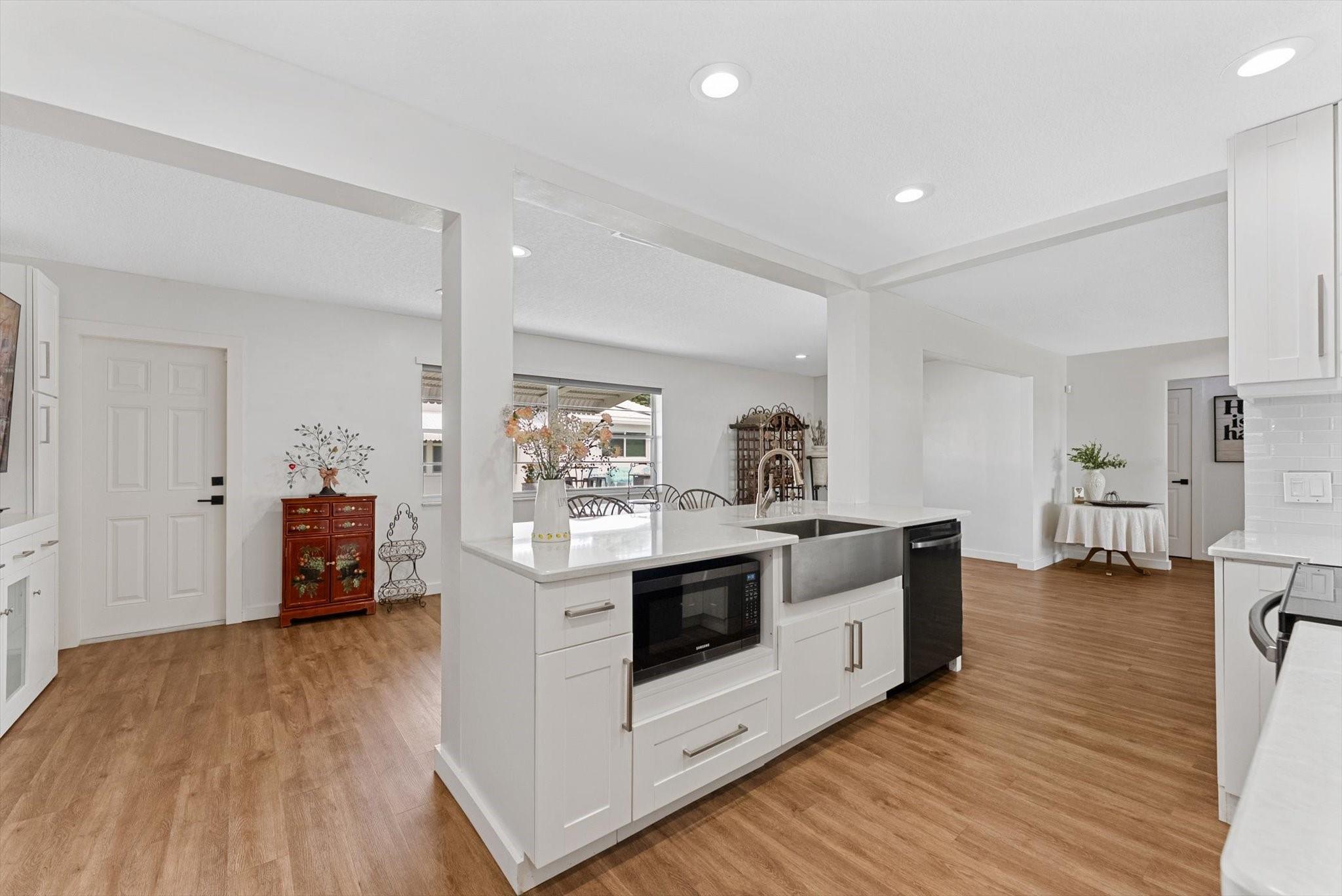 This beautiful Edgewood model has been perfectly & totally updated inside & out. A 2022 metal roof, new fascia boards, rain gutters, additional insulation, impact windows/doors, and a 2023 A/C provide peace of mind & energy efficiency. Charming curb appeal features manicured landscaping & a new oversized driveway. Inside, an open, light-filled design showcases a stunning crisp white kitchen with quartz counters, new appliances, subway tile backsplash, wood-look LVP flooring throughout, and gorgeous new bathrooms. Residents enjoy free golf on the 18-hole course, plus 3 clubhouses, 3 pools, a fitness center, saunas, and more. Low HOA fees include lawn care, exterior painting, and roof cleaning. Maintenance-free living, an active lifestyle, and a like-new home—what could be better?