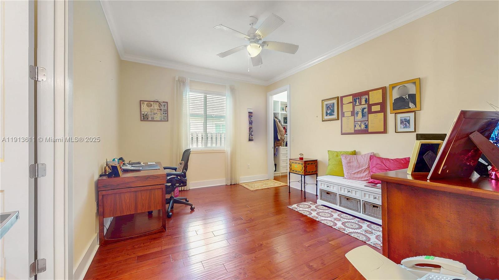 Welcome to your dream home, nestled within the highly sought-after, gated, and guarded community of Oak Ridge! This spacious and luxurious residence features 4 generously sized bedrooms and 4 updated bathrooms. The main living areas showcase elegant porcelain floors, while the bedrooms offer comfortable wood-like flooring. You will love the modern kitchen, complete with a large island, sleek quartz countertops, and stunning custom cabinets. Architectural details abound, including crown molding throughout, a sophisticated tray ceiling in the living area and primary suite, and the security of impact windows and doors. Step outside to your private oasis, featuring a spacious yard that is perfect for adding a pool and creating the ultimate outdoor entertaining space.