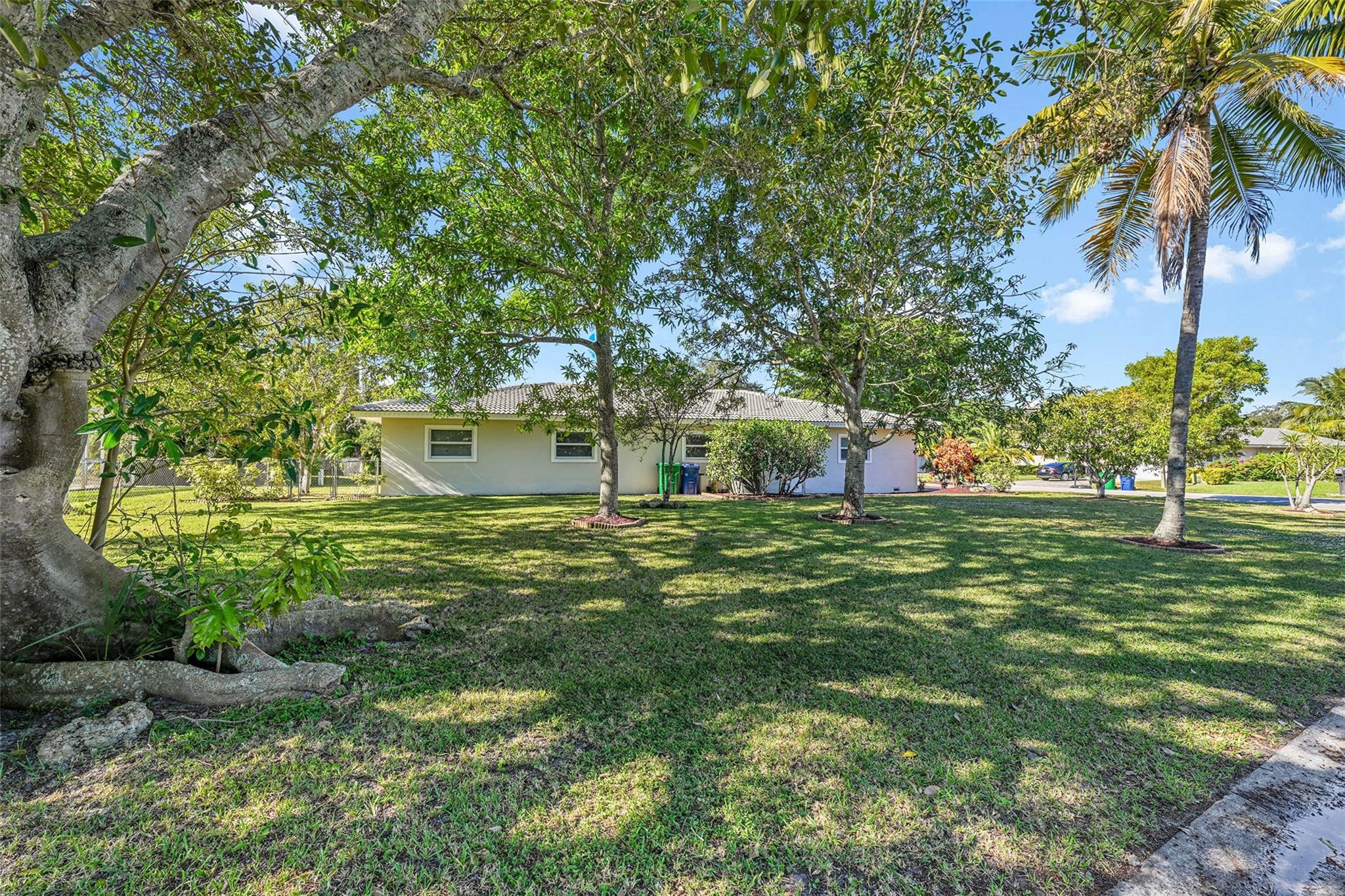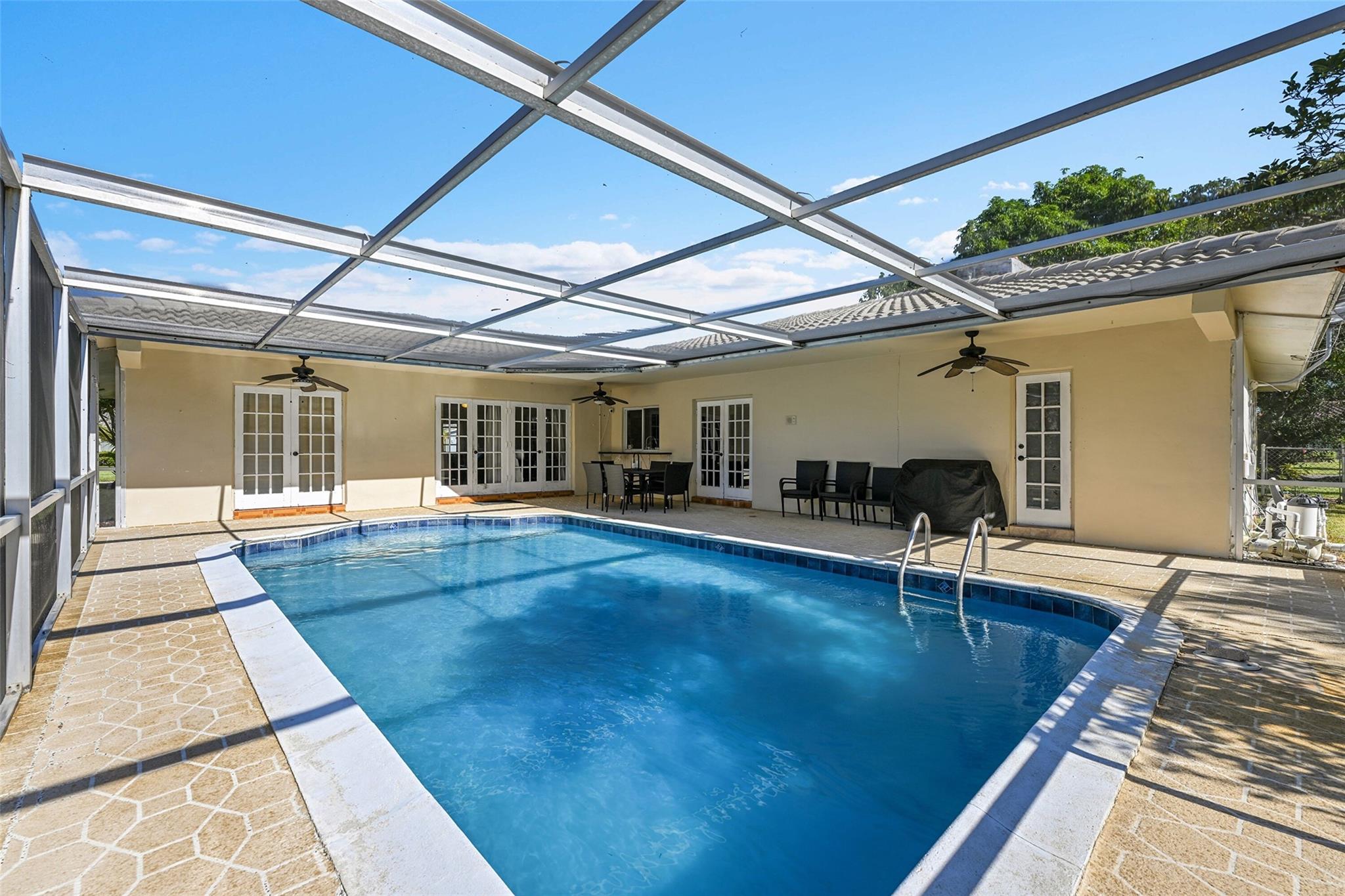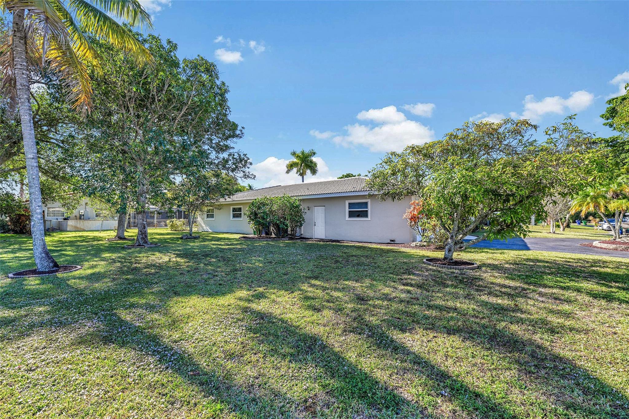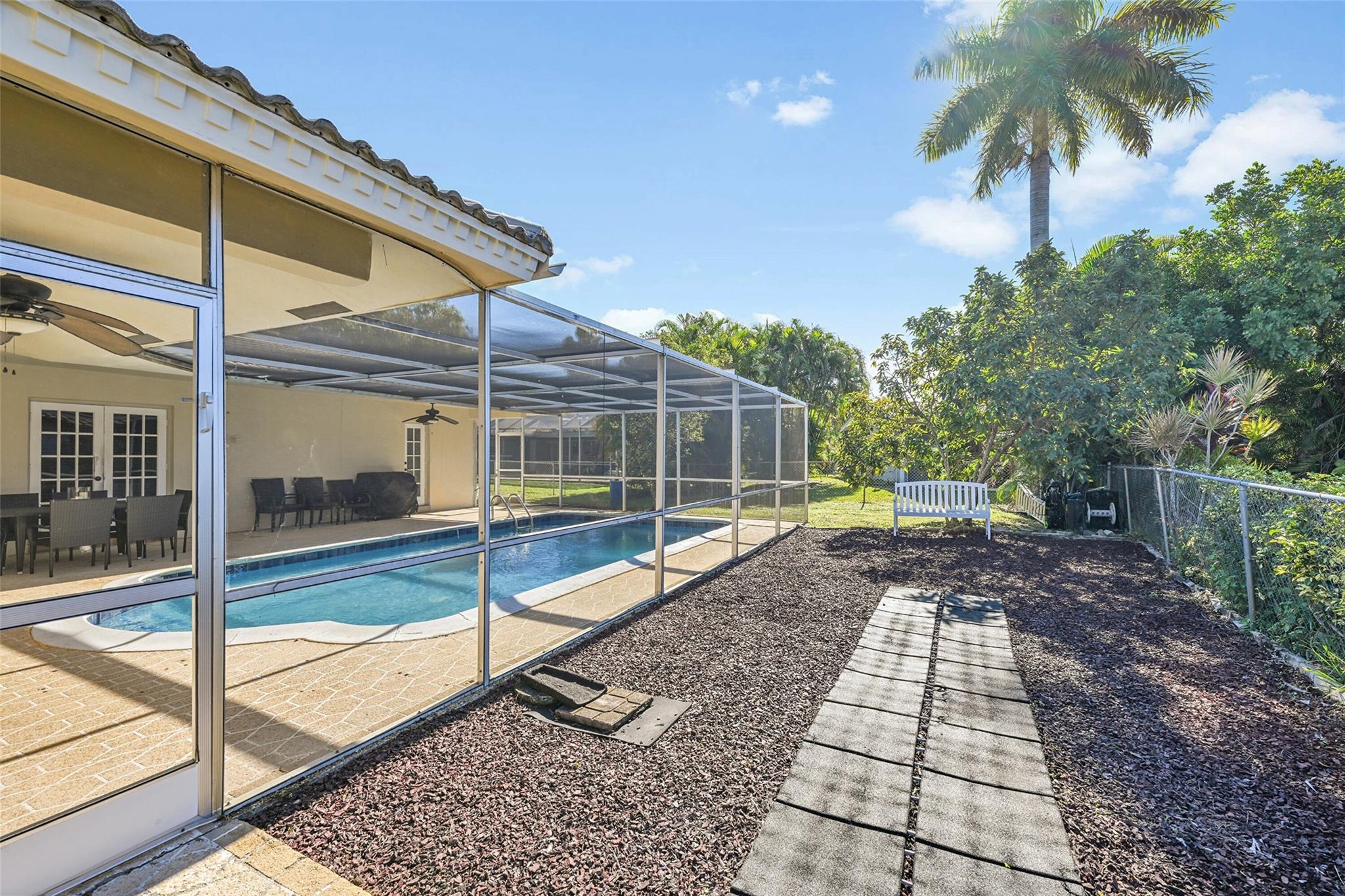 Spacious 4BR/2BA single-family home on an OVERSIZED CORNER LOT over a quarter acre—perfect for a large family seeking space and comfort. This home features a bright split floor plan with tile and laminate flooring, French doors, and a warm, inviting family room centered around a charming brick fireplace. The kitchen offers granite countertops, stainless-steel appliances. Step outside to an expansive fenced yard with mature mango trees and a screen-enclosed pool, ideal for gatherings, relaxing weekends, and year-round outdoor fun. The property also includes a 2-car garage and a circular driveway that provides EXTENSIVE parking for family and guests. Located in a welcoming, family-friendly neighborhood with NO HOA, offering freedom, privacy and convenience close to parks and schools.