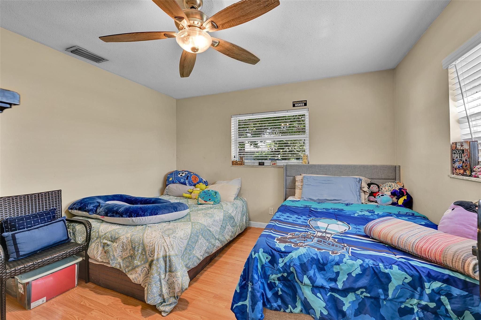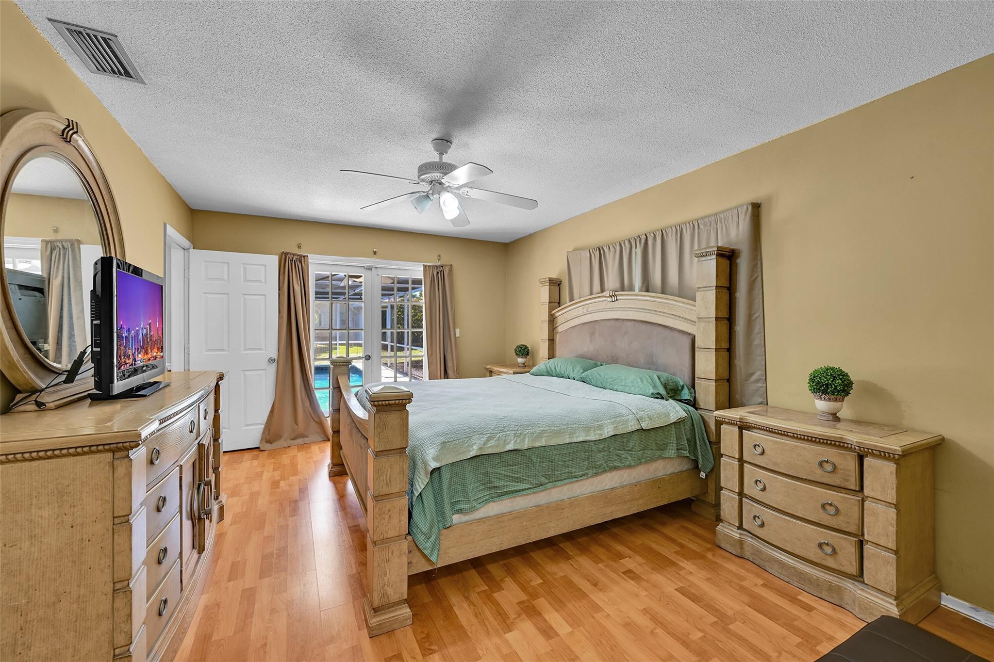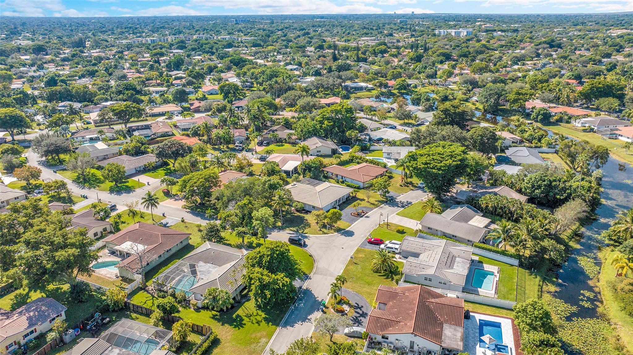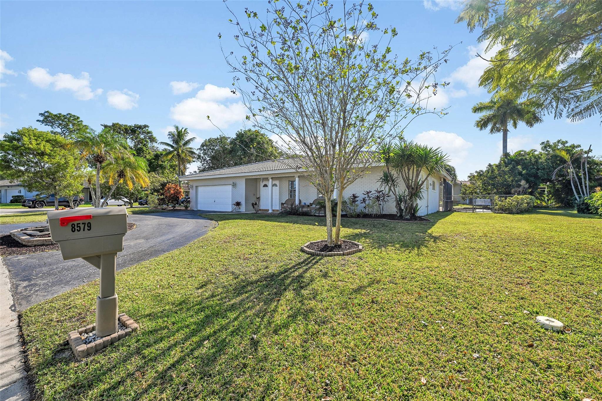 Spacious 4BR/2BA single-family home on an OVERSIZED CORNER LOT over a quarter acre—perfect for a large family seeking space and comfort. This home features a bright split floor plan with tile and laminate flooring, French doors, and a warm, inviting family room centered around a charming brick fireplace. The kitchen offers granite countertops, stainless-steel appliances. Step outside to an expansive fenced yard with mature mango trees and a screen-enclosed pool, ideal for gatherings, relaxing weekends, and year-round outdoor fun. The property also includes a 2-car garage and a circular driveway that provides EXTENSIVE parking for family and guests. Located in a welcoming, family-friendly neighborhood with NO HOA, offering freedom, privacy and convenience close to parks and schools.