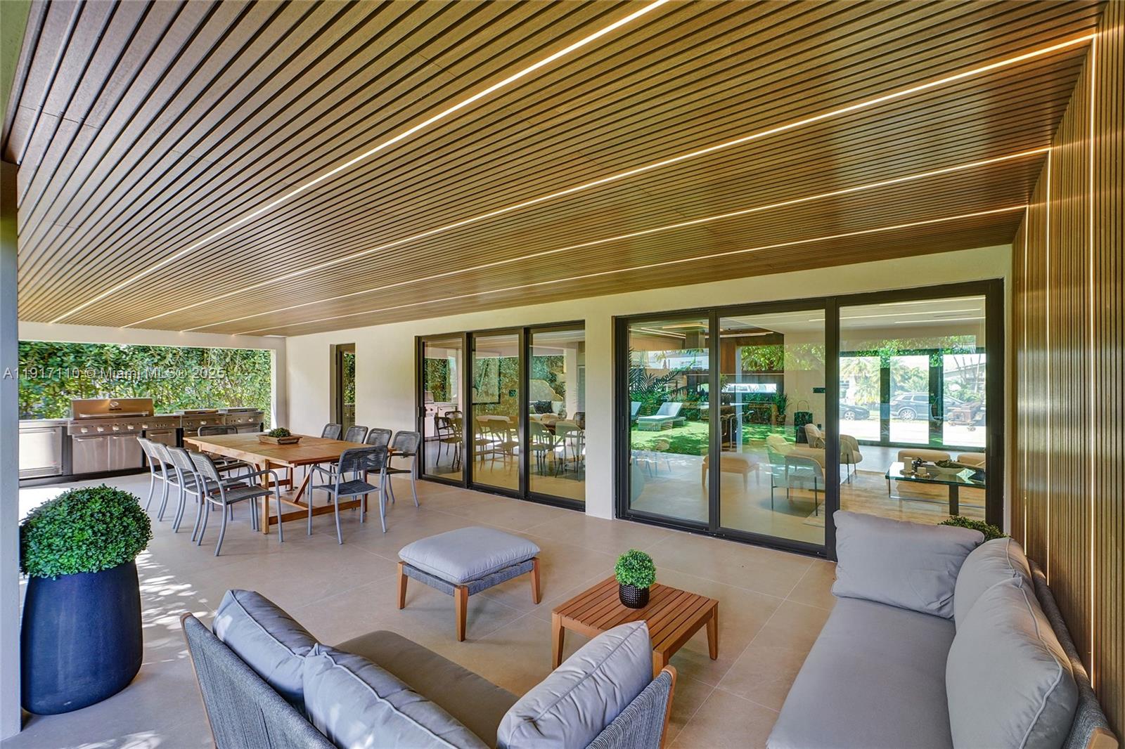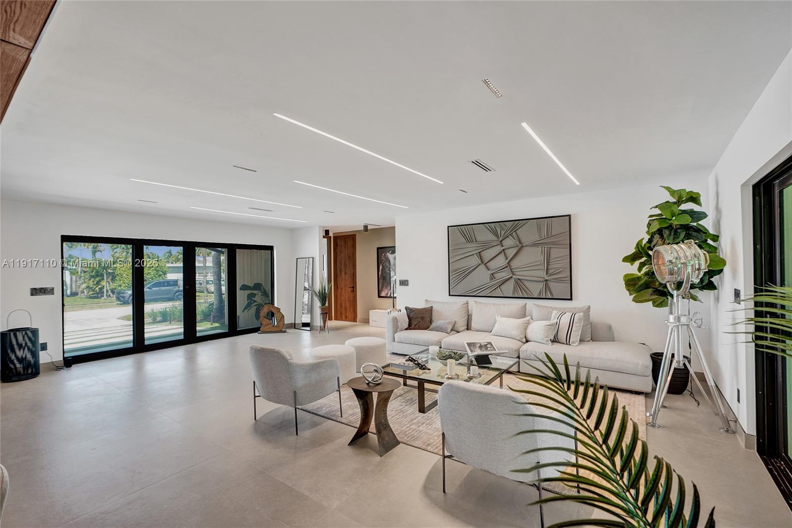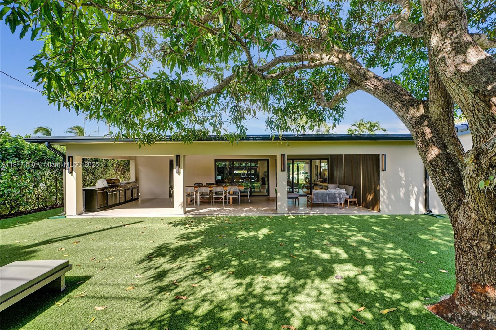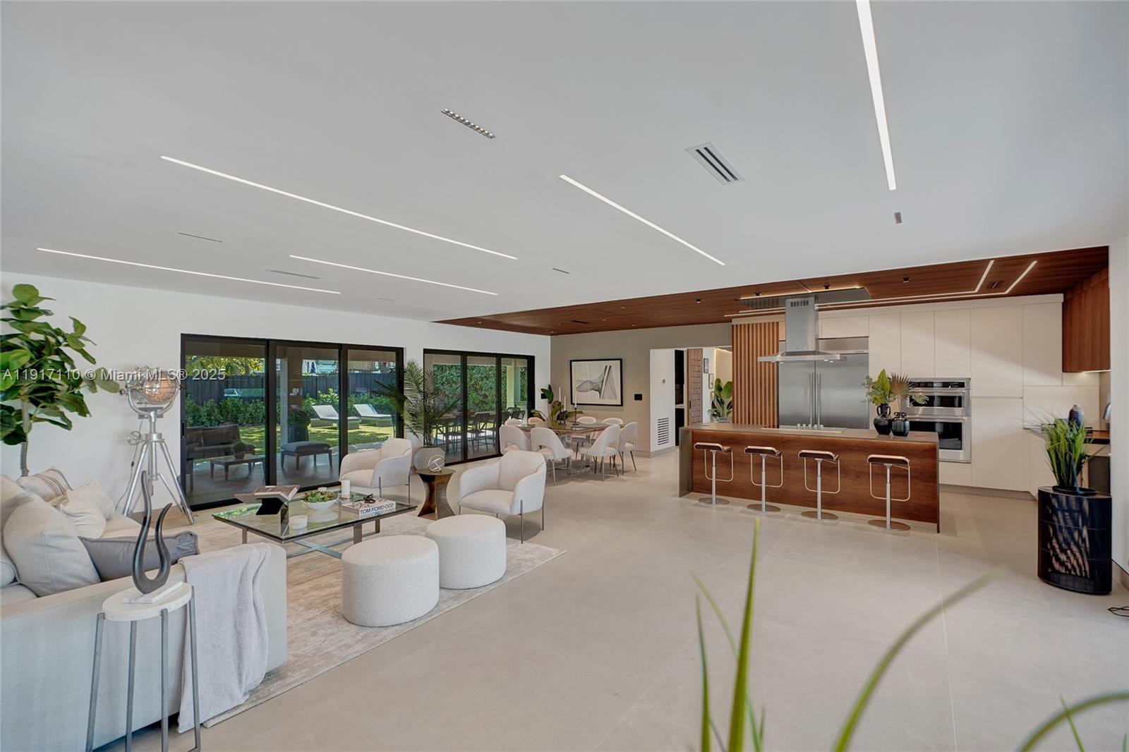 Stunning, fully remodeled modern home featuring clean architectural lines, warm natural tones, and top-quality finishes throughout. The open-concept layout highlights a sleek Italian-style kitchen with custom wood cabinetry, quartz countertops, and top-of-the-line appliances, including stainless steel appliances. This elegant residence features impact-resistant windows and doors, Italian-built-in closets, large porcelain floors, high ceilings, and designer LED lighting. The spacious living and dining areas are surrounded by glass sliders that fill the home with natural light and create a perfect indoor-outdoor flow. The outdoor space is designed for entertaining, featuring a built-in BBQ, artificial grass, and beautifully landscaped gardens. Every detail combines luxury and functionality